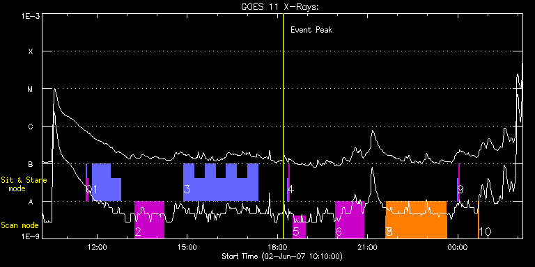EIS Observation timeline overlay to GOES-Xray curve Code 1" 2" 40" 266" EIS Observations list for this event: STUDY ACRONYM ID DATE OBSERVED DESCRIPTION NOAA# TARGET 0 SYNOP001 | 3004 | 2007/06/02 11:37:20 | SYNOP001_40arcsec_1arcsec_30s_90s | | Quiet Sun TIMELINE ID DATE OBSERVED FITS FILE XCEN (+W/-E) YCEN (+N/-S) DUR ----------------------------------------------------------------------------------------------------------------- 3004 | 2007/06/02 11:37:20.000 | eis_l0_20070602_113720.fits.gz | 0.52 | 45.69 | 2m1s 3004 | 2007/06/02 11:39:35.000 | eis_l0_20070602_113935.fits.gz | 0.48 | 45.67 | 2m1s 1 cam_artb_cds_b | 3005 | 2007/06/02 11:50:34 | Active Region Transient Brightenings ( | | Active Region TIMELINE ID DATE OBSERVED FITS FILE XCEN (+W/-E) YCEN (+N/-S) DUR ----------------------------------------------------------------------------------------------------------------- 3005 | 2007/06/02 11:50:34.000 | eis_l0_20070602_115034.fits.gz | 0.18 | -68.63 | 35m19s 3005 | 2007/06/02 12:25:56.000 | eis_l0_20070602_122556.fits.gz | 0.43 | -68.45 | 21m10s 2 HPW008_FULLCCD_RAST | 3006 | 2007/06/02 13:15:20 | HPW008_FULLCCD_RAST_128x128_25s_SLIT1 | | Active Region TIMELINE ID DATE OBSERVED FITS FILE XCEN (+W/-E) YCEN (+N/-S) DUR ----------------------------------------------------------------------------------------------------------------- 3006 | 2007/06/02 13:15:20.000 | eis_l0_20070602_131520.fits.gz | 1.19 | -86.09 | 57m49s 3 cam_artb_cds_b | 3007 | 2007/06/02 14:52:34 | Active Region Transient Brightenings ( | | Active Region TIMELINE ID DATE OBSERVED FITS FILE XCEN (+W/-E) YCEN (+N/-S) DUR ----------------------------------------------------------------------------------------------------------------- 3007 | 2007/06/02 14:52:34.000 | eis_l0_20070602_145234.fits.gz | 0.49 | -68.42 | 21m10s 3007 | 2007/06/02 15:13:47.000 | eis_l0_20070602_151347.fits.gz | 0.43 | -68.47 | 21m10s 3007 | 2007/06/02 15:35:00.000 | eis_l0_20070602_153500.fits.gz | 0.46 | -68.47 | 21m11s 3007 | 2007/06/02 15:56:14.000 | eis_l0_20070602_155614.fits.gz | 0.43 | -68.50 | 21m10s 3007 | 2007/06/02 16:17:27.000 | eis_l0_20070602_161727.fits.gz | 4.52 | -66.42 | 21m10s 3007 | 2007/06/02 16:38:41.000 | eis_l0_20070602_163841.fits.gz | 0.44 | -68.50 | 21m10s 3007 | 2007/06/02 16:59:54.000 | eis_l0_20070602_165954.fits.gz | 0.45 | -68.56 | 21m10s 4 SYNOP001 | 3008 | 2007/06/02 18:19:42 | SYNOP001_40arcsec_1arcsec_30s_90s | | Quiet Sun TIMELINE ID DATE OBSERVED FITS FILE XCEN (+W/-E) YCEN (+N/-S) DUR ----------------------------------------------------------------------------------------------------------------- 3008 | 2007/06/02 18:19:42.000 | eis_l0_20070602_181942.fits.gz | 0.39 | 45.65 | 2m2s 3008 | 2007/06/02 18:21:58.000 | eis_l0_20070602_182158.fits.gz | 0.40 | 45.52 | 2m1s 5 HH_AR+FLR_RAS_N01 | 3009 | 2007/06/02 18:30:12 | HH_AR+FLR_RAS_N01 (EWxNS=240"x240", 5. | | Active Region TIMELINE ID DATE OBSERVED FITS FILE XCEN (+W/-E) YCEN (+N/-S) DUR ----------------------------------------------------------------------------------------------------------------- 3009 | 2007/06/02 18:30:12.000 | eis_l0_20070602_183012.fits.gz | -857.64 | -452.68 | 26m17s 6 HPW008_FULLCCD_RAST | 3010 | 2007/06/02 19:56:12 | HPW008_FULLCCD_RAST_128x128_25s_SLIT1 | | Active Region TIMELINE ID DATE OBSERVED FITS FILE XCEN (+W/-E) YCEN (+N/-S) DUR ----------------------------------------------------------------------------------------------------------------- 3010 | 2007/06/02 19:56:12.000 | eis_l0_20070602_195612.fits.gz | -851.43 | -477.58 | 56m40s 7 SK_AR2_50x240p | 3011 | 2007/06/02 21:35:27 | SK_AR2_50x240p | | Active Region TIMELINE ID DATE OBSERVED FITS FILE XCEN (+W/-E) YCEN (+N/-S) DUR ----------------------------------------------------------------------------------------------------------------- 3011 | 2007/06/02 21:35:27.000 | eis_l0_20070602_213527.fits.gz | -579.88 | -329.18 | 1m28s 8 SK_AR2_8x200p | 3012 | 2007/06/02 21:37:42 | SK_AR2_8x200p | | Active Region TIMELINE ID DATE OBSERVED FITS FILE XCEN (+W/-E) YCEN (+N/-S) DUR ----------------------------------------------------------------------------------------------------------------- 3012 | 2007/06/02 21:37:42.000 | eis_l0_20070602_213742.fits.gz | -579.64 | -339.05 | 11s 3012 | 2007/06/02 21:37:56.000 | eis_l0_20070602_213756.fits.gz | -579.68 | -339.13 | 10s 3012 | 2007/06/02 21:38:09.000 | eis_l0_20070602_213809.fits.gz | -579.61 | -339.10 | 11s 3012 | 2007/06/02 21:38:23.000 | eis_l0_20070602_213823.fits.gz | -579.56 | -339.03 | 11s 3012 | 2007/06/02 21:38:36.000 | eis_l0_20070602_213836.fits.gz | -579.54 | -339.06 | 11s 3012 | 2007/06/02 21:38:50.000 | eis_l0_20070602_213850.fits.gz | -579.52 | -339.12 | 11s 3012 | 2007/06/02 21:39:04.000 | eis_l0_20070602_213904.fits.gz | -579.55 | -339.11 | 11s 3012 | 2007/06/02 21:39:17.000 | eis_l0_20070602_213917.fits.gz | -579.46 | -339.02 | 11s 3012 | 2007/06/02 21:39:31.000 | eis_l0_20070602_213931.fits.gz | -579.45 | -339.02 | 11s 3012 | 2007/06/02 21:39:45.000 | eis_l0_20070602_213945.fits.gz | -579.41 | -339.00 | 11s 3012 | 2007/06/02 21:39:58.000 | eis_l0_20070602_213958.fits.gz | -579.41 | -339.00 | 11s 3012 | 2007/06/02 21:40:12.000 | eis_l0_20070602_214012.fits.gz | -579.40 | -339.02 | 11s 3012 | 2007/06/02 21:40:26.000 | eis_l0_20070602_214026.fits.gz | -579.33 | -339.00 | 10s 3012 | 2007/06/02 21:40:39.000 | eis_l0_20070602_214039.fits.gz | -579.33 | -339.00 | 11s 3012 | 2007/06/02 21:40:53.000 | eis_l0_20070602_214053.fits.gz | -579.26 | -338.97 | 10s 3012 | 2007/06/02 21:41:06.000 | eis_l0_20070602_214106.fits.gz | -579.39 | -338.99 | 11s 3012 | 2007/06/02 21:41:20.000 | eis_l0_20070602_214120.fits.gz | -579.25 | -338.94 | 10s 3012 | 2007/06/02 21:41:33.000 | eis_l0_20070602_214133.fits.gz | -579.24 | -338.92 | 11s 3012 | 2007/06/02 21:41:47.000 | eis_l0_20070602_214147.fits.gz | -579.24 | -338.96 | 11s 3012 | 2007/06/02 21:42:00.000 | eis_l0_20070602_214200.fits.gz | -579.19 | -338.84 | 11s 3012 | 2007/06/02 21:42:14