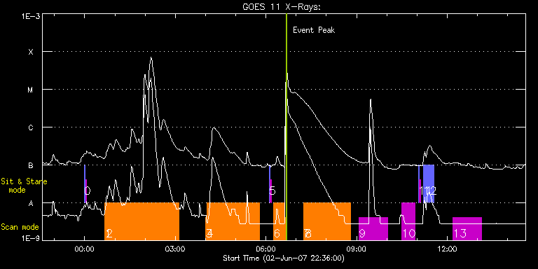 EIS Observation timeline overlay to GOES-Xray curve Code 1" 2" 40" 266" EIS Observations list for this event: STUDY ACRONYM ID DATE OBSERVED DESCRIPTION NOAA# TARGET 0 SYNOP001 | 3013 | 2007/06/02 23:59:20 | SYNOP001_40arcsec_1arcsec_30s_90s | | Quiet Sun TIMELINE ID DATE OBSERVED FITS FILE XCEN (+W/-E) YCEN (+N/-S) DUR ----------------------------------------------------------------------------------------------------------------- 3013 | 2007/06/02 23:59:20.000 | eis_l0_20070602_235920.fits.gz | 0.48 | 45.63 | 2m1s 3013 | 2007/06/03 00:01:35.000 | eis_l0_20070603_000135.fits.gz | 0.44 | 45.61 | 2m1s 1 SK_AR2_50x240p | 3014 | 2007/06/03 00:40:26 | SK_AR2_50x240p | | Active Region TIMELINE ID DATE OBSERVED FITS FILE XCEN (+W/-E) YCEN (+N/-S) DUR ----------------------------------------------------------------------------------------------------------------- 3014 | 2007/06/03 00:40:26.000 | eis_l0_20070603_004026.fits.gz | -863.76 | -441.37 | 1m28s 2 SK_AR2_8x200p | 3015 | 2007/06/03 00:42:42 | SK_AR2_8x200p | | Active Region TIMELINE ID DATE OBSERVED FITS FILE XCEN (+W/-E) YCEN (+N/-S) DUR ----------------------------------------------------------------------------------------------------------------- 3015 | 2007/06/03 00:42:42.000 | eis_l0_20070603_004242.fits.gz | -863.62 | -451.35 | 11s 3015 | 2007/06/03 00:42:56.000 | eis_l0_20070603_004256.fits.gz | -863.66 | -451.31 | 11s 3015 | 2007/06/03 00:43:09.000 | eis_l0_20070603_004309.fits.gz | -863.64 | -451.33 | 11s 3015 | 2007/06/03 00:43:23.000 | eis_l0_20070603_004323.fits.gz | -863.59 | -451.24 | 11s 3015 | 2007/06/03 00:43:36.000 | eis_l0_20070603_004336.fits.gz | -863.60 | -451.28 | 11s 3015 | 2007/06/03 00:43:50.000 | eis_l0_20070603_004350.fits.gz | -863.59 | -451.26 | 11s 3015 | 2007/06/03 00:44:04.000 | eis_l0_20070603_004404.fits.gz | -863.64 | -451.29 | 11s 3015 | 2007/06/03 00:44:17.000 | eis_l0_20070603_004417.fits.gz | -863.57 | -451.30 | 11s 3015 | 2007/06/03 00:44:31.000 | eis_l0_20070603_004431.fits.gz | -863.54 | -451.25 | 11s 3015 | 2007/06/03 00:44:45.000 | eis_l0_20070603_004445.fits.gz | -863.50 | -451.28 | 10s 3015 | 2007/06/03 00:44:58.000 | eis_l0_20070603_004458.fits.gz | -863.50 | -451.23 | 11s 3015 | 2007/06/03 00:45:12.000 | eis_l0_20070603_004512.fits.gz | -863.50 | -451.23 | 11s 3015 | 2007/06/03 00:45:25.000 | eis_l0_20070603_004525.fits.gz | -863.50 | -451.26 | 11s 3015 | 2007/06/03 00:45:39.000 | eis_l0_20070603_004539.fits.gz | -863.45 | -451.21 | 11s 3015 | 2007/06/03 00:45:53.000 | eis_l0_20070603_004553.fits.gz | -863.52 | -451.24 | 11s 3015 | 2007/06/03 00:46:06.000 | eis_l0_20070603_004606.fits.gz | -863.45 | -451.14 | 11s 3015 | 2007/06/03 00:46:20.000 | eis_l0_20070603_004620.fits.gz | -863.48 | -451.24 | 11s 3015 | 2007/06/03 00:46:34.000 | eis_l0_20070603_004634.fits.gz | -863.37 | -451.19 | 11s 3015 | 2007/06/03 00:46:47.000 | eis_l0_20070603_004647.fits.gz | -863.41 | -451.19 | 11s 3015 | 2007/06/03 00:47:01.000 | eis_l0_20070603_004701.fits.gz | -863.43 | -451.20 | 11s 3015 | 2007/06/03 00:47:15.000 | eis_l0_20070603_004715.fits.gz | -863.41 | -451.18 | 10s 3015 | 2007/06/03 00:47:28.000 | eis_l0_20070603_004728.fits.gz | -863.34 | -451.22 | 11s 3015 | 2007/06/03 00:47:42.000 | eis_l0_20070603_004742.fits.gz | -863.35 | -451.17 | 11s 3015 | 2007/06/03 00:47:56.000 | eis_l0_20070603_004756.fits.gz | -863.41 | -451.19 | 10s 3015 | 2007/06/03 00:48:09.000 | eis_l0_20070603_004809.fits.gz | -863.34 | -451.15 | 11s 3015 | 2007/06/03 00:48:23.000 | eis_l0_20070603_004823.fits.gz | -863.27 | -451.19 | 11s 3015 | 2007/06/03 00:48:36.000 | eis_l0_20070603_004836.fits.gz | -863.28 | -451.13 | 11s 3015 | 2007/06/03 00:48:50.000 | eis_l0_20070603_004850.fits.gz | -863.26 | -451.16 | 11s 3015 | 2007/06/03 00:49:04.000 | eis_l0_20070603_004904.fits.gz | -863.32 | -451.13 | 11s 3015 | 2007/06/03 00:49:17.000 | eis_l0_20070603_004917.fits.gz | -863.31 | -451.13 | 11s 3015 | 2007/06/03 00:49:31.000 | eis_l0_20070603_004931.fits.gz | -863.34 | -451.07 | 11s 3015 | 2007/06/03 00:49:44.000 | eis_l0_20070603_004944.fits.gz | -863.17 | -451.13 | 11s 3015 | 2007/06/03 00:49:58.000 | eis_l0_20070603_004958.fits.gz | -863.29 | -451.15 | 11s 3015 | 2007/06/03 00:50:11.000 | eis_l0_20070603_005011.fits.gz | -863.25 | -451.10 | 11s 3015 | 2007/06/03 00:50:25.000 | eis_l0_20070603_005025.fits.gz | -863.21 | -451.12 | 11s 3015 | 2007/06/03 00:50:39.000 | eis_l0_20070603_005039.fits.gz | -863.16 | -451.05 | 11s 3015 | 2007/06/03 00:50:53.000 | eis_l0_20070603_005053.fits.gz | -863.19 | -451.07 | 11s 3015 | 2007/06/03 00:51:06.000 | eis_l0_20070603_005106.fits.gz | -863.20 | -451.03 | 11s 3015 | 2007/06/03 00:51:20.000 | eis_l0_20070603_005120.fits.gz | -863.16 | -451.07 | 11s 3015 | 2007/06/03 00:51:34.000 | eis_l0_20070603_005134.fits.gz | -863.14 | -451.04 | 10s 3015 | 2007/06/03 00:51:47.000 | eis_l0_20070603_005147.fits.gz | -863.14 | -451.05 | 11s 3015 | 2007/06/03 00:52:01.000 | eis_l0_20070603_005201.fits.gz | -863.09 | -451.02 | 10s 3015 | 2007/06/03 00:52:14.000 | eis_l0_20070603_005214.fits.gz | -863.11 | -451.04 | 11s 3015 | 2007/06/03 00:52:28.000 | eis_l0_20070603_005228.fits.gz | -863.06 | -451.01 | 10s 3015 | 2007/06/03 00:52:41.000 | eis_l0_20070603_005241.fits.gz | -863.06 | -451.02 | 11s 3015 | 2007/06/03 00:52:55.000 | eis_l0_20070603_005255.fits.gz | -863.08 | -451.02 | 11s 3015 | 2007/06/03 00:53:09.000 | eis_l0_20070603_005309.fits.gz | -863.12 | -451.04 | 11s 3015 | 2007/06/03 00:53:22.000 | eis_l0_20070603_005322.fits.gz | -863.06 | -451.01 | 11s 3015 | 2007/06/03 00:53:36.000 | eis_l0_20070603_005336.fits.gz | -863.01 | -450.96 | 11s 3015 | 2007/06/03 00:53:49.000 | eis_l0_20070603_005349.fits.gz | -863.05 | -451.00 | 11s 3015 | 2007/06/03 00:54:03.000 | eis_l0_20070603_005403.fits.gz | -862.98 | -450.97 | 11s 3015 | 2007/06/03 00:54:17.000 | eis_l0_20070603_005417.fits.gz | -862.98 | -450.93 | 11s 3015 | 2007/06/03 00:54:31.000 | eis_l0_20070603_005431.fits.gz | -862.97 | -450.96 | 10s 3015 | 200