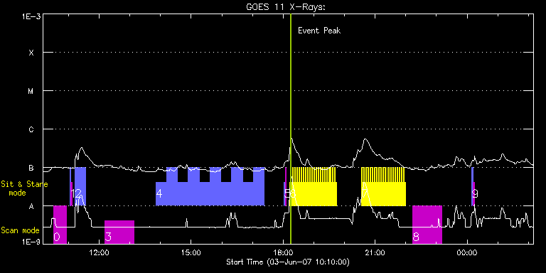 EIS Observation timeline overlay to GOES-Xray curve Code 1" 2" 40" 266" EIS Observations list for this event: STUDY ACRONYM ID DATE OBSERVED DESCRIPTION NOAA# TARGET 0 HH_AR+FLR_RAS_N01 | 3023 | 2007/06/03 10:30:12 | HH_AR+FLR_RAS_N01 (EWxNS=240"x240", 5. | | Active Region TIMELINE ID DATE OBSERVED FITS FILE XCEN (+W/-E) YCEN (+N/-S) DUR ----------------------------------------------------------------------------------------------------------------- 3023 | 2007/06/03 10:30:12.000 | eis_l0_20070603_103012.fits.gz | -789.54 | -418.37 | 26m17s 1 SYNOP001 | 3024 | 2007/06/03 11:02:33 | SYNOP001_40arcsec_1arcsec_30s_90s | | Quiet Sun TIMELINE ID DATE OBSERVED FITS FILE XCEN (+W/-E) YCEN (+N/-S) DUR ----------------------------------------------------------------------------------------------------------------- 3024 | 2007/06/03 11:02:33.000 | eis_l0_20070603_110233.fits.gz | 0.42 | 45.65 | 2m2s 3024 | 2007/06/03 11:04:49.000 | eis_l0_20070603_110449.fits.gz | 0.40 | 45.63 | 2m1s 2 cam_artb_cds_b | 3025 | 2007/06/03 11:12:33 | Active Region Transient Brightenings ( | | Active Region TIMELINE ID DATE OBSERVED FITS FILE XCEN (+W/-E) YCEN (+N/-S) DUR ----------------------------------------------------------------------------------------------------------------- 3025 | 2007/06/03 11:12:33.000 | eis_l0_20070603_111233.fits.gz | 0.47 | -68.47 | 21m10s 3 HPW008_FULLCCD_RAST | 3026 | 2007/06/03 12:11:19 | HPW008_FULLCCD_RAST_128x128_25s_SLIT1 | 958 | Active Region TIMELINE ID DATE OBSERVED FITS FILE XCEN (+W/-E) YCEN (+N/-S) DUR ----------------------------------------------------------------------------------------------------------------- 3026 | 2007/06/03 12:11:19.000 | eis_l0_20070603_121119.fits.gz | 1.15 | -86.07 | 56m39s 4 cam_artb_cds_b | 3027 | 2007/06/03 13:50:34 | Active Region Transient Brightenings ( | | Active Region TIMELINE ID DATE OBSERVED FITS FILE XCEN (+W/-E) YCEN (+N/-S) DUR ----------------------------------------------------------------------------------------------------------------- 3027 | 2007/06/03 13:50:34.000 | eis_l0_20070603_135034.fits.gz | 0.45 | -68.50 | 21m10s 3027 | 2007/06/03 14:11:47.000 | eis_l0_20070603_141147.fits.gz | 0.43 | -68.47 | 21m10s 3027 | 2007/06/03 14:33:01.000 | eis_l0_20070603_143301.fits.gz | 0.44 | -68.43 | 21m10s 3027 | 2007/06/03 14:54:14.000 | eis_l0_20070603_145414.fits.gz | 0.47 | -68.53 | 21m10s 3027 | 2007/06/03 15:15:28.000 | eis_l0_20070603_151528.fits.gz | 4.16 | -66.62 | 21m10s 3027 | 2007/06/03 15:36:41.000 | eis_l0_20070603_153641.fits.gz | 0.44 | -68.50 | 21m10s 3027 | 2007/06/03 15:57:54.000 | eis_l0_20070603_155754.fits.gz | 0.44 | -68.47 | 21m10s 3027 | 2007/06/03 16:19:08.000 | eis_l0_20070603_161908.fits.gz | 0.46 | -68.46 | 21m10s 3027 | 2007/06/03 16:40:21.000 | eis_l0_20070603_164021.fits.gz | 0.46 | -68.46 | 21m10s 3027 | 2007/06/03 17:01:34.000 | eis_l0_20070603_170134.fits.gz | 0.42 | -68.47 | 21m10s 5 SYNOP001 | 3028 | 2007/06/03 18:02:12 | SYNOP001_40arcsec_1arcsec_30s_90s | | Quiet Sun TIMELINE ID DATE OBSERVED FITS FILE XCEN (+W/-E) YCEN (+N/-S) DUR ----------------------------------------------------------------------------------------------------------------- 3028 | 2007/06/03 18:02:12.000 | eis_l0_20070603_180212.fits.gz | 0.44 | 45.68 | 2m1s 3028 | 2007/06/03 18:04:27.000 | eis_l0_20070603_180427.fits.gz | 0.43 | 45.59 | 2m1s 6 Alignment_266 | 3029 | 2007/06/03 18:12:19 | Alignment slot 266 | | Quiet Sun TIMELINE ID DATE OBSERVED FITS FILE XCEN (+W/-E) YCEN (+N/-S) DUR ----------------------------------------------------------------------------------------------------------------- 3029 | 2007/06/03 18:12:19.000 | eis_l0_20070603_181219.fits.gz | 0.45 | 574.49 | 1m22s 3029 | 2007/06/03 18:14:23.000 | eis_l0_20070603_181423.fits.gz | 0.40 | 574.50 | 1m22s 3029 | 2007/06/03 18:16:26.000 | eis_l0_20070603_181626.fits.gz | 0.43 | 574.48 | 1m22s 3029 | 2007/06/03 18:18:30.000 | eis_l0_20070603_181830.fits.gz | 0.38 | 574.45 | 1m22s 3029 | 2007/06/03 18:20:34.000 | eis_l0_20070603_182034.fits.gz | 0.49 | 574.51 | 1m22s 3029 | 2007/06/03 18:22:38.000 | eis_l0_20070603_182238.fits.gz | 0.46 | 574.48 | 1m22s 3029 | 2007/06/03 18:24:41.000 | eis_l0_20070603_182441.fits.gz | 0.44 | 574.56 | 1m22s 3029 | 2007/06/03 18:26:45.000 | eis_l0_20070603_182645.fits.gz | 0.39 | 574.56 | 1m22s 3029 | 2007/06/03 18:28:49.000 | eis_l0_20070603_182849.fits.gz | 0.38 | 574.57 | 1m22s 3029 | 2007/06/03 18:30:53.000 | eis_l0_20070603_183053.fits.gz | 0.51 | 574.57 | 1m22s 3029 | 2007/06/03 18:32:56.000 | eis_l0_20070603_183256.fits.gz | 0.51 | 574.56 | 1m22s 3029 | 2007/06/03 18:35:00.000 | eis_l0_20070603_183500.fits.gz | 0.48 | 574.55 | 1m22s 3029 | 2007/06/03 18:37:04.000 | eis_l0_20070603_183704.fits.gz | 0.43 | 574.47 | 1m22s 3029 | 2007/06/03 18:39:08.000 | eis_l0_20070603_183908.fits.gz | 0.38 | 574.41 | 1m22s 3029 | 2007/06/03 18:41:12.000 | eis_l0_20070603_184112.fits.gz | 0.40 | 574.46 | 1m22s 3029 | 2007/06/03 18:43:15.000 | eis_l0_20070603_184315.fits.gz | 0.40 | 574.47 | 1m22s 3029 | 2007/06/03 18:45:19.000 | eis_l0_20070603_184519.fits.gz | 0.40 | 574.49 | 1m22s 3029 | 2007/06/03 18:47:23.000 | eis_l0_20070603_184723.fits.gz | 0.47 | 574.51 | 1m22s 3029 | 2007/06/03 18:49:27.000 | eis_l0_20070603_184927.fits.gz | 0.52 | 574.53 | 1m22s 3029 | 2007/06/03 18:51:30.000 | eis_l0_20070603_185130.fits.gz | 0.48 | 574.51 | 1m23s 3029 | 2007/06/03 18:53:34.000 | eis_l0_20070603_185334.fits.gz | 0.45 | 574.49 | 1m22s 3029 | 2007/06/03 18:55:38.000 | eis_l0_20070603_185538.fits.gz | 0.43 | 574.48 | 1m22s 3029 | 2007/06/03 18:57:42.000 | eis_l0_20070603_185742.fits.gz | 0.42 | 574.51 | 1m22s 3029 | 2007/06/03 18:59:46.000 | eis_l0_20070603_185946.fits.gz | 0.46 | 574.53 | 1m22s 3029 | 2007/06/03 19:01:49.000 | eis_l0_20070603_190149.fits.gz | 0.44 | 574.47 | 1m22s 3029 | 2007/06/03 19:03:53.000 | eis_l0_20070603_190353.fits.gz | 0.47 | 574.48 | 1m22s 3029 | 2007/06/03 19:05:57.000 | eis_l0_20070603_190557.fits.gz | 0.46 | 574.54 | 1m22s 30
