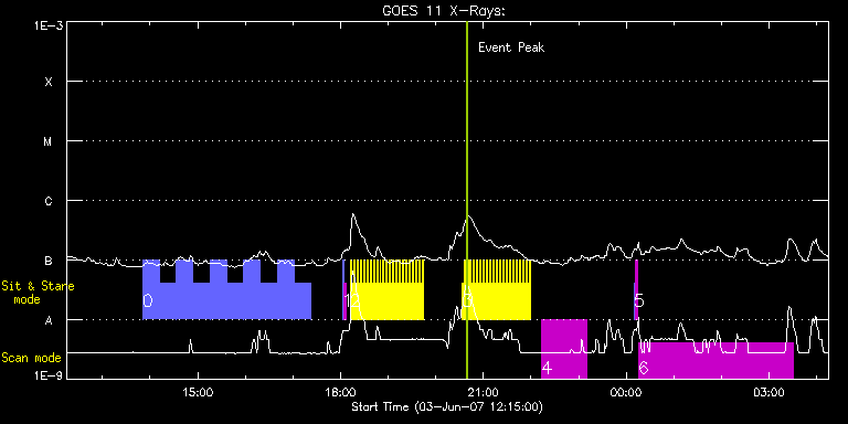 EIS Observation timeline overlay to GOES-Xray curve Code 1" 2" 40" 266" EIS Observations list for this event: STUDY ACRONYM ID DATE OBSERVED DESCRIPTION NOAA# TARGET 0 cam_artb_cds_b | 3027 | 2007/06/03 13:50:34 | Active Region Transient Brightenings ( | | Active Region TIMELINE ID DATE OBSERVED FITS FILE XCEN (+W/-E) YCEN (+N/-S) DUR ----------------------------------------------------------------------------------------------------------------- 3027 | 2007/06/03 13:50:34.000 | eis_l0_20070603_135034.fits.gz | 0.45 | -68.50 | 21m10s 3027 | 2007/06/03 14:11:47.000 | eis_l0_20070603_141147.fits.gz | 0.43 | -68.47 | 21m10s 3027 | 2007/06/03 14:33:01.000 | eis_l0_20070603_143301.fits.gz | 0.44 | -68.43 | 21m10s 3027 | 2007/06/03 14:54:14.000 | eis_l0_20070603_145414.fits.gz | 0.47 | -68.53 | 21m10s 3027 | 2007/06/03 15:15:28.000 | eis_l0_20070603_151528.fits.gz | 4.16 | -66.62 | 21m10s 3027 | 2007/06/03 15:36:41.000 | eis_l0_20070603_153641.fits.gz | 0.44 | -68.50 | 21m10s 3027 | 2007/06/03 15:57:54.000 | eis_l0_20070603_155754.fits.gz | 0.44 | -68.47 | 21m10s 3027 | 2007/06/03 16:19:08.000 | eis_l0_20070603_161908.fits.gz | 0.46 | -68.46 | 21m10s 3027 | 2007/06/03 16:40:21.000 | eis_l0_20070603_164021.fits.gz | 0.46 | -68.46 | 21m10s 3027 | 2007/06/03 17:01:34.000 | eis_l0_20070603_170134.fits.gz | 0.42 | -68.47 | 21m10s 1 SYNOP001 | 3028 | 2007/06/03 18:02:12 | SYNOP001_40arcsec_1arcsec_30s_90s | | Quiet Sun TIMELINE ID DATE OBSERVED FITS FILE XCEN (+W/-E) YCEN (+N/-S) DUR ----------------------------------------------------------------------------------------------------------------- 3028 | 2007/06/03 18:02:12.000 | eis_l0_20070603_180212.fits.gz | 0.44 | 45.68 | 2m1s 3028 | 2007/06/03 18:04:27.000 | eis_l0_20070603_180427.fits.gz | 0.43 | 45.59 | 2m1s 2 Alignment_266 | 3029 | 2007/06/03 18:12:19 | Alignment slot 266 | | Quiet Sun TIMELINE ID DATE OBSERVED FITS FILE XCEN (+W/-E) YCEN (+N/-S) DUR ----------------------------------------------------------------------------------------------------------------- 3029 | 2007/06/03 18:12:19.000 | eis_l0_20070603_181219.fits.gz | 0.45 | 574.49 | 1m22s 3029 | 2007/06/03 18:14:23.000 | eis_l0_20070603_181423.fits.gz | 0.40 | 574.50 | 1m22s 3029 | 2007/06/03 18:16:26.000 | eis_l0_20070603_181626.fits.gz | 0.43 | 574.48 | 1m22s 3029 | 2007/06/03 18:18:30.000 | eis_l0_20070603_181830.fits.gz | 0.38 | 574.45 | 1m22s 3029 | 2007/06/03 18:20:34.000 | eis_l0_20070603_182034.fits.gz | 0.49 | 574.51 | 1m22s 3029 | 2007/06/03 18:22:38.000 | eis_l0_20070603_182238.fits.gz | 0.46 | 574.48 | 1m22s 3029 | 2007/06/03 18:24:41.000 | eis_l0_20070603_182441.fits.gz | 0.44 | 574.56 | 1m22s 3029 | 2007/06/03 18:26:45.000 | eis_l0_20070603_182645.fits.gz | 0.39 | 574.56 | 1m22s 3029 | 2007/06/03 18:28:49.000 | eis_l0_20070603_182849.fits.gz | 0.38 | 574.57 | 1m22s 3029 | 2007/06/03 18:30:53.000 | eis_l0_20070603_183053.fits.gz | 0.51 | 574.57 | 1m22s 3029 | 2007/06/03 18:32:56.000 | eis_l0_20070603_183256.fits.gz | 0.51 | 574.56 | 1m22s 3029 | 2007/06/03 18:35:00.000 | eis_l0_20070603_183500.fits.gz | 0.48 | 574.55 | 1m22s 3029 | 2007/06/03 18:37:04.000 | eis_l0_20070603_183704.fits.gz | 0.43 | 574.47 | 1m22s 3029 | 2007/06/03 18:39:08.000 | eis_l0_20070603_183908.fits.gz | 0.38 | 574.41 | 1m22s 3029 | 2007/06/03 18:41:12.000 | eis_l0_20070603_184112.fits.gz | 0.40 | 574.46 | 1m22s 3029 | 2007/06/03 18:43:15.000 | eis_l0_20070603_184315.fits.gz | 0.40 | 574.47 | 1m22s 3029 | 2007/06/03 18:45:19.000 | eis_l0_20070603_184519.fits.gz | 0.40 | 574.49 | 1m22s 3029 | 2007/06/03 18:47:23.000 | eis_l0_20070603_184723.fits.gz | 0.47 | 574.51 | 1m22s 3029 | 2007/06/03 18:49:27.000 | eis_l0_20070603_184927.fits.gz | 0.52 | 574.53 | 1m22s 3029 | 2007/06/03 18:51:30.000 | eis_l0_20070603_185130.fits.gz | 0.48 | 574.51 | 1m23s 3029 | 2007/06/03 18:53:34.000 | eis_l0_20070603_185334.fits.gz | 0.45 | 574.49 | 1m22s 3029 | 2007/06/03 18:55:38.000 | eis_l0_20070603_185538.fits.gz | 0.43 | 574.48 | 1m22s 3029 | 2007/06/03 18:57:42.000 | eis_l0_20070603_185742.fits.gz | 0.42 | 574.51 | 1m22s 3029 | 2007/06/03 18:59:46.000 | eis_l0_20070603_185946.fits.gz | 0.46 | 574.53 | 1m22s 3029 | 2007/06/03 19:01:49.000 | eis_l0_20070603_190149.fits.gz | 0.44 | 574.47 | 1m22s 3029 | 2007/06/03 19:03:53.000 | eis_l0_20070603_190353.fits.gz | 0.47 | 574.48 | 1m22s 3029 | 2007/06/03 19:05:57.000 | eis_l0_20070603_190557.fits.gz | 0.46 | 574.54 | 1m22s 3029 | 2007/06/03 19:08:01.000 | eis_l0_20070603_190801.fits.gz | 0.48 | 574.50 | 1m22s 3029 | 2007/06/03 19:10:05.000 | eis_l0_20070603_191005.fits.gz | 0.41 | 574.54 | 1m22s 3029 | 2007/06/03 19:12:08.000 | eis_l0_20070603_191208.fits.gz | 0.44 | 574.52 | 1m22s 3029 | 2007/06/03 19:14:12.000 | eis_l0_20070603_191412.fits.gz | 0.40 | 574.51 | 1m22s 3029 | 2007/06/03 19:16:16.000 | eis_l0_20070603_191616.fits.gz | 0.46 | 574.45 | 1m22s 3029 | 2007/06/03 19:18:20.000 | eis_l0_20070603_191820.fits.gz | 0.40 | 574.50 | 1m22s 3029 | 2007/06/03 19:20:24.000 | eis_l0_20070603_192024.fits.gz | 0.40 | 574.51 | 1m22s 3029 | 2007/06/03 19:22:27.000 | eis_l0_20070603_192227.fits.gz | 0.40 | 574.53 | 1m22s 3029 | 2007/06/03 19:24:31.000 | eis_l0_20070603_192431.fits.gz | 0.45 | 574.53 | 1m22s 3029 | 2007/06/03 19:26:35.000 | eis_l0_20070603_192635.fits.gz | 0.44 | 574.51 | 1m22s 3029 | 2007/06/03 19:28:39.000 | eis_l0_20070603_192839.fits.gz | 0.41 | 574.53 | 1m22s 3029 | 2007/06/03 19:30:43.000 | eis_l0_20070603_193043.fits.gz | 0.44 | 574.53 | 1m22s 3029 | 2007/06/03 19:32:46.000 | eis_l0_20070603_193246.fits.gz | 0.52 | 574.56 | 1m22s 3029 | 2007/06/03 19:34:50.000 | eis_l0_20070603_193450.fits.gz | 0.44 | 574.48 | 1m22s 3029 | 2007/06/03 19:36:54.000 | eis_l0_20070603_193654.fits.gz | 0.48 | 574.54 | 1m22s 3029 | 2007/06/03 19:38:58.000 | eis_l0_20070603_193858.fits.gz | 0.50 | 574.53 | 1m22s 3029 | 2007/06/03 19:41:01.000 | eis_l0_20070603_194101.fits.gz | 0.48 | 574.48 | 1m23s 3029 | 2007/06/03 19:43:05.000 | eis_l0_20070603_194305.fits.gz | 0.47 | 574.48 | 1m2