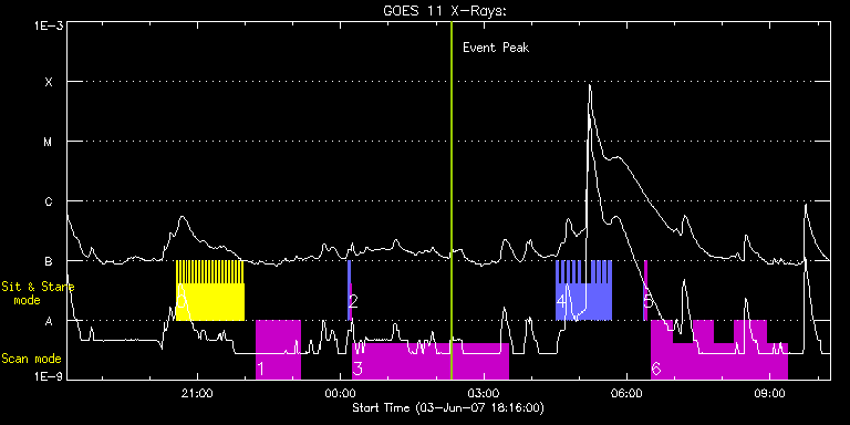EIS Observation timeline overlay to GOES-Xray curve Code 1" 2" 40" 266" EIS Observations list for this event: STUDY ACRONYM ID DATE OBSERVED DESCRIPTION NOAA# TARGET 0 Alignment_266 | 3030 | 2007/06/03 20:33:12 | Alignment slot 266 | 960 | Quiet Sun TIMELINE ID DATE OBSERVED FITS FILE XCEN (+W/-E) YCEN (+N/-S) DUR ----------------------------------------------------------------------------------------------------------------- 3030 | 2007/06/03 20:33:12.000 | eis_l0_20070603_203312.fits.gz | -929.47 | -355.42 | 1m22s 3030 | 2007/06/03 20:35:15.000 | eis_l0_20070603_203515.fits.gz | -929.44 | -355.32 | 1m22s 3030 | 2007/06/03 20:37:19.000 | eis_l0_20070603_203719.fits.gz | -929.40 | -355.37 | 1m22s 3030 | 2007/06/03 20:39:23.000 | eis_l0_20070603_203923.fits.gz | -929.39 | -355.31 | 1m22s 3030 | 2007/06/03 20:41:27.000 | eis_l0_20070603_204127.fits.gz | -929.39 | -355.31 | 1m22s 3030 | 2007/06/03 20:43:30.000 | eis_l0_20070603_204330.fits.gz | -929.47 | -355.35 | 1m22s 3030 | 2007/06/03 20:45:34.000 | eis_l0_20070603_204534.fits.gz | -929.48 | -355.40 | 1m22s 3030 | 2007/06/03 20:47:38.000 | eis_l0_20070603_204738.fits.gz | -929.36 | -355.38 | 1m22s 3030 | 2007/06/03 20:49:42.000 | eis_l0_20070603_204942.fits.gz | -929.44 | -355.30 | 1m22s 3030 | 2007/06/03 20:51:45.000 | eis_l0_20070603_205145.fits.gz | -929.44 | -355.33 | 1m22s 3030 | 2007/06/03 20:53:49.000 | eis_l0_20070603_205349.fits.gz | -929.40 | -355.32 | 1m22s 3030 | 2007/06/03 20:55:53.000 | eis_l0_20070603_205553.fits.gz | -929.43 | -355.36 | 1m22s 3030 | 2007/06/03 20:57:57.000 | eis_l0_20070603_205757.fits.gz | -929.40 | -355.38 | 1m22s 3030 | 2007/06/03 21:00:01.000 | eis_l0_20070603_210001.fits.gz | -929.43 | -355.32 | 1m21s 3030 | 2007/06/03 21:02:04.000 | eis_l0_20070603_210204.fits.gz | -929.43 | -355.36 | 1m22s 3030 | 2007/06/03 21:04:08.000 | eis_l0_20070603_210408.fits.gz | -929.46 | -355.34 | 1m22s 3030 | 2007/06/03 21:06:12.000 | eis_l0_20070603_210612.fits.gz | -929.39 | -355.31 | 1m22s 3030 | 2007/06/03 21:08:16.000 | eis_l0_20070603_210816.fits.gz | -929.39 | -355.37 | 1m22s 3030 | 2007/06/03 21:10:20.000 | eis_l0_20070603_211020.fits.gz | -929.35 | -355.34 | 1m22s 3030 | 2007/06/03 21:12:24.000 | eis_l0_20070603_211224.fits.gz | -929.37 | -355.33 | 1m21s 3030 | 2007/06/03 21:14:27.000 | eis_l0_20070603_211427.fits.gz | -929.33 | -355.31 | 1m22s 3030 | 2007/06/03 21:16:31.000 | eis_l0_20070603_211631.fits.gz | -929.39 | -355.29 | 1m22s 3030 | 2007/06/03 21:18:35.000 | eis_l0_20070603_211835.fits.gz | -929.42 | -355.32 | 1m22s 3030 | 2007/06/03 21:20:39.000 | eis_l0_20070603_212039.fits.gz | -929.38 | -355.27 | 1m22s 3030 | 2007/06/03 21:22:42.000 | eis_l0_20070603_212242.fits.gz | -929.35 | -355.36 | 1m22s 3030 | 2007/06/03 21:24:46.000 | eis_l0_20070603_212446.fits.gz | -929.36 | -355.34 | 1m22s 3030 | 2007/06/03 21:26:50.000 | eis_l0_20070603_212650.fits.gz | -929.34 | -355.32 | 1m22s 3030 | 2007/06/03 21:28:54.000 | eis_l0_20070603_212854.fits.gz | -929.42 | -355.36 | 1m22s 3030 | 2007/06/03 21:30:58.000 | eis_l0_20070603_213058.fits.gz | -929.43 | -355.35 | 1m22s 3030 | 2007/06/03 21:33:01.000 | eis_l0_20070603_213301.fits.gz | -929.45 | -355.36 | 1m22s 3030 | 2007/06/03 21:35:05.000 | eis_l0_20070603_213505.fits.gz | -929.48 | -355.39 | 1m22s 3030 | 2007/06/03 21:37:09.000 | eis_l0_20070603_213709.fits.gz | -929.43 | -355.31 | 1m22s 3030 | 2007/06/03 21:39:13.000 | eis_l0_20070603_213913.fits.gz | -929.46 | -355.34 | 1m22s 3030 | 2007/06/03 21:41:17.000 | eis_l0_20070603_214117.fits.gz | -929.39 | -355.27 | 1m21s 3030 | 2007/06/03 21:43:20.000 | eis_l0_20070603_214320.fits.gz | -929.38 | -355.23 | 1m22s 3030 | 2007/06/03 21:45:24.000 | eis_l0_20070603_214524.fits.gz | -929.48 | -355.31 | 1m22s 3030 | 2007/06/03 21:47:28.000 | eis_l0_20070603_214728.fits.gz | -929.35 | -355.25 | 1m22s 3030 | 2007/06/03 21:49:32.000 | eis_l0_20070603_214932.fits.gz | -929.35 | -355.33 | 1m22s 3030 | 2007/06/03 21:51:35.000 | eis_l0_20070603_215135.fits.gz | -929.41 | -355.37 | 1m22s 3030 | 2007/06/03 21:53:39.000 | eis_l0_20070603_215339.fits.gz | -929.40 | -355.38 | 1m22s 3030 | 2007/06/03 21:55:43.000 | eis_l0_20070603_215543.fits.gz | -924.00 | -365.77 | 1m22s 3030 | 2007/06/03 21:57:47.000 | eis_l0_20070603_215747.fits.gz | -929.47 | -355.31 | 1m22s 1 HPW008_FULLCCD_RAST | 3031 | 2007/06/03 22:13:33 | HPW008_FULLCCD_RAST_128x128_25s_SLIT1 | | Active Region TIMELINE ID DATE OBSERVED FITS FILE XCEN (+W/-E) YCEN (+N/-S) DUR ----------------------------------------------------------------------------------------------------------------- 3031 | 2007/06/03 22:13:33.000 | eis_l0_20070603_221333.fits.gz | -725.97 | -414.61 | 56m40s 2 SYNOP001 | 3032 | 2007/06/04 00:09:34 | SYNOP001_40arcsec_1arcsec_30s_90s | | Quiet Sun TIMELINE ID DATE OBSERVED FITS FILE XCEN (+W/-E) YCEN (+N/-S) DUR ----------------------------------------------------------------------------------------------------------------- 3032 | 2007/06/04 00:09:34.000 | eis_l0_20070604_000934.fits.gz | 0.41 | 45.65 | 2m1s 3032 | 2007/06/04 00:11:49.000 | eis_l0_20070604_001149.fits.gz | 0.42 | 45.59 | 2m1s 3 SYNOP002 | 3033 | 2007/06/04 00:15:12 | SYNOP002 | | Quiet Sun TIMELINE ID DATE OBSERVED FITS FILE XCEN (+W/-E) YCEN (+N/-S) DUR ----------------------------------------------------------------------------------------------------------------- 3033 | 2007/06/04 00:15:12.000 | eis_l0_20070604_001512.fits.gz | 1.17 | 139.21 | 3h15m20s 4 SK_AR40_movie | 3034 | 2007/06/04 04:30:33 | SK_AR40_movie | | Active Region TIMELINE ID DATE OBSERVED FITS FILE XCEN (+W/-E) YCEN (+N/-S) DUR ----------------------------------------------------------------------------------------------------------------- 3034 | 2007/06/04 04:30:33.000 | eis_l0_20070604_043033.fits.gz | -692.15 | -379.63 | 3m28s 3034 | 2007/06/04 04:34:03.000 | eis_l0_20070604_043403.fits.gz | -691.77 | -379.57 | 3m28s 3034 | 2007/06/04 04:37:34.000 | eis_l0_20070604_043734.fits.gz | -691.44 | -379.34 | 3m28s 3034 | 2007