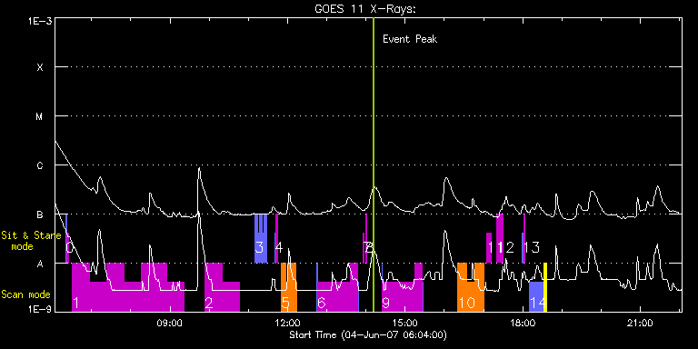 EIS Observation timeline overlay to GOES-Xray curve Code 1" 2" 40" 266" EIS Observations list for this event: STUDY ACRONYM ID DATE OBSERVED DESCRIPTION NOAA# TARGET 0 SYNOP001 | 3035 | 2007/06/04 06:20:11 | SYNOP001_40arcsec_1arcsec_30s_90s | | Quiet Sun TIMELINE ID DATE OBSERVED FITS FILE XCEN (+W/-E) YCEN (+N/-S) DUR ----------------------------------------------------------------------------------------------------------------- 3035 | 2007/06/04 06:20:11.000 | eis_l0_20070604_062011.fits.gz | 0.47 | 45.61 | 2m2s 3035 | 2007/06/04 06:22:27.000 | eis_l0_20070604_062227.fits.gz | 0.42 | 45.60 | 2m1s 1 HH_AR+FLR_RAS_N01 | 3036 | 2007/06/04 06:30:11 | HH_AR+FLR_RAS_N01 (EWxNS=240"x240", 5. | | Active Region TIMELINE ID DATE OBSERVED FITS FILE XCEN (+W/-E) YCEN (+N/-S) DUR ----------------------------------------------------------------------------------------------------------------- 3036 | 2007/06/04 06:30:11.000 | eis_l0_20070604_063011.fits.gz | -677.84 | -362.67 | 26m17s 3036 | 2007/06/04 06:56:30.000 | eis_l0_20070604_065630.fits.gz | -675.11 | -361.25 | 26m18s 3036 | 2007/06/04 07:22:51.000 | eis_l0_20070604_072251.fits.gz | -672.37 | -359.86 | 26m15s 3036 | 2007/06/04 07:49:09.000 | eis_l0_20070604_074909.fits.gz | -669.63 | -358.49 | 26m18s 3036 | 2007/06/04 08:15:29.000 | eis_l0_20070604_081529.fits.gz | -666.08 | -356.73 | 39m33s 3036 | 2007/06/04 08:55:05.000 | eis_l0_20070604_085505.fits.gz | -662.54 | -354.99 | 26m18s 2 HH_AR+FLR_RAS_N01 | 3037 | 2007/06/04 09:53:11 | HH_AR+FLR_RAS_N01 (EWxNS=240"x240", 5. | | Active Region TIMELINE ID DATE OBSERVED FITS FILE XCEN (+W/-E) YCEN (+N/-S) DUR ----------------------------------------------------------------------------------------------------------------- 3037 | 2007/06/04 09:53:11.000 | eis_l0_20070604_095311.fits.gz | -656.37 | -351.96 | 26m17s 3037 | 2007/06/04 10:19:30.000 | eis_l0_20070604_101930.fits.gz | -653.46 | -350.45 | 26m16s 3 SK_AR40_movie | 3039 | 2007/06/04 11:10:37 | SK_AR40_movie | | Active Region TIMELINE ID DATE OBSERVED FITS FILE XCEN (+W/-E) YCEN (+N/-S) DUR ----------------------------------------------------------------------------------------------------------------- 3039 | 2007/06/04 11:10:37.000 | eis_l0_20070604_111037.fits.gz | -635.11 | -334.52 | 3m27s 3039 | 2007/06/04 11:14:07.000 | eis_l0_20070604_111407.fits.gz | -634.76 | -334.37 | 3m29s 3039 | 2007/06/04 11:17:38.000 | eis_l0_20070604_111738.fits.gz | -634.35 | -334.14 | 3m28s 3039 | 2007/06/04 11:21:09.000 | eis_l0_20070604_112109.fits.gz | -633.95 | -333.96 | 3m29s 3039 | 2007/06/04 11:24:40.000 | eis_l0_20070604_112440.fits.gz | -633.56 | -333.74 | 3m29s 4 SYNOP001 | 3040 | 2007/06/04 11:40:13 | SYNOP001_40arcsec_1arcsec_30s_90s | | Quiet Sun TIMELINE ID DATE OBSERVED FITS FILE XCEN (+W/-E) YCEN (+N/-S) DUR ----------------------------------------------------------------------------------------------------------------- 3040 | 2007/06/04 11:40:13.000 | eis_l0_20070604_114013.fits.gz | 0.42 | 45.64 | 2m1s 3040 | 2007/06/04 11:42:28.000 | eis_l0_20070604_114228.fits.gz | 0.49 | 45.60 | 2m2s 5 SK_AR2_50x240p | 3041 | 2007/06/04 11:50:27 | SK_AR2_50x240p | | Active Region TIMELINE ID DATE OBSERVED FITS FILE XCEN (+W/-E) YCEN (+N/-S) DUR ----------------------------------------------------------------------------------------------------------------- 3041 | 2007/06/04 11:50:27.000 | eis_l0_20070604_115027.fits.gz | -629.54 | -321.80 | 1m29s 3041 | 2007/06/04 11:51:59.000 | eis_l0_20070604_115159.fits.gz | -629.39 | -321.70 | 1m28s 3041 | 2007/06/04 11:53:30.000 | eis_l0_20070604_115330.fits.gz | -629.16 | -321.59 | 1m28s 3041 | 2007/06/04 11:55:00.000 | eis_l0_20070604_115500.fits.gz | -629.05 | -321.53 | 1m28s 3041 | 2007/06/04 11:56:31.000 | eis_l0_20070604_115631.fits.gz | -628.78 | -321.44 | 1m28s 3041 | 2007/06/04 11:58:02.000 | eis_l0_20070604_115802.fits.gz | -628.62 | -321.28 | 1m28s 3041 | 2007/06/04 11:59:33.000 | eis_l0_20070604_115933.fits.gz | -628.53 | -321.20 | 1m28s 3041 | 2007/06/04 12:01:03.000 | eis_l0_20070604_120103.fits.gz | -628.34 | -321.14 | 1m28s 3041 | 2007/06/04 12:02:34.000 | eis_l0_20070604_120234.fits.gz | -628.09 | -321.05 | 1m28s 3041 | 2007/06/04 12:04:05.000 | eis_l0_20070604_120405.fits.gz | -628.00 | -320.99 | 1m28s 3041 | 2007/06/04 12:05:36.000 | eis_l0_20070604_120536.fits.gz | -627.80 | -320.91 | 1m28s 3041 | 2007/06/04 12:07:06.000 | eis_l0_20070604_120706.fits.gz | -627.68 | -320.81 | 1m28s 3041 | 2007/06/04 12:08:37.000 | eis_l0_20070604_120837.fits.gz | -627.48 | -320.73 | 1m28s 3041 | 2007/06/04 12:10:08.000 | eis_l0_20070604_121008.fits.gz | -627.30 | -320.62 | 1m28s 3041 | 2007/06/04 12:11:38.000 | eis_l0_20070604_121138.fits.gz | -627.11 | -320.52 | 1m28s 3041 | 2007/06/04 12:13:09.000 | eis_l0_20070604_121309.fits.gz | -626.93 | -320.50 | 1m29s 6 COMSCI_AR2 | 3042 | 2007/06/04 12:45:20 | Active Region Scan for Global Changes | | Active Region TIMELINE ID DATE OBSERVED FITS FILE XCEN (+W/-E) YCEN (+N/-S) DUR ----------------------------------------------------------------------------------------------------------------- 3042 | 2007/06/04 12:45:20.000 | eis_l0_20070604_124520.fits.gz | -604.37 | -305.12 | 1m8s 3042 | 2007/06/04 12:46:39.000 | eis_l0_20070604_124639.fits.gz | -620.91 | -313.42 | 49m23s 3042 | 2007/06/04 13:36:05.000 | eis_l0_20070604_133605.fits.gz | -617.44 | -311.77 | 11m34s 3042 | 2007/06/04 13:48:04.000 | eis_l0_20070604_134804.fits.gz | -597.12 | -301.60 | 1m8s 7 regcal071 | 3043 | 2007/06/04 13:55:12 | Dark exposures, CCD bottom rows | | Engineering TIMELINE ID DATE OBSERVED FITS FILE XCEN (+W/-E) YCEN (+N/-S) DUR ----------------------------------------------------------------------------------------------------------------- 3043 | 2007/06/04 13:55:12.000 | eis_l0_20070604_135512.fits.gz | -601.97 | -367.53 | 2m1s 8 regcal072 | 3044 | 2007/06/04 13:59:12 | Dark exposures, top CCD rows | | Engineering TIMELINE ID DATE OBSERVED FITS FILE XCEN (+W/-E) YCEN (+N/-S) DUR --------------