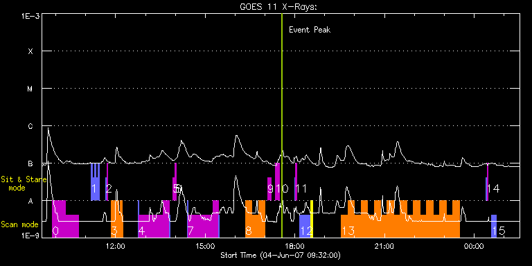 EIS Observation timeline overlay to GOES-Xray curve Code 1" 2" 40" 266" EIS Observations list for this event: STUDY ACRONYM ID DATE OBSERVED DESCRIPTION NOAA# TARGET 0 HH_AR+FLR_RAS_N01 | 3037 | 2007/06/04 09:53:11 | HH_AR+FLR_RAS_N01 (EWxNS=240"x240", 5. | | Active Region TIMELINE ID DATE OBSERVED FITS FILE XCEN (+W/-E) YCEN (+N/-S) DUR ----------------------------------------------------------------------------------------------------------------- 3037 | 2007/06/04 09:53:11.000 | eis_l0_20070604_095311.fits.gz | -656.37 | -351.96 | 26m17s 3037 | 2007/06/04 10:19:30.000 | eis_l0_20070604_101930.fits.gz | -653.46 | -350.45 | 26m16s 1 SK_AR40_movie | 3039 | 2007/06/04 11:10:37 | SK_AR40_movie | | Active Region TIMELINE ID DATE OBSERVED FITS FILE XCEN (+W/-E) YCEN (+N/-S) DUR ----------------------------------------------------------------------------------------------------------------- 3039 | 2007/06/04 11:10:37.000 | eis_l0_20070604_111037.fits.gz | -635.11 | -334.52 | 3m27s 3039 | 2007/06/04 11:14:07.000 | eis_l0_20070604_111407.fits.gz | -634.76 | -334.37 | 3m29s 3039 | 2007/06/04 11:17:38.000 | eis_l0_20070604_111738.fits.gz | -634.35 | -334.14 | 3m28s 3039 | 2007/06/04 11:21:09.000 | eis_l0_20070604_112109.fits.gz | -633.95 | -333.96 | 3m29s 3039 | 2007/06/04 11:24:40.000 | eis_l0_20070604_112440.fits.gz | -633.56 | -333.74 | 3m29s 2 SYNOP001 | 3040 | 2007/06/04 11:40:13 | SYNOP001_40arcsec_1arcsec_30s_90s | | Quiet Sun TIMELINE ID DATE OBSERVED FITS FILE XCEN (+W/-E) YCEN (+N/-S) DUR ----------------------------------------------------------------------------------------------------------------- 3040 | 2007/06/04 11:40:13.000 | eis_l0_20070604_114013.fits.gz | 0.42 | 45.64 | 2m1s 3040 | 2007/06/04 11:42:28.000 | eis_l0_20070604_114228.fits.gz | 0.49 | 45.60 | 2m2s 3 SK_AR2_50x240p | 3041 | 2007/06/04 11:50:27 | SK_AR2_50x240p | | Active Region TIMELINE ID DATE OBSERVED FITS FILE XCEN (+W/-E) YCEN (+N/-S) DUR ----------------------------------------------------------------------------------------------------------------- 3041 | 2007/06/04 11:50:27.000 | eis_l0_20070604_115027.fits.gz | -629.54 | -321.80 | 1m29s 3041 | 2007/06/04 11:51:59.000 | eis_l0_20070604_115159.fits.gz | -629.39 | -321.70 | 1m28s 3041 | 2007/06/04 11:53:30.000 | eis_l0_20070604_115330.fits.gz | -629.16 | -321.59 | 1m28s 3041 | 2007/06/04 11:55:00.000 | eis_l0_20070604_115500.fits.gz | -629.05 | -321.53 | 1m28s 3041 | 2007/06/04 11:56:31.000 | eis_l0_20070604_115631.fits.gz | -628.78 | -321.44 | 1m28s 3041 | 2007/06/04 11:58:02.000 | eis_l0_20070604_115802.fits.gz | -628.62 | -321.28 | 1m28s 3041 | 2007/06/04 11:59:33.000 | eis_l0_20070604_115933.fits.gz | -628.53 | -321.20 | 1m28s 3041 | 2007/06/04 12:01:03.000 | eis_l0_20070604_120103.fits.gz | -628.34 | -321.14 | 1m28s 3041 | 2007/06/04 12:02:34.000 | eis_l0_20070604_120234.fits.gz | -628.09 | -321.05 | 1m28s 3041 | 2007/06/04 12:04:05.000 | eis_l0_20070604_120405.fits.gz | -628.00 | -320.99 | 1m28s 3041 | 2007/06/04 12:05:36.000 | eis_l0_20070604_120536.fits.gz | -627.80 | -320.91 | 1m28s 3041 | 2007/06/04 12:07:06.000 | eis_l0_20070604_120706.fits.gz | -627.68 | -320.81 | 1m28s 3041 | 2007/06/04 12:08:37.000 | eis_l0_20070604_120837.fits.gz | -627.48 | -320.73 | 1m28s 3041 | 2007/06/04 12:10:08.000 | eis_l0_20070604_121008.fits.gz | -627.30 | -320.62 | 1m28s 3041 | 2007/06/04 12:11:38.000 | eis_l0_20070604_121138.fits.gz | -627.11 | -320.52 | 1m28s 3041 | 2007/06/04 12:13:09.000 | eis_l0_20070604_121309.fits.gz | -626.93 | -320.50 | 1m29s 4 COMSCI_AR2 | 3042 | 2007/06/04 12:45:20 | Active Region Scan for Global Changes | | Active Region TIMELINE ID DATE OBSERVED FITS FILE XCEN (+W/-E) YCEN (+N/-S) DUR ----------------------------------------------------------------------------------------------------------------- 3042 | 2007/06/04 12:45:20.000 | eis_l0_20070604_124520.fits.gz | -604.37 | -305.12 | 1m8s 3042 | 2007/06/04 12:46:39.000 | eis_l0_20070604_124639.fits.gz | -620.91 | -313.42 | 49m23s 3042 | 2007/06/04 13:36:05.000 | eis_l0_20070604_133605.fits.gz | -617.44 | -311.77 | 11m34s 3042 | 2007/06/04 13:48:04.000 | eis_l0_20070604_134804.fits.gz | -597.12 | -301.60 | 1m8s 5 regcal071 | 3043 | 2007/06/04 13:55:12 | Dark exposures, CCD bottom rows | | Engineering TIMELINE ID DATE OBSERVED FITS FILE XCEN (+W/-E) YCEN (+N/-S) DUR ----------------------------------------------------------------------------------------------------------------- 3043 | 2007/06/04 13:55:12.000 | eis_l0_20070604_135512.fits.gz | -601.97 | -367.53 | 2m1s 6 regcal072 | 3044 | 2007/06/04 13:59:12 | Dark exposures, top CCD rows | | Engineering TIMELINE ID DATE OBSERVED FITS FILE XCEN (+W/-E) YCEN (+N/-S) DUR ----------------------------------------------------------------------------------------------------------------- 3044 | 2007/06/04 13:59:12.000 | eis_l0_20070604_135912.fits.gz | -601.50 | -111.76 | 2m1s 7 COMSCI_AR2 | 3045 | 2007/06/04 14:24:13 | Active Region Scan for Global Changes | | Active Region TIMELINE ID DATE OBSERVED FITS FILE XCEN (+W/-E) YCEN (+N/-S) DUR ----------------------------------------------------------------------------------------------------------------- 3045 | 2007/06/04 14:24:13.000 | eis_l0_20070604_142413.fits.gz | -593.03 | -299.55 | 1m8s 3045 | 2007/06/04 14:25:32.000 | eis_l0_20070604_142532.fits.gz | -609.54 | -307.76 | 49m24s 3045 | 2007/06/04 15:14:59.000 | eis_l0_20070604_151459.fits.gz | -606.03 | -306.10 | 11m33s 3045 | 2007/06/04 15:26:57.000 | eis_l0_20070604_152657.fits.gz | -585.70 | -295.90 | 1m8s 8 HH_AR+FLR_RAS_N03 | 3046 | 2007/06/04 16:20:34 | HH_AR+FLR_RAS_N03 (EWxNS=240"x240", 5. | | Active Region TIMELINE ID DATE OBSERVED FITS FILE XCEN (+W/-E) YCEN (+N/-S) DUR ----------------------------------------------------------------------------------------------------------------- 3046 | 2007/06/04 16:20:34.000 | eis_l0_20070604_162034.fits.gz | -597.78 | -305.95 | 13m7s 3046 | 2007/06/04 16:33:44.000 | eis_l0_20070604_163344.fits.gz | -59