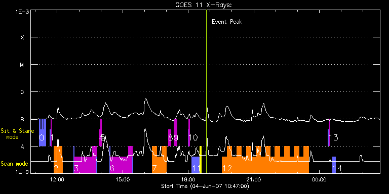 EIS Observation timeline overlay to GOES-Xray curve Code 1" 2" 40" 266" EIS Observations list for this event: STUDY ACRONYM ID DATE OBSERVED DESCRIPTION NOAA# TARGET 0 SK_AR40_movie | 3039 | 2007/06/04 11:10:37 | SK_AR40_movie | | Active Region TIMELINE ID DATE OBSERVED FITS FILE XCEN (+W/-E) YCEN (+N/-S) DUR ----------------------------------------------------------------------------------------------------------------- 3039 | 2007/06/04 11:10:37.000 | eis_l0_20070604_111037.fits.gz | -635.11 | -334.52 | 3m27s 3039 | 2007/06/04 11:14:07.000 | eis_l0_20070604_111407.fits.gz | -634.76 | -334.37 | 3m29s 3039 | 2007/06/04 11:17:38.000 | eis_l0_20070604_111738.fits.gz | -634.35 | -334.14 | 3m28s 3039 | 2007/06/04 11:21:09.000 | eis_l0_20070604_112109.fits.gz | -633.95 | -333.96 | 3m29s 3039 | 2007/06/04 11:24:40.000 | eis_l0_20070604_112440.fits.gz | -633.56 | -333.74 | 3m29s 1 SYNOP001 | 3040 | 2007/06/04 11:40:13 | SYNOP001_40arcsec_1arcsec_30s_90s | | Quiet Sun TIMELINE ID DATE OBSERVED FITS FILE XCEN (+W/-E) YCEN (+N/-S) DUR ----------------------------------------------------------------------------------------------------------------- 3040 | 2007/06/04 11:40:13.000 | eis_l0_20070604_114013.fits.gz | 0.42 | 45.64 | 2m1s 3040 | 2007/06/04 11:42:28.000 | eis_l0_20070604_114228.fits.gz | 0.49 | 45.60 | 2m2s 2 SK_AR2_50x240p | 3041 | 2007/06/04 11:50:27 | SK_AR2_50x240p | | Active Region TIMELINE ID DATE OBSERVED FITS FILE XCEN (+W/-E) YCEN (+N/-S) DUR ----------------------------------------------------------------------------------------------------------------- 3041 | 2007/06/04 11:50:27.000 | eis_l0_20070604_115027.fits.gz | -629.54 | -321.80 | 1m29s 3041 | 2007/06/04 11:51:59.000 | eis_l0_20070604_115159.fits.gz | -629.39 | -321.70 | 1m28s 3041 | 2007/06/04 11:53:30.000 | eis_l0_20070604_115330.fits.gz | -629.16 | -321.59 | 1m28s 3041 | 2007/06/04 11:55:00.000 | eis_l0_20070604_115500.fits.gz | -629.05 | -321.53 | 1m28s 3041 | 2007/06/04 11:56:31.000 | eis_l0_20070604_115631.fits.gz | -628.78 | -321.44 | 1m28s 3041 | 2007/06/04 11:58:02.000 | eis_l0_20070604_115802.fits.gz | -628.62 | -321.28 | 1m28s 3041 | 2007/06/04 11:59:33.000 | eis_l0_20070604_115933.fits.gz | -628.53 | -321.20 | 1m28s 3041 | 2007/06/04 12:01:03.000 | eis_l0_20070604_120103.fits.gz | -628.34 | -321.14 | 1m28s 3041 | 2007/06/04 12:02:34.000 | eis_l0_20070604_120234.fits.gz | -628.09 | -321.05 | 1m28s 3041 | 2007/06/04 12:04:05.000 | eis_l0_20070604_120405.fits.gz | -628.00 | -320.99 | 1m28s 3041 | 2007/06/04 12:05:36.000 | eis_l0_20070604_120536.fits.gz | -627.80 | -320.91 | 1m28s 3041 | 2007/06/04 12:07:06.000 | eis_l0_20070604_120706.fits.gz | -627.68 | -320.81 | 1m28s 3041 | 2007/06/04 12:08:37.000 | eis_l0_20070604_120837.fits.gz | -627.48 | -320.73 | 1m28s 3041 | 2007/06/04 12:10:08.000 | eis_l0_20070604_121008.fits.gz | -627.30 | -320.62 | 1m28s 3041 | 2007/06/04 12:11:38.000 | eis_l0_20070604_121138.fits.gz | -627.11 | -320.52 | 1m28s 3041 | 2007/06/04 12:13:09.000 | eis_l0_20070604_121309.fits.gz | -626.93 | -320.50 | 1m29s 3 COMSCI_AR2 | 3042 | 2007/06/04 12:45:20 | Active Region Scan for Global Changes | | Active Region TIMELINE ID DATE OBSERVED FITS FILE XCEN (+W/-E) YCEN (+N/-S) DUR ----------------------------------------------------------------------------------------------------------------- 3042 | 2007/06/04 12:45:20.000 | eis_l0_20070604_124520.fits.gz | -604.37 | -305.12 | 1m8s 3042 | 2007/06/04 12:46:39.000 | eis_l0_20070604_124639.fits.gz | -620.91 | -313.42 | 49m23s 3042 | 2007/06/04 13:36:05.000 | eis_l0_20070604_133605.fits.gz | -617.44 | -311.77 | 11m34s 3042 | 2007/06/04 13:48:04.000 | eis_l0_20070604_134804.fits.gz | -597.12 | -301.60 | 1m8s 4 regcal071 | 3043 | 2007/06/04 13:55:12 | Dark exposures, CCD bottom rows | | Engineering TIMELINE ID DATE OBSERVED FITS FILE XCEN (+W/-E) YCEN (+N/-S) DUR ----------------------------------------------------------------------------------------------------------------- 3043 | 2007/06/04 13:55:12.000 | eis_l0_20070604_135512.fits.gz | -601.97 | -367.53 | 2m1s 5 regcal072 | 3044 | 2007/06/04 13:59:12 | Dark exposures, top CCD rows | | Engineering TIMELINE ID DATE OBSERVED FITS FILE XCEN (+W/-E) YCEN (+N/-S) DUR ----------------------------------------------------------------------------------------------------------------- 3044 | 2007/06/04 13:59:12.000 | eis_l0_20070604_135912.fits.gz | -601.50 | -111.76 | 2m1s 6 COMSCI_AR2 | 3045 | 2007/06/04 14:24:13 | Active Region Scan for Global Changes | | Active Region TIMELINE ID DATE OBSERVED FITS FILE XCEN (+W/-E) YCEN (+N/-S) DUR ----------------------------------------------------------------------------------------------------------------- 3045 | 2007/06/04 14:24:13.000 | eis_l0_20070604_142413.fits.gz | -593.03 | -299.55 | 1m8s 3045 | 2007/06/04 14:25:32.000 | eis_l0_20070604_142532.fits.gz | -609.54 | -307.76 | 49m24s 3045 | 2007/06/04 15:14:59.000 | eis_l0_20070604_151459.fits.gz | -606.03 | -306.10 | 11m33s 3045 | 2007/06/04 15:26:57.000 | eis_l0_20070604_152657.fits.gz | -585.70 | -295.90 | 1m8s 7 HH_AR+FLR_RAS_N03 | 3046 | 2007/06/04 16:20:34 | HH_AR+FLR_RAS_N03 (EWxNS=240"x240", 5. | | Active Region TIMELINE ID DATE OBSERVED FITS FILE XCEN (+W/-E) YCEN (+N/-S) DUR ----------------------------------------------------------------------------------------------------------------- 3046 | 2007/06/04 16:20:34.000 | eis_l0_20070604_162034.fits.gz | -597.78 | -305.95 | 13m7s 3046 | 2007/06/04 16:33:44.000 | eis_l0_20070604_163344.fits.gz | -596.17 | -305.22 | 13m8s 3046 | 2007/06/04 16:46:55.000 | eis_l0_20070604_164655.fits.gz | -594.60 | -304.31 | 13m6s 8 regcal017 | 3047 | 2007/06/04 17:05:12 | Flat fields, short exposures | | Engineering TIMELINE ID DATE OBSERVED FITS FILE XCEN (+W/-E) YCEN (+N/-S) DUR ----------------------------------------------------------------------------------------------------------------- 3047 | 2007/06/04 17:05:12.000 | eis_l0_20070604_170512.fits.gz | -579.49 | -228.79 | 6m47s