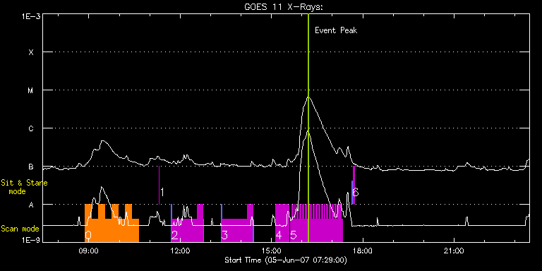 EIS Observation timeline overlay to GOES-Xray curve Code 1" 2" 40" 266" EIS Observations list for this event: STUDY ACRONYM ID DATE OBSERVED DESCRIPTION NOAA# TARGET 0 HH_AR+FLR_RAS_N03 | 3060 | 2007/06/05 08:52:27 | HH_AR+FLR_RAS_N03 (EWxNS=240"x240", 5. | 960 | Active Region TIMELINE ID DATE OBSERVED FITS FILE XCEN (+W/-E) YCEN (+N/-S) DUR ----------------------------------------------------------------------------------------------------------------- 3060 | 2007/06/05 08:52:27.000 | eis_l0_20070605_085227.fits.gz | -104338.20 | -134.36 | 13m7s 3060 | 2007/06/05 09:05:37.000 | eis_l0_20070605_090537.fits.gz | -472.27 | -243.56 | 13m8s 3060 | 2007/06/05 09:18:48.000 | eis_l0_20070605_091848.fits.gz | -470.51 | -242.69 | 13m6s 3060 | 2007/06/05 09:31:57.000 | eis_l0_20070605_093157.fits.gz | -468.75 | -241.81 | 13m7s 3060 | 2007/06/05 09:45:07.000 | eis_l0_20070605_094507.fits.gz | -467.02 | -240.93 | 13m7s 3060 | 2007/06/05 09:58:17.000 | eis_l0_20070605_095817.fits.gz | -465.37 | -240.09 | 13m7s 3060 | 2007/06/05 10:11:27.000 | eis_l0_20070605_101127.fits.gz | -463.46 | -239.20 | 13m7s 3060 | 2007/06/05 10:24:37.000 | eis_l0_20070605_102437.fits.gz | -461.83 | -238.42 | 13m8s 1 regcal070 | 3061 | 2007/06/05 11:18:41 | Flat field with overscan pixels (50*8) | | Engineering TIMELINE ID DATE OBSERVED FITS FILE XCEN (+W/-E) YCEN (+N/-S) DUR ----------------------------------------------------------------------------------------------------------------- 3061 | 2007/06/05 11:18:41.000 | eis_l0_20070605_111841.fits.gz | -479.79 | -57.93 | 1s 2 COMSCI_AR2 | 3063 | 2007/06/05 11:42:50 | Active Region Scan for Global Changes | 960 | Active Region TIMELINE ID DATE OBSERVED FITS FILE XCEN (+W/-E) YCEN (+N/-S) DUR ----------------------------------------------------------------------------------------------------------------- 3063 | 2007/06/05 11:42:50.000 | eis_l0_20070605_114250.fits.gz | -471.02 | -245.61 | 1m7s 3063 | 2007/06/05 11:44:09.000 | eis_l0_20070605_114409.fits.gz | -487.11 | -253.69 | 49m23s 3063 | 2007/06/05 12:33:35.000 | eis_l0_20070605_123335.fits.gz | -483.19 | -251.71 | 11m34s 3063 | 2007/06/05 12:45:34.000 | eis_l0_20070605_124534.fits.gz | -462.80 | -241.59 | 1m8s 3 COMSCI_AR2 | 3064 | 2007/06/05 13:21:12 | Active Region Scan for Global Changes | 960 | Active Region TIMELINE ID DATE OBSERVED FITS FILE XCEN (+W/-E) YCEN (+N/-S) DUR ----------------------------------------------------------------------------------------------------------------- 3064 | 2007/06/05 13:21:12.000 | eis_l0_20070605_132112.fits.gz | -458.20 | -239.25 | 1m8s 3064 | 2007/06/05 13:22:31.000 | eis_l0_20070605_132231.fits.gz | -474.39 | -247.27 | 49m24s 3064 | 2007/06/05 14:11:58.000 | eis_l0_20070605_141158.fits.gz | -470.26 | -245.38 | 11m33s 3064 | 2007/06/05 14:23:56.000 | eis_l0_20070605_142356.fits.gz | -449.90 | -235.14 | 1m8s 4 HH_AR+FLR_RAS_N01 | 3065 | 2007/06/05 15:07:49 | HH_AR+FLR_RAS_N01 (EWxNS=240"x240", 5. | 960 | Active Region TIMELINE ID DATE OBSERVED FITS FILE XCEN (+W/-E) YCEN (+N/-S) DUR ----------------------------------------------------------------------------------------------------------------- 3065 | 2007/06/05 15:07:49.000 | eis_l0_20070605_150749.fits.gz | -461.95 | -245.22 | 26m18s 5 HH_AR+FLR_RAS_H01 | 3066 | 2007/06/05 15:37:12 | HH_AR+FLR_RAS_H01 (EWxNS=240"x240", 5. | 960 | Active Region TIMELINE ID DATE OBSERVED FITS FILE XCEN (+W/-E) YCEN (+N/-S) DUR ----------------------------------------------------------------------------------------------------------------- 3066 | 2007/06/05 15:37:12.000 | eis_l0_20070605_153712.fits.gz | -459.67 | -244.10 | 2m36s 3066 | 2007/06/05 15:39:51.000 | eis_l0_20070605_153951.fits.gz | -459.32 | -243.93 | 2m36s 3066 | 2007/06/05 15:42:30.000 | eis_l0_20070605_154230.fits.gz | -459.01 | -243.77 | 2m36s 3066 | 2007/06/05 15:45:09.000 | eis_l0_20070605_154509.fits.gz | -458.59 | -243.60 | 2m36s 3066 | 2007/06/05 15:47:48.000 | eis_l0_20070605_154748.fits.gz | -458.23 | -243.36 | 2m37s 3066 | 2007/06/05 15:50:28.000 | eis_l0_20070605_155028.fits.gz | -457.89 | -243.14 | 2m36s 3066 | 2007/06/05 15:53:07.000 | eis_l0_20070605_155307.fits.gz | -457.56 | -242.98 | 2m37s 3066 | 2007/06/05 15:55:47.000 | eis_l0_20070605_155547.fits.gz | -457.20 | -242.83 | 2m36s 3066 | 2007/06/05 15:58:26.000 | eis_l0_20070605_155826.fits.gz | -456.85 | -242.62 | 2m36s 3066 | 2007/06/05 16:01:05.000 | eis_l0_20070605_160105.fits.gz | -456.52 | -242.53 | 2m36s 3066 | 2007/06/05 16:03:44.000 | eis_l0_20070605_160344.fits.gz | -456.10 | -242.32 | 2m36s 3066 | 2007/06/05 16:06:23.000 | eis_l0_20070605_160623.fits.gz | -455.73 | -242.12 | 2m37s 3066 | 2007/06/05 16:09:03.000 | eis_l0_20070605_160903.fits.gz | -455.42 | -241.94 | 2m36s 3066 | 2007/06/05 16:11:41.000 | eis_l0_20070605_161141.fits.gz | -455.06 | -241.82 | 2m37s 3066 | 2007/06/05 16:14:20.000 | eis_l0_20070605_161420.fits.gz | -454.71 | -241.58 | 2m36s 3066 | 2007/06/05 16:16:59.000 | eis_l0_20070605_161659.fits.gz | -454.39 | -241.45 | 2m36s 3066 | 2007/06/05 16:19:38.000 | eis_l0_20070605_161938.fits.gz | -454.05 | -241.22 | 2m37s 3066 | 2007/06/05 16:22:18.000 | eis_l0_20070605_162218.fits.gz | -453.67 | -241.07 | 2m36s 3066 | 2007/06/05 16:24:57.000 | eis_l0_20070605_162457.fits.gz | -453.37 | -240.85 | 2m36s 3066 | 2007/06/05 16:27:36.000 | eis_l0_20070605_162736.fits.gz | -452.91 | -240.65 | 2m36s 3066 | 2007/06/05 16:30:15.000 | eis_l0_20070605_163015.fits.gz | -452.56 | -240.47 | 2m36s 3066 | 2007/06/05 16:32:54.000 | eis_l0_20070605_163254.fits.gz | -452.20 | -240.33 | 2m36s 3066 | 2007/06/05 16:35:33.000 | eis_l0_20070605_163533.fits.gz | -451.87 | -240.22 | 2m36s 3066 | 2007/06/05 16:38:12.000 | eis_l0_20070605_163812.fits.gz | -451.57 | -240.02 | 2m37s 3066 | 2007/06/05 16:40:51.000 | eis_l0_20070605_164051.fits.gz | -451.25 | -239.83 | 2m37s 3066 | 2007/06/05 16:43:31.000 | eis_l0_20070605_164331.fits.gz | -450.82 | -239.68 | 2m37s 3066 | 2007/06/05 16:46:11.000 | eis_l0_20070605_164611.fits.gz 