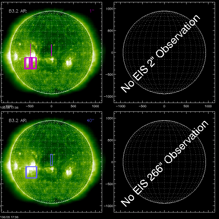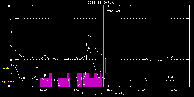 EIS Observation timeline overlay to GOES-Xray curve Code 1" 2" 40" 266" EIS Observations list for this event: STUDY ACRONYM ID DATE OBSERVED DESCRIPTION NOAA# TARGET 0 regcal070 | 3061 | 2007/06/05 11:18:41 | Flat field with overscan pixels (50*8) | | Engineering TIMELINE ID DATE OBSERVED FITS FILE XCEN (+W/-E) YCEN (+N/-S) DUR ----------------------------------------------------------------------------------------------------------------- 3061 | 2007/06/05 11:18:41.000 | eis_l0_20070605_111841.fits.gz | -479.79 | -57.93 | 1s 1 COMSCI_AR2 | 3063 | 2007/06/05 11:42:50 | Active Region Scan for Global Changes | 960 | Active Region TIMELINE ID DATE OBSERVED FITS FILE XCEN (+W/-E) YCEN (+N/-S) DUR ----------------------------------------------------------------------------------------------------------------- 3063 | 2007/06/05 11:42:50.000 | eis_l0_20070605_114250.fits.gz | -471.02 | -245.61 | 1m7s 3063 | 2007/06/05 11:44:09.000 | eis_l0_20070605_114409.fits.gz | -487.11 | -253.69 | 49m23s 3063 | 2007/06/05 12:33:35.000 | eis_l0_20070605_123335.fits.gz | -483.19 | -251.71 | 11m34s 3063 | 2007/06/05 12:45:34.000 | eis_l0_20070605_124534.fits.gz | -462.80 | -241.59 | 1m8s 2 COMSCI_AR2 | 3064 | 2007/06/05 13:21:12 | Active Region Scan for Global Changes | 960 | Active Region TIMELINE ID DATE OBSERVED FITS FILE XCEN (+W/-E) YCEN (+N/-S) DUR ----------------------------------------------------------------------------------------------------------------- 3064 | 2007/06/05 13:21:12.000 | eis_l0_20070605_132112.fits.gz | -458.20 | -239.25 | 1m8s 3064 | 2007/06/05 13:22:31.000 | eis_l0_20070605_132231.fits.gz | -474.39 | -247.27 | 49m24s 3064 | 2007/06/05 14:11:58.000 | eis_l0_20070605_141158.fits.gz | -470.26 | -245.38 | 11m33s 3064 | 2007/06/05 14:23:56.000 | eis_l0_20070605_142356.fits.gz | -449.90 | -235.14 | 1m8s 3 HH_AR+FLR_RAS_N01 | 3065 | 2007/06/05 15:07:49 | HH_AR+FLR_RAS_N01 (EWxNS=240"x240", 5. | 960 | Active Region TIMELINE ID DATE OBSERVED FITS FILE XCEN (+W/-E) YCEN (+N/-S) DUR ----------------------------------------------------------------------------------------------------------------- 3065 | 2007/06/05 15:07:49.000 | eis_l0_20070605_150749.fits.gz | -461.95 | -245.22 | 26m18s 4 HH_AR+FLR_RAS_H01 | 3066 | 2007/06/05 15:37:12 | HH_AR+FLR_RAS_H01 (EWxNS=240"x240", 5. | 960 | Active Region TIMELINE ID DATE OBSERVED FITS FILE XCEN (+W/-E) YCEN (+N/-S) DUR ----------------------------------------------------------------------------------------------------------------- 3066 | 2007/06/05 15:37:12.000 | eis_l0_20070605_153712.fits.gz | -459.67 | -244.10 | 2m36s 3066 | 2007/06/05 15:39:51.000 | eis_l0_20070605_153951.fits.gz | -459.32 | -243.93 | 2m36s 3066 | 2007/06/05 15:42:30.000 | eis_l0_20070605_154230.fits.gz | -459.01 | -243.77 | 2m36s 3066 | 2007/06/05 15:45:09.000 | eis_l0_20070605_154509.fits.gz | -458.59 | -243.60 | 2m36s 3066 | 2007/06/05 15:47:48.000 | eis_l0_20070605_154748.fits.gz | -458.23 | -243.36 | 2m37s 3066 | 2007/06/05 15:50:28.000 | eis_l0_20070605_155028.fits.gz | -457.89 | -243.14 | 2m36s 3066 | 2007/06/05 15:53:07.000 | eis_l0_20070605_155307.fits.gz | -457.56 | -242.98 | 2m37s 3066 | 2007/06/05 15:55:47.000 | eis_l0_20070605_155547.fits.gz | -457.20 | -242.83 | 2m36s 3066 | 2007/06/05 15:58:26.000 | eis_l0_20070605_155826.fits.gz | -456.85 | -242.62 | 2m36s 3066 | 2007/06/05 16:01:05.000 | eis_l0_20070605_160105.fits.gz | -456.52 | -242.53 | 2m36s 3066 | 2007/06/05 16:03:44.000 | eis_l0_20070605_160344.fits.gz | -456.10 | -242.32 | 2m36s 3066 | 2007/06/05 16:06:23.000 | eis_l0_20070605_160623.fits.gz | -455.73 | -242.12 | 2m37s 3066 | 2007/06/05 16:09:03.000 | eis_l0_20070605_160903.fits.gz | -455.42 | -241.94 | 2m36s 3066 | 2007/06/05 16:11:41.000 | eis_l0_20070605_161141.fits.gz | -455.06 | -241.82 | 2m37s 3066 | 2007/06/05 16:14:20.000 | eis_l0_20070605_161420.fits.gz | -454.71 | -241.58 | 2m36s 3066 | 2007/06/05 16:16:59.000 | eis_l0_20070605_161659.fits.gz | -454.39 | -241.45 | 2m36s 3066 | 2007/06/05 16:19:38.000 | eis_l0_20070605_161938.fits.gz | -454.05 | -241.22 | 2m37s 3066 | 2007/06/05 16:22:18.000 | eis_l0_20070605_162218.fits.gz | -453.67 | -241.07 | 2m36s 3066 | 2007/06/05 16:24:57.000 | eis_l0_20070605_162457.fits.gz | -453.37 | -240.85 | 2m36s 3066 | 2007/06/05 16:27:36.000 | eis_l0_20070605_162736.fits.gz | -452.91 | -240.65 | 2m36s 3066 | 2007/06/05 16:30:15.000 | eis_l0_20070605_163015.fits.gz | -452.56 | -240.47 | 2m36s 3066 | 2007/06/05 16:32:54.000 | eis_l0_20070605_163254.fits.gz | -452.20 | -240.33 | 2m36s 3066 | 2007/06/05 16:35:33.000 | eis_l0_20070605_163533.fits.gz | -451.87 | -240.22 | 2m36s 3066 | 2007/06/05 16:38:12.000 | eis_l0_20070605_163812.fits.gz | -451.57 | -240.02 | 2m37s 3066 | 2007/06/05 16:40:51.000 | eis_l0_20070605_164051.fits.gz | -451.25 | -239.83 | 2m37s 3066 | 2007/06/05 16:43:31.000 | eis_l0_20070605_164331.fits.gz | -450.82 | -239.68 | 2m37s 3066 | 2007/06/05 16:46:11.000 | eis_l0_20070605_164611.fits.gz | -450.39 | -239.42 | 2m36s 3066 | 2007/06/05 16:48:49.000 | eis_l0_20070605_164849.fits.gz | -450.03 | -239.25 | 2m36s 3066 | 2007/06/05 16:51:28.000 | eis_l0_20070605_165128.fits.gz | -449.74 | -239.13 | 2m37s 3066 | 2007/06/05 16:54:08.000 | eis_l0_20070605_165408.fits.gz | -449.43 | -238.94 | 2m36s 3066 | 2007/06/05 16:56:47.000 | eis_l0_20070605_165647.fits.gz | -449.08 | -238.74 | 2m36s 3066 | 2007/06/05 16:59:25.000 | eis_l0_20070605_165925.fits.gz | -448.74 | -238.62 | 2m37s 3066 | 2007/06/05 17:02:05.000 | eis_l0_20070605_170205.fits.gz | -448.39 | -238.46 | 2m37s 3066 | 2007/06/05 17:04:45.000 | eis_l0_20070605_170445.fits.gz | -448.03 | -238.28 | 2m36s 3066 | 2007/06/05 17:07:23.000 | eis_l0_20070605_170723.fits.gz | -447.65 | -238.12 | 2m37s 3066 | 2007/06/05 17:10:02.000 | eis_l0_20070605_171002.fits.gz | -447.27 | -237.90 | 2m37s 3066 | 2007/06/05 17:12:42.000 | eis_l0_20070605_171242.fits.gz | -447.02 | -237.71 | 2m36s 3066 | 2007/06/05 17:15:21.000 | eis_l0_20070605_171521.fits.gz | -446.59 | -237.57