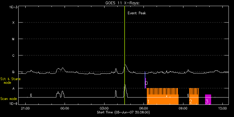 EIS Observation timeline overlay to GOES-Xray curve Code 1" 2" 40" 266" EIS Observations list for this event: STUDY ACRONYM ID DATE OBSERVED DESCRIPTION NOAA# TARGET 0 SYNOP001 | 3069 | 2007/06/06 06:05:19 | SYNOP001_40arcsec_1arcsec_30s_90s | | Quiet Sun TIMELINE ID DATE OBSERVED FITS FILE XCEN (+W/-E) YCEN (+N/-S) DUR ----------------------------------------------------------------------------------------------------------------- 3069 | 2007/06/06 06:05:19.000 | eis_l0_20070606_060519.fits.gz | 0.45 | 45.58 | 2m1s 3069 | 2007/06/06 06:07:34.000 | eis_l0_20070606_060734.fits.gz | 0.52 | 45.65 | 2m2s 1 chromo_evap_rm | 3070 | 2007/06/06 06:15:26 | Chromospheric Evaporation During Solar | | Flare TIMELINE ID DATE OBSERVED FITS FILE XCEN (+W/-E) YCEN (+N/-S) DUR ----------------------------------------------------------------------------------------------------------------- 3070 | 2007/06/06 06:15:26.000 | eis_l0_20070606_061526.fits.gz | -338.47 | -205.95 | 3m12s 3070 | 2007/06/06 06:18:41.000 | eis_l0_20070606_061841.fits.gz | -338.01 | -205.70 | 3m12s 3070 | 2007/06/06 06:21:56.000 | eis_l0_20070606_062156.fits.gz | -337.52 | -205.49 | 3m12s 3070 | 2007/06/06 06:25:11.000 | eis_l0_20070606_062511.fits.gz | -337.04 | -205.21 | 3m12s 3070 | 2007/06/06 06:28:26.000 | eis_l0_20070606_062826.fits.gz | -336.59 | -205.00 | 3m12s 3070 | 2007/06/06 06:31:41.000 | eis_l0_20070606_063141.fits.gz | -336.15 | -204.77 | 3m12s 3070 | 2007/06/06 06:34:56.000 | eis_l0_20070606_063456.fits.gz | -335.65 | -204.56 | 3m12s 3070 | 2007/06/06 06:38:11.000 | eis_l0_20070606_063811.fits.gz | -335.19 | -204.33 | 3m12s 3070 | 2007/06/06 06:41:26.000 | eis_l0_20070606_064126.fits.gz | -334.79 | -204.16 | 3m12s 3070 | 2007/06/06 06:44:41.000 | eis_l0_20070606_064441.fits.gz | -334.34 | -203.86 | 3m12s 3070 | 2007/06/06 06:47:56.000 | eis_l0_20070606_064756.fits.gz | -333.76 | -203.61 | 3m12s 3070 | 2007/06/06 06:51:10.000 | eis_l0_20070606_065110.fits.gz | -333.31 | -203.41 | 3m13s 3070 | 2007/06/06 06:54:25.000 | eis_l0_20070606_065425.fits.gz | -332.87 | -203.17 | 3m12s 3070 | 2007/06/06 06:57:39.000 | eis_l0_20070606_065739.fits.gz | -332.41 | -202.89 | 3m13s 3070 | 2007/06/06 07:00:54.000 | eis_l0_20070606_070054.fits.gz | -332.02 | -202.67 | 3m13s 3070 | 2007/06/06 07:04:09.000 | eis_l0_20070606_070409.fits.gz | -331.44 | -202.49 | 3m12s 3070 | 2007/06/06 07:07:24.000 | eis_l0_20070606_070724.fits.gz | -331.02 | -202.24 | 3m12s 3070 | 2007/06/06 07:10:39.000 | eis_l0_20070606_071039.fits.gz | -330.59 | -202.07 | 3m12s 3070 | 2007/06/06 07:13:54.000 | eis_l0_20070606_071354.fits.gz | -330.15 | -201.83 | 3m12s 3070 | 2007/06/06 07:17:09.000 | eis_l0_20070606_071709.fits.gz | -329.70 | -201.60 | 3m12s 3070 | 2007/06/06 07:20:24.000 | eis_l0_20070606_072024.fits.gz | -328.20 | -200.85 | 3m12s 3070 | 2007/06/06 07:23:39.000 | eis_l0_20070606_072339.fits.gz | -327.40 | -201.91 | 3m12s 3070 | 2007/06/06 07:26:53.000 | eis_l0_20070606_072653.fits.gz | -328.24 | -200.89 | 3m13s 3070 | 2007/06/06 07:30:08.000 | eis_l0_20070606_073008.fits.gz | -327.78 | -200.58 | 3m12s 3070 | 2007/06/06 07:33:23.000 | eis_l0_20070606_073323.fits.gz | -327.39 | -200.43 | 3m12s 3070 | 2007/06/06 07:36:38.000 | eis_l0_20070606_073638.fits.gz | -326.89 | -200.22 | 3m12s 3070 | 2007/06/06 07:39:52.000 | eis_l0_20070606_073952.fits.gz | -326.49 | -200.01 | 3m12s 3070 | 2007/06/06 07:43:07.000 | eis_l0_20070606_074307.fits.gz | -325.89 | -199.72 | 3m12s 3070 | 2007/06/06 07:46:22.000 | eis_l0_20070606_074622.fits.gz | -325.49 | -199.51 | 3m12s 3070 | 2007/06/06 07:49:37.000 | eis_l0_20070606_074937.fits.gz | -325.01 | -199.32 | 3m13s 3070 | 2007/06/06 07:52:52.000 | eis_l0_20070606_075252.fits.gz | -324.61 | -199.10 | 3m12s 3070 | 2007/06/06 07:56:07.000 | eis_l0_20070606_075607.fits.gz | -324.11 | -198.86 | 3m12s 3070 | 2007/06/06 07:59:22.000 | eis_l0_20070606_075922.fits.gz | -323.65 | -198.55 | 3m12s 3070 | 2007/06/06 08:02:37.000 | eis_l0_20070606_080237.fits.gz | -323.22 | -198.35 | 3m13s 3070 | 2007/06/06 08:05:52.000 | eis_l0_20070606_080552.fits.gz | -322.75 | -198.13 | 3m12s 3070 | 2007/06/06 08:09:07.000 | eis_l0_20070606_080907.fits.gz | -322.18 | -197.93 | 3m12s 3070 | 2007/06/06 08:12:21.000 | eis_l0_20070606_081221.fits.gz | -321.80 | -197.68 | 3m12s 3070 | 2007/06/06 08:15:36.000 | eis_l0_20070606_081536.fits.gz | -321.30 | -197.44 | 3m12s 3070 | 2007/06/06 08:18:51.000 | eis_l0_20070606_081851.fits.gz | -320.90 | -197.23 | 3m11s 3070 | 2007/06/06 08:22:05.000 | eis_l0_20070606_082205.fits.gz | -320.35 | -196.98 | 3m12s 3070 | 2007/06/06 08:25:20.000 | eis_l0_20070606_082520.fits.gz | -319.88 | -196.76 | 3m12s 3070 | 2007/06/06 08:28:35.000 | eis_l0_20070606_082835.fits.gz | -319.47 | -196.54 | 3m12s 3070 | 2007/06/06 08:31:50.000 | eis_l0_20070606_083150.fits.gz | -318.98 | -196.28 | 3m12s 3070 | 2007/06/06 08:35:05.000 | eis_l0_20070606_083505.fits.gz | -318.54 | -196.08 | 3m11s 2 chromo_evap_rm | 3071 | 2007/06/06 09:28:12 | Chromospheric Evaporation During Solar | | Flare TIMELINE ID DATE OBSERVED FITS FILE XCEN (+W/-E) YCEN (+N/-S) DUR ----------------------------------------------------------------------------------------------------------------- 3071 | 2007/06/06 09:28:12.000 | eis_l0_20070606_092812.fits.gz | -310.96 | -192.32 | 3m12s 3071 | 2007/06/06 09:31:27.000 | eis_l0_20070606_093127.fits.gz | -310.58 | -192.10 | 3m12s 3071 | 2007/06/06 09:34:42.000 | eis_l0_20070606_093442.fits.gz | -309.99 | -191.88 | 3m12s 3071 | 2007/06/06 09:37:57.000 | eis_l0_20070606_093757.fits.gz | -309.55 | -191.62 | 3m12s 3071 | 2007/06/06 09:41:12.000 | eis_l0_20070606_094112.fits.gz | -309.04 | -191.33 | 3m12s 3071 | 2007/06/06 09:44:27.000 | eis_l0_20070606_094427.fits.gz | -308.64 | -191.13 | 3m12s 3071 | 2007/06/06 09:47:41.000 | eis_l0_20070606_094741.fits.gz | -308.12 | -190.94 | 3m12s 3071 | 2007/06/06 09:50:56.000 | eis_l0_20070606_095056.fits.gz | -307.67 | -190.67 | 3m13s 3071 | 2007/06/06 09:54:11.000 | eis_l0_20070606_09541