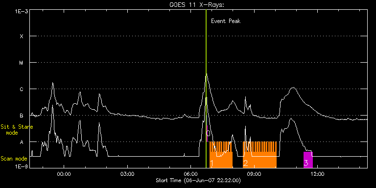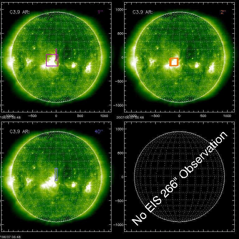 EIS Observation timeline overlay to GOES-Xray curve Code 1" 2" 40" 266" EIS Observations list for this event: STUDY ACRONYM ID DATE OBSERVED DESCRIPTION NOAA# TARGET 0 SYNOP001 | 3076 | 2007/06/07 06:43:22 | SYNOP001_40arcsec_1arcsec_30s_90s | | Quiet Sun TIMELINE ID DATE OBSERVED FITS FILE XCEN (+W/-E) YCEN (+N/-S) DUR ----------------------------------------------------------------------------------------------------------------- 3076 | 2007/06/07 06:43:22.000 | eis_l0_20070607_064322.fits.gz | 0.43 | 45.57 | 2m2s 3076 | 2007/06/07 06:45:38.000 | eis_l0_20070607_064538.fits.gz | 0.41 | 45.57 | 2m1s 1 chromo_evap_rm | 3077 | 2007/06/07 06:53:30 | Chromospheric Evaporation During Solar | 960 | Flare TIMELINE ID DATE OBSERVED FITS FILE XCEN (+W/-E) YCEN (+N/-S) DUR ----------------------------------------------------------------------------------------------------------------- 3077 | 2007/06/07 06:53:30.000 | eis_l0_20070607_065330.fits.gz | -123.95 | -109.60 | 3m12s 3077 | 2007/06/07 06:56:45.000 | eis_l0_20070607_065645.fits.gz | -123.50 | -109.39 | 3m12s 3077 | 2007/06/07 07:00:00.000 | eis_l0_20070607_070000.fits.gz | -122.95 | -109.21 | 3m12s 3077 | 2007/06/07 07:03:15.000 | eis_l0_20070607_070315.fits.gz | -122.45 | -108.93 | 3m12s 3077 | 2007/06/07 07:06:30.000 | eis_l0_20070607_070630.fits.gz | -122.02 | -108.70 | 3m13s 3077 | 2007/06/07 07:09:45.000 | eis_l0_20070607_070945.fits.gz | -121.41 | -108.44 | 3m12s 3077 | 2007/06/07 07:13:00.000 | eis_l0_20070607_071300.fits.gz | -121.03 | -108.21 | 3m13s 3077 | 2007/06/07 07:16:15.000 | eis_l0_20070607_071615.fits.gz | -120.47 | -108.05 | 3m13s 3077 | 2007/06/07 07:19:30.000 | eis_l0_20070607_071930.fits.gz | -120.01 | -107.80 | 3m13s 3077 | 2007/06/07 07:22:45.000 | eis_l0_20070607_072245.fits.gz | -119.52 | -107.46 | 3m13s 3077 | 2007/06/07 07:26:00.000 | eis_l0_20070607_072600.fits.gz | -119.05 | -107.26 | 3m13s 3077 | 2007/06/07 07:29:16.000 | eis_l0_20070607_072916.fits.gz | -118.51 | -107.03 | 3m12s 3077 | 2007/06/07 07:32:31.000 | eis_l0_20070607_073231.fits.gz | -118.05 | -106.80 | 3m12s 3077 | 2007/06/07 07:35:46.000 | eis_l0_20070607_073546.fits.gz | -117.58 | -106.46 | 3m12s 3077 | 2007/06/07 07:39:00.000 | eis_l0_20070607_073900.fits.gz | -117.07 | -106.21 | 3m13s 3077 | 2007/06/07 07:42:15.000 | eis_l0_20070607_074215.fits.gz | -116.56 | -105.94 | 3m13s 3077 | 2007/06/07 07:45:31.000 | eis_l0_20070607_074531.fits.gz | -116.06 | -105.73 | 3m13s 3077 | 2007/06/07 07:48:46.000 | eis_l0_20070607_074846.fits.gz | -115.59 | -105.53 | 3m13s 3077 | 2007/06/07 07:52:01.000 | eis_l0_20070607_075201.fits.gz | -115.11 | -105.31 | 3m12s 3077 | 2007/06/07 07:55:16.000 | eis_l0_20070607_075516.fits.gz | -114.71 | -105.05 | 3m11s 2 chromo_evap_rm | 3078 | 2007/06/07 08:29:13 | Chromospheric Evaporation During Solar | 960 | Flare TIMELINE ID DATE OBSERVED FITS FILE XCEN (+W/-E) YCEN (+N/-S) DUR ----------------------------------------------------------------------------------------------------------------- 3078 | 2007/06/07 08:29:13.000 | eis_l0_20070607_082913.fits.gz | -109.55 | -102.55 | 3m11s 3078 | 2007/06/07 08:32:27.000 | eis_l0_20070607_083227.fits.gz | -109.09 | -102.32 | 3m12s 3078 | 2007/06/07 08:35:42.000 | eis_l0_20070607_083542.fits.gz | -108.66 | -102.11 | 3m12s 3078 | 2007/06/07 08:38:57.000 | eis_l0_20070607_083857.fits.gz | -108.12 | -101.84 | 3m12s 3078 | 2007/06/07 08:42:12.000 | eis_l0_20070607_084212.fits.gz | -107.60 | -101.55 | 3m12s 3078 | 2007/06/07 08:45:27.000 | eis_l0_20070607_084527.fits.gz | -107.11 | -101.30 | 3m12s 3078 | 2007/06/07 08:48:41.000 | eis_l0_20070607_084841.fits.gz | -106.60 | -101.07 | 3m13s 3078 | 2007/06/07 08:51:57.000 | eis_l0_20070607_085157.fits.gz | -106.12 | -100.87 | 3m12s 3078 | 2007/06/07 08:55:12.000 | eis_l0_20070607_085512.fits.gz | -105.63 | -100.63 | 3m12s 3078 | 2007/06/07 08:58:27.000 | eis_l0_20070607_085827.fits.gz | -105.17 | -100.36 | 3m12s 3078 | 2007/06/07 09:01:41.000 | eis_l0_20070607_090141.fits.gz | -104.64 | -100.11 | 3m12s 3078 | 2007/06/07 09:04:56.000 | eis_l0_20070607_090456.fits.gz | -104.10 | -99.79 | 3m12s 3078 | 2007/06/07 09:08:11.000 | eis_l0_20070607_090811.fits.gz | -103.68 | -99.59 | 3m12s 3078 | 2007/06/07 09:11:26.000 | eis_l0_20070607_091126.fits.gz | -103.17 | -99.39 | 3m12s 3078 | 2007/06/07 09:14:40.000 | eis_l0_20070607_091440.fits.gz | -102.71 | -99.10 | 3m13s 3078 | 2007/06/07 09:17:55.000 | eis_l0_20070607_091755.fits.gz | -102.21 | -98.83 | 3m12s 3078 | 2007/06/07 09:21:10.000 | eis_l0_20070607_092110.fits.gz | -101.73 | -98.68 | 3m12s 3078 | 2007/06/07 09:24:25.000 | eis_l0_20070607_092425.fits.gz | -101.25 | -98.51 | 3m12s 3078 | 2007/06/07 09:27:40.000 | eis_l0_20070607_092740.fits.gz | -100.69 | -98.19 | 3m12s 3078 | 2007/06/07 09:30:55.000 | eis_l0_20070607_093055.fits.gz | -100.28 | -97.95 | 3m12s 3078 | 2007/06/07 09:34:10.000 | eis_l0_20070607_093410.fits.gz | -99.76 | -97.71 | 3m12s 3078 | 2007/06/07 09:37:24.000 | eis_l0_20070607_093724.fits.gz | -99.33 | -97.40 | 3m12s 3078 | 2007/06/07 09:40:39.000 | eis_l0_20070607_094039.fits.gz | -98.73 | -97.18 | 3m12s 3078 | 2007/06/07 09:43:54.000 | eis_l0_20070607_094354.fits.gz | -98.26 | -96.90 | 3m12s 3078 | 2007/06/07 09:47:09.000 | eis_l0_20070607_094709.fits.gz | -97.78 | -96.67 | 3m12s 3078 | 2007/06/07 09:50:23.000 | eis_l0_20070607_095023.fits.gz | -97.27 | -96.41 | 3m13s 3078 | 2007/06/07 09:53:39.000 | eis_l0_20070607_095339.fits.gz | -96.84 | -96.21 | 3m12s 3078 | 2007/06/07 09:56:54.000 | eis_l0_20070607_095654.fits.gz | -96.30 | -96.04 | 3m12s 3078 | 2007/06/07 10:00:08.000 | eis_l0_20070607_100008.fits.gz | -95.78 | -95.70 | 3m13s 3 HH_AR+FLR_RAS_N01 | 3079 | 2007/06/07 11:20:27 | HH_AR+FLR_RAS_N01 (EWxNS=240"x240", 5. | 960 | Active Region TIMELINE ID DATE OBSERVED FITS FILE XCEN (+W/-E) YCEN (+N/-S) DUR ----------------------------------------------------------------------------------------------------------------- 3079 | 2007/06/07 11:20:27.000 | eis_l0_20070607_112027.f