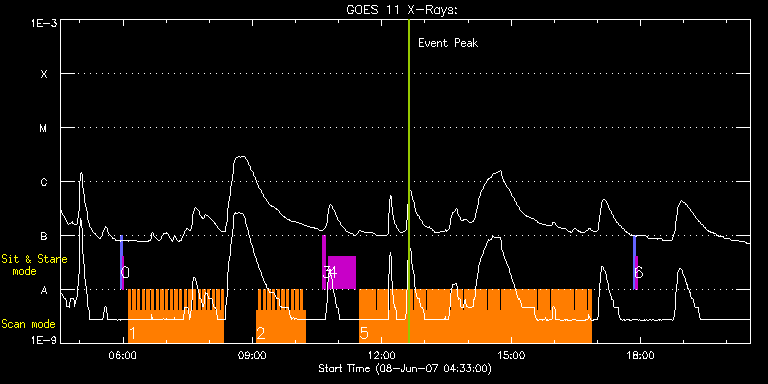 EIS Observation timeline overlay to GOES-Xray curve Code 1" 2" 40" 266" EIS Observations list for this event: STUDY ACRONYM ID DATE OBSERVED DESCRIPTION NOAA# TARGET 0 SYNOP001 | 3083 | 2007/06/08 05:56:52 | SYNOP001_40arcsec_1arcsec_30s_90s | | Quiet Sun TIMELINE ID DATE OBSERVED FITS FILE XCEN (+W/-E) YCEN (+N/-S) DUR ----------------------------------------------------------------------------------------------------------------- 3083 | 2007/06/08 05:56:52.000 | eis_l0_20070608_055652.fits.gz | 0.40 | 45.59 | 2m1s 3083 | 2007/06/08 05:59:07.000 | eis_l0_20070608_055907.fits.gz | 0.40 | 45.55 | 2m2s 1 chromo_evap_rm | 3084 | 2007/06/08 06:06:59 | Chromospheric Evaporation During Solar | | Flare TIMELINE ID DATE OBSERVED FITS FILE XCEN (+W/-E) YCEN (+N/-S) DUR ----------------------------------------------------------------------------------------------------------------- 3084 | 2007/06/08 06:06:59.000 | eis_l0_20070608_060659.fits.gz | 86.87 | -5.23 | 3m12s 3084 | 2007/06/08 06:10:14.000 | eis_l0_20070608_061014.fits.gz | 87.31 | -4.97 | 3m12s 3084 | 2007/06/08 06:13:29.000 | eis_l0_20070608_061329.fits.gz | 87.78 | -4.72 | 3m12s 3084 | 2007/06/08 06:16:43.000 | eis_l0_20070608_061643.fits.gz | 88.24 | -4.55 | 3m12s 3084 | 2007/06/08 06:19:58.000 | eis_l0_20070608_061958.fits.gz | 88.76 | -4.32 | 3m12s 3084 | 2007/06/08 06:23:12.000 | eis_l0_20070608_062312.fits.gz | 89.25 | -4.04 | 3m13s 3084 | 2007/06/08 06:26:27.000 | eis_l0_20070608_062627.fits.gz | 89.75 | -3.79 | 3m13s 3084 | 2007/06/08 06:29:43.000 | eis_l0_20070608_062943.fits.gz | 90.12 | -3.57 | 3m12s 3084 | 2007/06/08 06:32:57.000 | eis_l0_20070608_063257.fits.gz | 90.67 | -3.29 | 3m13s 3084 | 2007/06/08 06:36:13.000 | eis_l0_20070608_063613.fits.gz | 91.14 | -3.06 | 3m12s 3084 | 2007/06/08 06:39:28.000 | eis_l0_20070608_063928.fits.gz | 91.66 | -2.77 | 3m12s 3084 | 2007/06/08 06:42:43.000 | eis_l0_20070608_064243.fits.gz | 92.19 | -2.57 | 3m12s 3084 | 2007/06/08 06:45:58.000 | eis_l0_20070608_064558.fits.gz | 92.69 | -2.37 | 3m12s 3084 | 2007/06/08 06:49:13.000 | eis_l0_20070608_064913.fits.gz | 93.18 | -2.08 | 3m13s 3084 | 2007/06/08 06:52:28.000 | eis_l0_20070608_065228.fits.gz | 93.61 | -1.86 | 3m13s 3084 | 2007/06/08 06:55:44.000 | eis_l0_20070608_065544.fits.gz | 94.10 | -1.58 | 3m12s 3084 | 2007/06/08 06:58:58.000 | eis_l0_20070608_065858.fits.gz | 94.58 | -1.37 | 3m13s 3084 | 2007/06/08 07:02:13.000 | eis_l0_20070608_070213.fits.gz | 95.08 | -1.09 | 3m12s 3084 | 2007/06/08 07:05:28.000 | eis_l0_20070608_070528.fits.gz | 95.65 | -0.80 | 3m12s 3084 | 2007/06/08 07:08:43.000 | eis_l0_20070608_070843.fits.gz | 96.12 | -0.59 | 3m13s 3084 | 2007/06/08 07:11:58.000 | eis_l0_20070608_071158.fits.gz | 96.52 | -0.40 | 3m13s 3084 | 2007/06/08 07:15:14.000 | eis_l0_20070608_071514.fits.gz | 97.16 | -0.12 | 3m11s 3084 | 2007/06/08 07:18:28.000 | eis_l0_20070608_071828.fits.gz | 97.58 | 0.08 | 3m13s 3084 | 2007/06/08 07:21:43.000 | eis_l0_20070608_072143.fits.gz | 98.06 | 0.32 | 3m12s 3084 | 2007/06/08 07:24:58.000 | eis_l0_20070608_072458.fits.gz | 98.50 | 0.50 | 3m12s 3084 | 2007/06/08 07:28:12.000 | eis_l0_20070608_072812.fits.gz | 99.03 | 0.74 | 3m13s 3084 | 2007/06/08 07:31:27.000 | eis_l0_20070608_073127.fits.gz | 99.48 | 1.04 | 3m12s 3084 | 2007/06/08 07:34:42.000 | eis_l0_20070608_073442.fits.gz | 99.97 | 1.32 | 3m12s 3084 | 2007/06/08 07:37:56.000 | eis_l0_20070608_073756.fits.gz | 100.45 | 1.56 | 3m12s 3084 | 2007/06/08 07:41:11.000 | eis_l0_20070608_074111.fits.gz | 100.94 | 1.78 | 3m13s 3084 | 2007/06/08 07:44:26.000 | eis_l0_20070608_074426.fits.gz | 101.43 | 1.97 | 3m13s 3084 | 2007/06/08 07:47:41.000 | eis_l0_20070608_074741.fits.gz | 101.96 | 2.24 | 3m12s 3084 | 2007/06/08 07:50:56.000 | eis_l0_20070608_075056.fits.gz | 102.44 | 2.49 | 3m12s 3084 | 2007/06/08 07:54:10.000 | eis_l0_20070608_075410.fits.gz | 103.02 | 2.73 | 3m13s 3084 | 2007/06/08 07:57:25.000 | eis_l0_20070608_075725.fits.gz | 103.39 | 2.91 | 3m12s 3084 | 2007/06/08 08:00:40.000 | eis_l0_20070608_080040.fits.gz | 103.99 | 3.25 | 3m12s 3084 | 2007/06/08 08:03:55.000 | eis_l0_20070608_080355.fits.gz | 104.43 | 3.47 | 3m12s 3084 | 2007/06/08 08:07:10.000 | eis_l0_20070608_080710.fits.gz | 104.89 | 3.74 | 3m12s 3084 | 2007/06/08 08:10:25.000 | eis_l0_20070608_081025.fits.gz | 105.37 | 3.98 | 3m11s 3084 | 2007/06/08 08:13:39.000 | eis_l0_20070608_081339.fits.gz | 105.88 | 4.18 | 3m12s 3084 | 2007/06/08 08:16:53.000 | eis_l0_20070608_081653.fits.gz | 106.43 | 4.52 | 3m12s 2 chromo_evap_rm | 3085 | 2007/06/08 09:05:12 | Chromospheric Evaporation During Solar | | Flare TIMELINE ID DATE OBSERVED FITS FILE XCEN (+W/-E) YCEN (+N/-S) DUR ----------------------------------------------------------------------------------------------------------------- 3085 | 2007/06/08 09:05:12.000 | eis_l0_20070608_090512.fits.gz | 113.58 | 8.01 | 3m12s 3085 | 2007/06/08 09:08:27.000 | eis_l0_20070608_090827.fits.gz | 114.08 | 8.26 | 3m12s 3085 | 2007/06/08 09:11:42.000 | eis_l0_20070608_091142.fits.gz | 114.59 | 8.59 | 3m12s 3085 | 2007/06/08 09:14:56.000 | eis_l0_20070608_091456.fits.gz | 109531.57 | -172.96 | 3m12s 3085 | 2007/06/08 09:18:11.000 | eis_l0_20070608_091811.fits.gz | 115.59 | 9.01 | 3m12s 3085 | 2007/06/08 09:21:26.000 | eis_l0_20070608_092126.fits.gz | 116.07 | 9.29 | 3m12s 3085 | 2007/06/08 09:24:41.000 | eis_l0_20070608_092441.fits.gz | 116.63 | 9.53 | 3m12s 3085 | 2007/06/08 09:27:56.000 | eis_l0_20070608_092756.fits.gz | 117.02 | 9.77 | 3m12s 3085 | 2007/06/08 09:31:11.000 | eis_l0_20070608_093111.fits.gz | 117.52 | 9.93 | 3m12s 3085 | 2007/06/08 09:34:26.000 | eis_l0_20070608_093426.fits.gz | 118.02 | 10.23 | 3m12s 3085 | 2007/06/08 09:37:40.000 | eis_l0_20070608_093740.fits.gz | 118.54 | 10.47 | 3m13s 3085 | 2007/06/08 09:40:56.000 | eis_l0_20070608_094056.fits.gz | 119.02 | 10.73 | 3m12s 3085 | 2007/06/08 09:44:11.000 | eis_l0_20070608_094411.fits.gz | 119.48 | 10.96 | 3m11s 3085 | 2007/06/08 09:47:25.000 | eis_l0_20070608_094725.fits.gz | 120.00 | 11.18 |