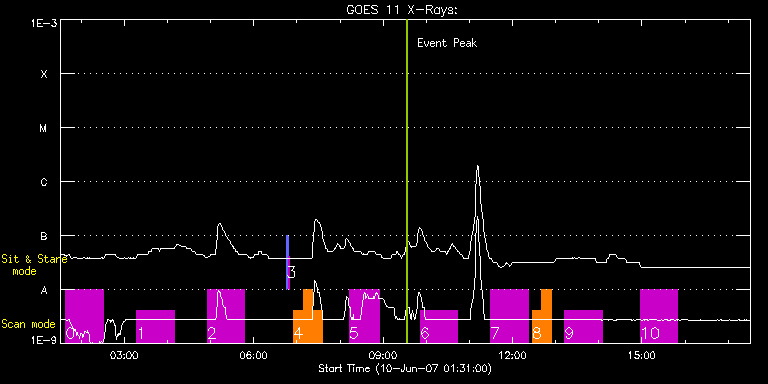 EIS Observation timeline overlay to GOES-Xray curve Code 1" 2" 40" 266" EIS Observations list for this event: STUDY ACRONYM ID DATE OBSERVED DESCRIPTION NOAA# TARGET 0 el_loop_diagn_sumer | 3103 | 2007/06/10 01:38:12 | AR loop diagnostics with SUMER | | Active Region TIMELINE ID DATE OBSERVED FITS FILE XCEN (+W/-E) YCEN (+N/-S) DUR ----------------------------------------------------------------------------------------------------------------- 3103 | 2007/06/10 01:38:12.000 | eis_l0_20070610_013812.fits.gz | 518.72 | 255.84 | 52m25s 1 el_loop_diagn_sumer | 3104 | 2007/06/10 03:17:12 | AR loop diagnostics with SUMER | | Active Region TIMELINE ID DATE OBSERVED FITS FILE XCEN (+W/-E) YCEN (+N/-S) DUR ----------------------------------------------------------------------------------------------------------------- 3104 | 2007/06/10 03:17:12.000 | eis_l0_20070610_031712.fits.gz | 411.65 | 202.23 | 52m25s 2 el_loop_diagn_sumer | 3105 | 2007/06/10 04:55:12 | AR loop diagnostics with SUMER | | Active Region TIMELINE ID DATE OBSERVED FITS FILE XCEN (+W/-E) YCEN (+N/-S) DUR ----------------------------------------------------------------------------------------------------------------- 3105 | 2007/06/10 04:55:12.000 | eis_l0_20070610_045512.fits.gz | 484.42 | 238.72 | 52m25s 3 SYNOP001 | 3106 | 2007/06/10 06:45:34 | SYNOP001_40arcsec_1arcsec_30s_90s | | Quiet Sun TIMELINE ID DATE OBSERVED FITS FILE XCEN (+W/-E) YCEN (+N/-S) DUR ----------------------------------------------------------------------------------------------------------------- 3106 | 2007/06/10 06:45:34.000 | eis_l0_20070610_064534.fits.gz | 0.41 | 70.60 | 2m2s 3106 | 2007/06/10 06:47:50.000 | eis_l0_20070610_064750.fits.gz | 0.41 | 70.51 | 2m1s 4 HH_AR+FLR_RAS_N03 | 3107 | 2007/06/10 06:55:27 | HH_AR+FLR_RAS_N03 (EWxNS=240"x240", 5. | | Active Region TIMELINE ID DATE OBSERVED FITS FILE XCEN (+W/-E) YCEN (+N/-S) DUR ----------------------------------------------------------------------------------------------------------------- 3107 | 2007/06/10 06:55:27.000 | eis_l0_20070610_065527.fits.gz | 497.97 | 235.79 | 13m8s 3107 | 2007/06/10 07:08:38.000 | eis_l0_20070610_070838.fits.gz | 499.57 | 236.66 | 13m7s 3107 | 2007/06/10 07:21:48.000 | eis_l0_20070610_072148.fits.gz | 501.34 | 237.48 | 13m7s 5 el_loop_diagn_sumer | 3108 | 2007/06/10 08:12:27 | AR loop diagnostics with SUMER | 960 | Active Region TIMELINE ID DATE OBSERVED FITS FILE XCEN (+W/-E) YCEN (+N/-S) DUR ----------------------------------------------------------------------------------------------------------------- 3108 | 2007/06/10 08:12:27.000 | eis_l0_20070610_081227.fits.gz | 694.60 | -145.78 | 42m6s 6 el_loop_diagn_sumer | 3109 | 2007/06/10 09:51:12 | AR loop diagnostics with SUMER | | Active Region TIMELINE ID DATE OBSERVED FITS FILE XCEN (+W/-E) YCEN (+N/-S) DUR ----------------------------------------------------------------------------------------------------------------- 3109 | 2007/06/10 09:51:12.000 | eis_l0_20070610_095112.fits.gz | 522.58 | 257.65 | 52m25s 7 el_loop_diagn_sumer | 3110 | 2007/06/10 11:29:12 | AR loop diagnostics with SUMER | | Active Region TIMELINE ID DATE OBSERVED FITS FILE XCEN (+W/-E) YCEN (+N/-S) DUR ----------------------------------------------------------------------------------------------------------------- 3110 | 2007/06/10 11:29:12.000 | eis_l0_20070610_112912.fits.gz | 594.10 | 293.88 | 52m25s 8 HH_AR+FLR_RAS_N03 | 3111 | 2007/06/10 12:27:11 | HH_AR+FLR_RAS_N03 (EWxNS=240"x240", 5. | | Active Region TIMELINE ID DATE OBSERVED FITS FILE XCEN (+W/-E) YCEN (+N/-S) DUR ----------------------------------------------------------------------------------------------------------------- 3111 | 2007/06/10 12:27:11.000 | eis_l0_20070610_122711.fits.gz | 539.52 | 256.49 | 13m7s 3111 | 2007/06/10 12:40:21.000 | eis_l0_20070610_124021.fits.gz | 541.13 | 257.35 | 13m7s 9 el_loop_diagn_sumer | 3112 | 2007/06/10 13:12:27 | AR loop diagnostics with SUMER | | Active Region TIMELINE ID DATE OBSERVED FITS FILE XCEN (+W/-E) YCEN (+N/-S) DUR ----------------------------------------------------------------------------------------------------------------- 3112 | 2007/06/10 13:12:27.000 | eis_l0_20070610_131227.fits.gz | 486.72 | 240.14 | 52m24s 10 el_loop_diagn_sumer | 3113 | 2007/06/10 14:57:42 | AR loop diagnostics with SUMER | | Active Region TIMELINE ID DATE OBSERVED FITS FILE XCEN (+W/-E) YCEN (+N/-S) DUR ----------------------------------------------------------------------------------------------------------------- 3113 | 2007/06/10 14:57:42.000 | eis_l0_20070610_145742.fits.gz | 559.73 | 276.11 | 52m25s : Check study information : Download file : View thumbnails For this event, also check for: