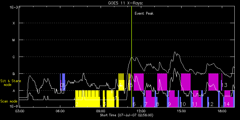 EIS Observation timeline overlay to GOES-Xray curve Code 1" 2" 40" 266" EIS Observations list for this event: STUDY ACRONYM ID DATE OBSERVED DESCRIPTION NOAA# TARGET 0 SYNOP001 | 3598 | 2007/07/07 05:59:34 | SYNOP001_40arcsec_1arcsec_30s_90s | | Quiet Sun TIMELINE ID DATE OBSERVED FITS FILE XCEN (+W/-E) YCEN (+N/-S) DUR ----------------------------------------------------------------------------------------------------------------- 3598 | 2007/07/07 05:59:34.000 | eis_l0_20070707_055934.fits.gz | 0.34 | 70.60 | 2m2s 3598 | 2007/07/07 06:01:50.000 | eis_l0_20070707_060150.fits.gz | 0.33 | 70.62 | 2m1s 1 IUU_SLOT_cntxt_AR_01 | 3599 | 2007/07/07 06:09:34 | Active Region context SLOT images. | | Active Region TIMELINE ID DATE OBSERVED FITS FILE XCEN (+W/-E) YCEN (+N/-S) DUR ----------------------------------------------------------------------------------------------------------------- 3599 | 2007/07/07 06:09:34.000 | eis_l0_20070707_060934.fits.gz | 876.80 | 446.80 | 1m7s 3599 | 2007/07/07 06:10:53.000 | eis_l0_20070707_061053.fits.gz | 876.82 | 446.80 | 1m7s 3599 | 2007/07/07 06:12:12.000 | eis_l0_20070707_061212.fits.gz | 876.91 | 446.88 | 1m7s 3599 | 2007/07/07 06:13:31.000 | eis_l0_20070707_061331.fits.gz | 876.97 | 446.91 | 1m7s 3599 | 2007/07/07 06:14:49.000 | eis_l0_20070707_061449.fits.gz | 877.06 | 446.95 | 1m7s 3599 | 2007/07/07 06:16:08.000 | eis_l0_20070707_061608.fits.gz | 877.09 | 447.04 | 1m7s 3599 | 2007/07/07 06:17:27.000 | eis_l0_20070707_061727.fits.gz | 877.24 | 447.05 | 1m7s 3599 | 2007/07/07 06:18:46.000 | eis_l0_20070707_061846.fits.gz | 877.24 | 447.05 | 1m7s 3599 | 2007/07/07 06:20:05.000 | eis_l0_20070707_062005.fits.gz | 877.35 | 447.10 | 1m7s 3599 | 2007/07/07 06:21:23.000 | eis_l0_20070707_062123.fits.gz | 877.38 | 447.11 | 1m7s 2 DHB_DRW_001 | 3600 | 2007/07/07 07:07:27 | Wide Slot Full FOV Fast Raster | | Coronal Hole TIMELINE ID DATE OBSERVED FITS FILE XCEN (+W/-E) YCEN (+N/-S) DUR ----------------------------------------------------------------------------------------------------------------- 3600 | 2007/07/07 07:07:27.000 | eis_l0_20070707_070727.fits.gz | 730.51 | 411.34 | 1m26s 3600 | 2007/07/07 07:08:58.000 | eis_l0_20070707_070858.fits.gz | 730.62 | 411.40 | 1m26s 3600 | 2007/07/07 07:10:29.000 | eis_l0_20070707_071029.fits.gz | 730.87 | 411.48 | 1m26s 3600 | 2007/07/07 07:12:00.000 | eis_l0_20070707_071200.fits.gz | 730.98 | 411.53 | 1m26s 3600 | 2007/07/07 07:13:31.000 | eis_l0_20070707_071331.fits.gz | 731.09 | 411.56 | 1m26s 3600 | 2007/07/07 07:15:02.000 | eis_l0_20070707_071502.fits.gz | 731.26 | 411.67 | 1m26s 3600 | 2007/07/07 07:16:33.000 | eis_l0_20070707_071633.fits.gz | 731.37 | 411.69 | 1m26s 3600 | 2007/07/07 07:18:05.000 | eis_l0_20070707_071805.fits.gz | 731.57 | 411.83 | 1m25s 3600 | 2007/07/07 07:19:36.000 | eis_l0_20070707_071936.fits.gz | 731.71 | 411.96 | 1m26s 3600 | 2007/07/07 07:21:07.000 | eis_l0_20070707_072107.fits.gz | 731.84 | 412.00 | 1m26s 3600 | 2007/07/07 07:22:38.000 | eis_l0_20070707_072238.fits.gz | 732.03 | 412.11 | 1m26s 3600 | 2007/07/07 07:24:09.000 | eis_l0_20070707_072409.fits.gz | 732.12 | 412.14 | 1m26s 3600 | 2007/07/07 07:25:40.000 | eis_l0_20070707_072540.fits.gz | 732.36 | 412.19 | 1m26s 3600 | 2007/07/07 07:27:11.000 | eis_l0_20070707_072711.fits.gz | 732.42 | 412.33 | 1m26s 3600 | 2007/07/07 07:28:42.000 | eis_l0_20070707_072842.fits.gz | 732.59 | 412.34 | 1m26s 3600 | 2007/07/07 07:30:13.000 | eis_l0_20070707_073013.fits.gz | 732.76 | 412.43 | 1m26s 3600 | 2007/07/07 07:31:44.000 | eis_l0_20070707_073144.fits.gz | 732.89 | 412.51 | 1m26s 3600 | 2007/07/07 07:33:15.000 | eis_l0_20070707_073315.fits.gz | 733.03 | 412.56 | 1m26s 3600 | 2007/07/07 07:34:46.000 | eis_l0_20070707_073446.fits.gz | 733.15 | 412.66 | 1m26s 3600 | 2007/07/07 07:36:17.000 | eis_l0_20070707_073617.fits.gz | 733.30 | 412.70 | 1m26s 3600 | 2007/07/07 07:37:48.000 | eis_l0_20070707_073748.fits.gz | 733.42 | 412.83 | 1m26s 3600 | 2007/07/07 07:39:19.000 | eis_l0_20070707_073919.fits.gz | 733.61 | 412.92 | 1m26s 3600 | 2007/07/07 07:40:50.000 | eis_l0_20070707_074050.fits.gz | 733.73 | 413.00 | 1m26s 3600 | 2007/07/07 07:42:21.000 | eis_l0_20070707_074221.fits.gz | 733.88 | 413.07 | 1m26s 3600 | 2007/07/07 07:43:52.000 | eis_l0_20070707_074352.fits.gz | 734.02 | 413.19 | 1m26s 3600 | 2007/07/07 07:45:23.000 | eis_l0_20070707_074523.fits.gz | 734.15 | 413.17 | 1m26s 3600 | 2007/07/07 07:46:55.000 | eis_l0_20070707_074655.fits.gz | 734.35 | 413.30 | 1m25s 3600 | 2007/07/07 07:49:19.000 | eis_l0_20070707_074919.fits.gz | 734.54 | 413.39 | 1m26s 3600 | 2007/07/07 07:50:50.000 | eis_l0_20070707_075050.fits.gz | 734.72 | 413.48 | 1m26s 3600 | 2007/07/07 07:52:21.000 | eis_l0_20070707_075221.fits.gz | 734.88 | 413.60 | 1m26s 3600 | 2007/07/07 07:53:52.000 | eis_l0_20070707_075352.fits.gz | 735.03 | 413.68 | 1m26s 3600 | 2007/07/07 07:55:23.000 | eis_l0_20070707_075523.fits.gz | 735.10 | 413.67 | 1m26s 3600 | 2007/07/07 07:56:54.000 | eis_l0_20070707_075654.fits.gz | 735.34 | 413.85 | 1m26s 3600 | 2007/07/07 07:58:25.000 | eis_l0_20070707_075825.fits.gz | 735.43 | 413.88 | 1m26s 3600 | 2007/07/07 07:59:56.000 | eis_l0_20070707_075956.fits.gz | 735.62 | 413.97 | 1m26s 3600 | 2007/07/07 08:01:27.000 | eis_l0_20070707_080127.fits.gz | 735.73 | 414.03 | 1m26s 3600 | 2007/07/07 08:02:58.000 | eis_l0_20070707_080258.fits.gz | 735.83 | 414.08 | 1m26s 3600 | 2007/07/07 08:04:29.000 | eis_l0_20070707_080429.fits.gz | 736.04 | 414.18 | 1m26s 3600 | 2007/07/07 08:06:00.000 | eis_l0_20070707_080600.fits.gz | 736.18 | 414.25 | 1m26s 3600 | 2007/07/07 08:07:31.000 | eis_l0_20070707_080731.fits.gz | 736.32 | 414.39 | 1m26s 3600 | 2007/07/07 08:09:02.000 | eis_l0_20070707_080902.fits.gz | 736.49 | 414.46 | 1m26s 3600 | 2007/07/07 08:10:33.000 | eis_l0_20070707_081033.fits.gz | 736.70 | 414.51 | 1m26s 3600 | 2007/07/07 08:12:04.000 | eis_l0_20070707_081204.fits.gz | 736.68 | 414.54 | 1m26s 3600 | 2007/07/07 08:13:35.000 | eis_l0_20070707_081335.fits.gz | 736.89