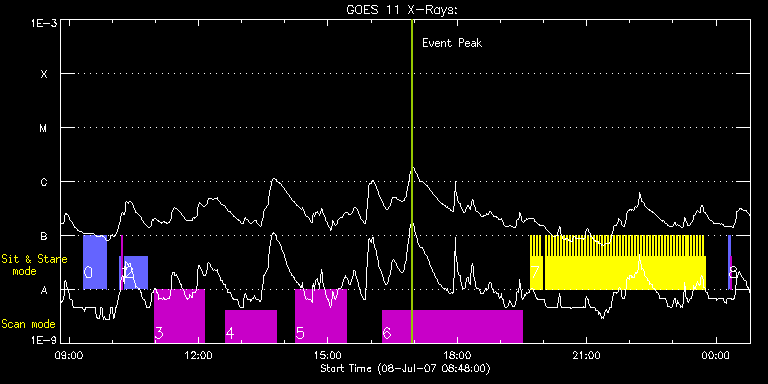 EIS Observation timeline overlay to GOES-Xray curve Code 1" 2" 40" 266" EIS Observations list for this event: STUDY ACRONYM ID DATE OBSERVED DESCRIPTION NOAA# TARGET 0 GAD003_AR_slot30_SAS | 3625 | 2007/07/08 09:20:34 | GAD003_AR_slot30_SAS | | Active Region TIMELINE ID DATE OBSERVED FITS FILE XCEN (+W/-E) YCEN (+N/-S) DUR ----------------------------------------------------------------------------------------------------------------- 3625 | 2007/07/08 09:20:34.000 | eis_l0_20070708_092034.fits.gz | 910.57 | 406.58 | 31m18s 1 SYNOP001 | 3626 | 2007/07/08 10:10:13 | SYNOP001_40arcsec_1arcsec_30s_90s | | Quiet Sun TIMELINE ID DATE OBSERVED FITS FILE XCEN (+W/-E) YCEN (+N/-S) DUR ----------------------------------------------------------------------------------------------------------------- 3626 | 2007/07/08 10:10:13.000 | eis_l0_20070708_101013.fits.gz | 0.43 | 45.60 | 2m1s 3626 | 2007/07/08 10:12:28.000 | eis_l0_20070708_101228.fits.gz | 0.42 | 45.57 | 2m2s 2 GAD003_AR_slot30_SAS | 3627 | 2007/07/08 10:17:34 | GAD003_AR_slot30_SAS | | Active Region TIMELINE ID DATE OBSERVED FITS FILE XCEN (+W/-E) YCEN (+N/-S) DUR ----------------------------------------------------------------------------------------------------------------- 3627 | 2007/07/08 10:17:34.000 | eis_l0_20070708_101734.fits.gz | 855.71 | 378.07 | 31m19s 3 GAD001_AR_rast | 3628 | 2007/07/08 10:58:20 | GAD001_AR_rast | | Active Region TIMELINE ID DATE OBSERVED FITS FILE XCEN (+W/-E) YCEN (+N/-S) DUR ----------------------------------------------------------------------------------------------------------------- 3628 | 2007/07/08 10:58:20.000 | eis_l0_20070708_105820.fits.gz | 911.24 | 406.00 | 1h10m40s 4 GAD001_AR_rast | 3629 | 2007/07/08 12:37:12 | GAD001_AR_rast | | Active Region TIMELINE ID DATE OBSERVED FITS FILE XCEN (+W/-E) YCEN (+N/-S) DUR ----------------------------------------------------------------------------------------------------------------- 3629 | 2007/07/08 12:37:12.000 | eis_l0_20070708_123712.fits.gz | 914.02 | 407.35 | 1h10m42s 5 GAD001_AR_rast | 3630 | 2007/07/08 14:15:12 | GAD001_AR_rast | | Active Region TIMELINE ID DATE OBSERVED FITS FILE XCEN (+W/-E) YCEN (+N/-S) DUR ----------------------------------------------------------------------------------------------------------------- 3630 | 2007/07/08 14:15:12.000 | eis_l0_20070708_141512.fits.gz | 911.22 | 405.95 | 1h10m41s 6 SYNOP002 | 3631 | 2007/07/08 16:15:42 | SYNOP002 | | Quiet Sun TIMELINE ID DATE OBSERVED FITS FILE XCEN (+W/-E) YCEN (+N/-S) DUR ----------------------------------------------------------------------------------------------------------------- 3631 | 2007/07/08 16:15:42.000 | eis_l0_20070708_161542.fits.gz | -1.74 | 26.80 | 3h15m21s 7 Alignment_266 | 3632 | 2007/07/08 19:42:19 | Alignment slot 266 | 963 | Quiet Sun TIMELINE ID DATE OBSERVED FITS FILE XCEN (+W/-E) YCEN (+N/-S) DUR ----------------------------------------------------------------------------------------------------------------- 3632 | 2007/07/08 19:42:19.000 | eis_l0_20070708_194219.fits.gz | 14.35 | 116.66 | 1m23s 3632 | 2007/07/08 19:44:23.000 | eis_l0_20070708_194423.fits.gz | 14.68 | 116.82 | 1m22s 3632 | 2007/07/08 19:46:27.000 | eis_l0_20070708_194627.fits.gz | 14.97 | 116.95 | 1m22s 3632 | 2007/07/08 19:48:31.000 | eis_l0_20070708_194831.fits.gz | 15.33 | 117.13 | 1m22s 3632 | 2007/07/08 19:50:35.000 | eis_l0_20070708_195035.fits.gz | 15.62 | 117.31 | 1m21s 3632 | 2007/07/08 19:52:38.000 | eis_l0_20070708_195238.fits.gz | 15.92 | 117.51 | 1m22s 3632 | 2007/07/08 19:54:42.000 | eis_l0_20070708_195442.fits.gz | 16.23 | 117.63 | 1m22s 3632 | 2007/07/08 19:56:46.000 | eis_l0_20070708_195646.fits.gz | 16.56 | 117.78 | 1m22s 3632 | 2007/07/08 20:02:57.000 | eis_l0_20070708_200257.fits.gz | 0.36 | 574.52 | 1m22s 3632 | 2007/07/08 20:05:01.000 | eis_l0_20070708_200501.fits.gz | 0.35 | 574.47 | 1m22s 3632 | 2007/07/08 20:07:05.000 | eis_l0_20070708_200705.fits.gz | 0.41 | 574.50 | 1m22s 3632 | 2007/07/08 20:09:09.000 | eis_l0_20070708_200909.fits.gz | 0.49 | 574.47 | 1m22s 3632 | 2007/07/08 20:11:13.000 | eis_l0_20070708_201113.fits.gz | 0.48 | 574.51 | 1m22s 3632 | 2007/07/08 20:13:16.000 | eis_l0_20070708_201316.fits.gz | 0.47 | 574.50 | 1m22s 3632 | 2007/07/08 20:15:20.000 | eis_l0_20070708_201520.fits.gz | 0.41 | 574.51 | 1m22s 3632 | 2007/07/08 20:17:24.000 | eis_l0_20070708_201724.fits.gz | 0.48 | 574.54 | 1m22s 3632 | 2007/07/08 20:19:28.000 | eis_l0_20070708_201928.fits.gz | 0.46 | 574.48 | 1m21s 3632 | 2007/07/08 20:21:31.000 | eis_l0_20070708_202131.fits.gz | 0.50 | 574.49 | 1m22s 3632 | 2007/07/08 20:23:35.000 | eis_l0_20070708_202335.fits.gz | 0.44 | 574.54 | 1m22s 3632 | 2007/07/08 20:25:39.000 | eis_l0_20070708_202539.fits.gz | 0.45 | 574.49 | 1m22s 3632 | 2007/07/08 20:27:43.000 | eis_l0_20070708_202743.fits.gz | 0.43 | 574.45 | 1m22s 3632 | 2007/07/08 20:29:47.000 | eis_l0_20070708_202947.fits.gz | 0.38 | 574.50 | 1m22s 3632 | 2007/07/08 20:31:51.000 | eis_l0_20070708_203151.fits.gz | 0.37 | 574.48 | 1m22s 3632 | 2007/07/08 20:33:54.000 | eis_l0_20070708_203354.fits.gz | 0.40 | 574.46 | 1m22s 3632 | 2007/07/08 20:35:58.000 | eis_l0_20070708_203558.fits.gz | 0.53 | 574.52 | 1m22s 3632 | 2007/07/08 20:38:02.000 | eis_l0_20070708_203802.fits.gz | 0.45 | 574.48 | 1m22s 3632 | 2007/07/08 20:40:06.000 | eis_l0_20070708_204006.fits.gz | 0.41 | 574.58 | 1m22s 3632 | 2007/07/08 20:42:10.000 | eis_l0_20070708_204210.fits.gz | 0.42 | 574.57 | 1m22s 3632 | 2007/07/08 20:44:13.000 | eis_l0_20070708_204413.fits.gz | 0.46 | 574.51 | 1m22s 3632 | 2007/07/08 20:46:17.000 | eis_l0_20070708_204617.fits.gz | 0.48 | 574.52 | 1m22s 3632 | 2007/07/08 20:48:21.000 | eis_l0_20070708_204821.fits.gz | 0.47 | 574.48 | 1m22s 3632 | 2007/07/08 20:50:25.000 | eis_l0_20070708_205025.fits.gz | 0.29 | 574.52 | 1m22s 3632 | 2007/07/08 20:52:28.000 | eis_l0_20070708_205228.fits.gz | 0.44 | 574.52 | 1m22s 3632 | 2007/07/08 20:54:32.000 | eis_l0_20070708_205432.fits.gz | 0.40 | 574.50 | 1m22s 36