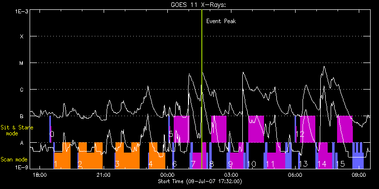 EIS Observation timeline overlay to GOES-Xray curve Code 1" 2" 40" 266" EIS Observations list for this event: STUDY ACRONYM ID DATE OBSERVED DESCRIPTION NOAA# TARGET 0 SYNOP001 | 3652 | 2007/07/09 18:28:13 | SYNOP001_40arcsec_1arcsec_30s_90s | | Quiet Sun TIMELINE ID DATE OBSERVED FITS FILE XCEN (+W/-E) YCEN (+N/-S) DUR ----------------------------------------------------------------------------------------------------------------- 3652 | 2007/07/09 18:28:13.000 | eis_l0_20070709_182813.fits.gz | 0.52 | 45.68 | 2m1s 3652 | 2007/07/09 18:30:28.000 | eis_l0_20070709_183028.fits.gz | 0.42 | 45.64 | 2m2s 1 PRY_footpoints_v2 | 3653 | 2007/07/09 18:38:34 | Loop footpoints study - many cool line | | Active Region TIMELINE ID DATE OBSERVED FITS FILE XCEN (+W/-E) YCEN (+N/-S) DUR ----------------------------------------------------------------------------------------------------------------- 3653 | 2007/07/09 18:38:34.000 | eis_l0_20070709_183834.fits.gz | 460.49 | 694.85 | 2m57s 3653 | 2007/07/09 18:41:57.000 | eis_l0_20070709_184157.fits.gz | 442.43 | 617.91 | 22m6s 3653 | 2007/07/09 19:04:07.000 | eis_l0_20070709_190407.fits.gz | 443.65 | 618.50 | 22m7s 2 PRY_footpoints_v2 | 3654 | 2007/07/09 19:46:20 | Loop footpoints study - many cool line | | Active Region TIMELINE ID DATE OBSERVED FITS FILE XCEN (+W/-E) YCEN (+N/-S) DUR ----------------------------------------------------------------------------------------------------------------- 3654 | 2007/07/09 19:46:20.000 | eis_l0_20070709_194620.fits.gz | 464.11 | 696.80 | 2m56s 3654 | 2007/07/09 19:49:42.000 | eis_l0_20070709_194942.fits.gz | 446.09 | 619.81 | 22m8s 3654 | 2007/07/09 20:11:54.000 | eis_l0_20070709_201154.fits.gz | 447.29 | 620.45 | 22m8s 3654 | 2007/07/09 20:34:07.000 | eis_l0_20070709_203407.fits.gz | 448.53 | 621.07 | 22m6s 3 PRY_footpoints_v2 | 3655 | 2007/07/09 21:31:20 | Loop footpoints study - many cool line | | Active Region TIMELINE ID DATE OBSERVED FITS FILE XCEN (+W/-E) YCEN (+N/-S) DUR ----------------------------------------------------------------------------------------------------------------- 3655 | 2007/07/09 21:31:20.000 | eis_l0_20070709_213120.fits.gz | 469.73 | 699.79 | 2m56s 3655 | 2007/07/09 21:34:42.000 | eis_l0_20070709_213442.fits.gz | 451.79 | 622.77 | 22m8s 3655 | 2007/07/09 21:56:54.000 | eis_l0_20070709_215654.fits.gz | 452.97 | 623.36 | 22m8s 3655 | 2007/07/09 22:19:06.000 | eis_l0_20070709_221906.fits.gz | 454.06 | 624.02 | 22m8s 4 PRY_footpoints_v2 | 3656 | 2007/07/09 23:05:20 | Loop footpoints study - many cool line | | Active Region TIMELINE ID DATE OBSERVED FITS FILE XCEN (+W/-E) YCEN (+N/-S) DUR ----------------------------------------------------------------------------------------------------------------- 3656 | 2007/07/09 23:05:20.000 | eis_l0_20070709_230520.fits.gz | 474.63 | 702.35 | 2m56s 3656 | 2007/07/09 23:08:42.000 | eis_l0_20070709_230842.fits.gz | 456.64 | 625.40 | 22m7s 3656 | 2007/07/09 23:30:54.000 | eis_l0_20070709_233054.fits.gz | 457.84 | 626.00 | 22m7s 5 SYNOP001 | 3657 | 2007/07/10 00:03:20 | SYNOP001_40arcsec_1arcsec_30s_90s | | Quiet Sun TIMELINE ID DATE OBSERVED FITS FILE XCEN (+W/-E) YCEN (+N/-S) DUR ----------------------------------------------------------------------------------------------------------------- 3657 | 2007/07/10 00:03:20.000 | eis_l0_20070710_000320.fits.gz | 0.37 | 45.57 | 2m1s 3657 | 2007/07/10 00:05:35.000 | eis_l0_20070710_000535.fits.gz | 0.41 | 45.55 | 2m1s 6 ARdiag_sns | 3658 | 2007/07/10 00:13:34 | AR loop temperature and density analys | 963 | Active Region TIMELINE ID DATE OBSERVED FITS FILE XCEN (+W/-E) YCEN (+N/-S) DUR ----------------------------------------------------------------------------------------------------------------- 3658 | 2007/07/10 00:13:34.000 | eis_l0_20070710_001334.fits.gz | -790.52 | -353.42 | 5m9s 3658 | 2007/07/10 00:18:55.000 | eis_l0_20070710_001855.fits.gz | -805.12 | -360.65 | 10s 3658 | 2007/07/10 00:19:08.000 | eis_l0_20070710_001908.fits.gz | -805.05 | -360.67 | 10s 3658 | 2007/07/10 00:19:20.000 | eis_l0_20070710_001920.fits.gz | -804.97 | -360.61 | 11s 3658 | 2007/07/10 00:19:33.000 | eis_l0_20070710_001933.fits.gz | -805.00 | -360.61 | 10s 3658 | 2007/07/10 00:19:46.000 | eis_l0_20070710_001946.fits.gz | -804.96 | -360.57 | 10s 3658 | 2007/07/10 00:19:59.000 | eis_l0_20070710_001959.fits.gz | -804.97 | -360.61 | 10s 3658 | 2007/07/10 00:20:12.000 | eis_l0_20070710_002012.fits.gz | -804.88 | -360.56 | 10s 3658 | 2007/07/10 00:20:25.000 | eis_l0_20070710_002025.fits.gz | -804.97 | -360.57 | 10s 3658 | 2007/07/10 00:20:38.000 | eis_l0_20070710_002038.fits.gz | -804.90 | -360.52 | 10s 3658 | 2007/07/10 00:20:50.000 | eis_l0_20070710_002050.fits.gz | -804.90 | -360.58 | 10s 3658 | 2007/07/10 00:21:03.000 | eis_l0_20070710_002103.fits.gz | -804.85 | -360.54 | 10s 3658 | 2007/07/10 00:21:16.000 | eis_l0_20070710_002116.fits.gz | -804.90 | -360.58 | 10s 3658 | 2007/07/10 00:21:29.000 | eis_l0_20070710_002129.fits.gz | -804.84 | -360.51 | 10s 3658 | 2007/07/10 00:21:42.000 | eis_l0_20070710_002142.fits.gz | -804.82 | -360.54 | 10s 3658 | 2007/07/10 00:21:55.000 | eis_l0_20070710_002155.fits.gz | -804.81 | -360.47 | 10s 3658 | 2007/07/10 00:22:08.000 | eis_l0_20070710_002208.fits.gz | -804.79 | -360.52 | 10s 3658 | 2007/07/10 00:22:20.000 | eis_l0_20070710_002220.fits.gz | -804.74 | -360.46 | 11s 3658 | 2007/07/10 00:22:33.000 | eis_l0_20070710_002233.fits.gz | -804.82 | -360.47 | 10s 3658 | 2007/07/10 00:22:46.000 | eis_l0_20070710_002246.fits.gz | -804.84 | -360.51 | 10s 3658 | 2007/07/10 00:22:59.000 | eis_l0_20070710_002259.fits.gz | -804.74 | -360.46 | 10s 3658 | 2007/07/10 00:23:12.000 | eis_l0_20070710_002312.fits.gz | -804.63 | -360.39 | 10s 3658 | 2007/07/10 00:23:24.000 | eis_l0_20070710_002324.fits.gz | -804.74 | -360.50 | 11s 3658 | 2007/07/10 00:23:37.000 | eis_l0_20070710_002337.fits.gz | -804.74 | -360.46 | 10s 3658 | 2007/07/10 00:23:50.000 | eis_l0_20070710_002350.fits.gz | -804.58 | -360.41 | 10s 36