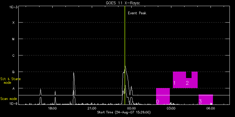 EIS Observation timeline overlay to GOES-Xray curve Code 1" 2" 40" 266" EIS Observations list for this event: STUDY ACRONYM ID DATE OBSERVED DESCRIPTION NOAA# TARGET 0 HPW008_FULLCCD_v2 | 4386 | 2007/08/25 01:51:52 | HPW008_FULLCCD_RAST_128x256_25s_SLIT1_ | 969 | Active Region TIMELINE ID DATE OBSERVED FITS FILE XCEN (+W/-E) YCEN (+N/-S) DUR ----------------------------------------------------------------------------------------------------------------- 4386 | 2007/08/25 01:51:52.000 | eis_l0_20070825_015152.fits.gz | -587.24 | -214.11 | 1h1m32s 1 HPW012_AR_SAS_060M | 4387 | 2007/08/25 03:09:13 | HPW012_AR_SAS_060M | | Active Region TIMELINE ID DATE OBSERVED FITS FILE XCEN (+W/-E) YCEN (+N/-S) DUR ----------------------------------------------------------------------------------------------------------------- 4387 | 2007/08/25 03:09:13.000 | eis_l0_20070825_030913.fits.gz | -481.51 | -235.70 | 57m25s 2 HPW012_AR_SAS_060M | 4388 | 2007/08/25 04:07:21 | HPW012_AR_SAS_060M | | Active Region TIMELINE ID DATE OBSERVED FITS FILE XCEN (+W/-E) YCEN (+N/-S) DUR ----------------------------------------------------------------------------------------------------------------- 4388 | 2007/08/25 04:07:21.000 | eis_l0_20070825_040721.fits.gz | -475.92 | -236.42 | 26m23s 4388 | 2007/08/25 04:33:48.000 | eis_l0_20070825_043348.fits.gz | -472.40 | -236.57 | 26m22s 3 HPW008_FULLCCD_v2 | 4389 | 2007/08/25 05:05:29 | HPW008_FULLCCD_RAST_128x256_25s_SLIT1_ | 969 | Active Region TIMELINE ID DATE OBSERVED FITS FILE XCEN (+W/-E) YCEN (+N/-S) DUR ----------------------------------------------------------------------------------------------------------------- 4389 | 2007/08/25 05:05:29.000 | eis_l0_20070825_050529.fits.gz | -558.50 | -215.76 | 1h4m39s : Check study information : Download file : View thumbnails For this event, also check for: