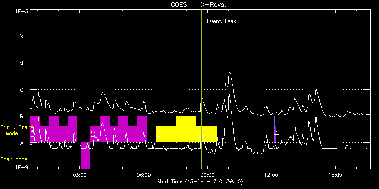 EIS Observation timeline overlay to GOES-Xray curve Code 1" 2" 40" 266" EIS Observations list for this event: STUDY ACRONYM ID DATE OBSERVED DESCRIPTION NOAA# TARGET 0 HPW012_AR_SAS_060M | 6370 | 2007/12/13 00:40:13 | Sit and Stare at AR 10978 (fan) | | Active Region TIMELINE ID DATE OBSERVED FITS FILE XCEN (+W/-E) YCEN (+N/-S) DUR ----------------------------------------------------------------------------------------------------------------- 6370 | 2007/12/13 00:40:13.000 | eis_l0_20071213_004013.fits.gz | 105.17 | -168.09 | 26m22s 6370 | 2007/12/13 01:06:39.000 | eis_l0_20071213_010639.fits.gz | 109.26 | -168.03 | 26m22s 6370 | 2007/12/13 01:33:05.000 | eis_l0_20071213_013305.fits.gz | 113.22 | -167.91 | 26m21s 6370 | 2007/12/13 01:59:30.000 | eis_l0_20071213_015930.fits.gz | 117.22 | -168.04 | 26m22s 6370 | 2007/12/13 02:25:56.000 | eis_l0_20071213_022556.fits.gz | 121.28 | -168.26 | 26m21s 1 HPW013_AR_RAS_23m | 6371 | 2007/12/13 03:05:13 | Sit and Stare at AR 10978 (core) | | Active Region TIMELINE ID DATE OBSERVED FITS FILE XCEN (+W/-E) YCEN (+N/-S) DUR ----------------------------------------------------------------------------------------------------------------- 6371 | 2007/12/13 03:05:13.000 | eis_l0_20071213_030513.fits.gz | 247.38 | -118.04 | 21m37s 2 HPW012_AR_SAS_060M | 6372 | 2007/12/13 03:30:13 | Sit and Stare at AR 10978 (core) | | Active Region TIMELINE ID DATE OBSERVED FITS FILE XCEN (+W/-E) YCEN (+N/-S) DUR ----------------------------------------------------------------------------------------------------------------- 6372 | 2007/12/13 03:30:13.000 | eis_l0_20071213_033013.fits.gz | 250.99 | -117.92 | 26m22s 6372 | 2007/12/13 03:56:39.000 | eis_l0_20071213_035639.fits.gz | 254.96 | -117.97 | 26m22s 6372 | 2007/12/13 04:23:05.000 | eis_l0_20071213_042305.fits.gz | 258.94 | -117.85 | 26m21s 6372 | 2007/12/13 04:49:30.000 | eis_l0_20071213_044930.fits.gz | 262.96 | -117.66 | 26m22s 6372 | 2007/12/13 05:15:56.000 | eis_l0_20071213_051556.fits.gz | 266.96 | -117.72 | 26m21s 6372 | 2007/12/13 05:42:21.000 | eis_l0_20071213_054221.fits.gz | 270.93 | -117.78 | 26m22s 3 HPW014_SLOT266_MOVIE | 6368 | 2007/12/13 06:35:19 | Fe XV 266" slot movie of AR 10978 | 978 | Active Region TIMELINE ID DATE OBSERVED FITS FILE XCEN (+W/-E) YCEN (+N/-S) DUR ----------------------------------------------------------------------------------------------------------------- 6368 | 2007/12/13 06:35:19.000 | eis_l0_20071213_063519.fits.gz | 281.08 | -167.63 | 56m18s 6368 | 2007/12/13 07:31:41.000 | eis_l0_20071213_073141.fits.gz | 289.50 | -167.57 | 56m17s 6368 | 2007/12/13 08:28:01.000 | eis_l0_20071213_082801.fits.gz | 297.87 | -167.66 | 56m19s 4 SYNOP001 | 6375 | 2007/12/13 12:07:40 | SYNOP001_40arcsec_1arcsec_30s_90s | | Quiet Sun TIMELINE ID DATE OBSERVED FITS FILE XCEN (+W/-E) YCEN (+N/-S) DUR ----------------------------------------------------------------------------------------------------------------- 6375 | 2007/12/13 12:07:40.000 | eis_l0_20071213_120740.fits.gz | 0.36 | -36.81 | 2m2s 6375 | 2007/12/13 12:09:56.000 | eis_l0_20071213_120956.fits.gz | 0.41 | -36.76 | 2m1s : Check study information : Download file : View thumbnails For this event, also check for: