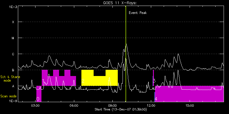 EIS Observation timeline overlay to GOES-Xray curve Code 1" 2" 40" 266" EIS Observations list for this event: STUDY ACRONYM ID DATE OBSERVED DESCRIPTION NOAA# TARGET 0 HPW013_AR_RAS_23m | 6371 | 2007/12/13 03:05:13 | Sit and Stare at AR 10978 (core) | | Active Region TIMELINE ID DATE OBSERVED FITS FILE XCEN (+W/-E) YCEN (+N/-S) DUR ----------------------------------------------------------------------------------------------------------------- 6371 | 2007/12/13 03:05:13.000 | eis_l0_20071213_030513.fits.gz | 247.38 | -118.04 | 21m37s 1 HPW012_AR_SAS_060M | 6372 | 2007/12/13 03:30:13 | Sit and Stare at AR 10978 (core) | | Active Region TIMELINE ID DATE OBSERVED FITS FILE XCEN (+W/-E) YCEN (+N/-S) DUR ----------------------------------------------------------------------------------------------------------------- 6372 | 2007/12/13 03:30:13.000 | eis_l0_20071213_033013.fits.gz | 250.99 | -117.92 | 26m22s 6372 | 2007/12/13 03:56:39.000 | eis_l0_20071213_035639.fits.gz | 254.96 | -117.97 | 26m22s 6372 | 2007/12/13 04:23:05.000 | eis_l0_20071213_042305.fits.gz | 258.94 | -117.85 | 26m21s 6372 | 2007/12/13 04:49:30.000 | eis_l0_20071213_044930.fits.gz | 262.96 | -117.66 | 26m22s 6372 | 2007/12/13 05:15:56.000 | eis_l0_20071213_051556.fits.gz | 266.96 | -117.72 | 26m21s 6372 | 2007/12/13 05:42:21.000 | eis_l0_20071213_054221.fits.gz | 270.93 | -117.78 | 26m22s 2 HPW014_SLOT266_MOVIE | 6368 | 2007/12/13 06:35:19 | Fe XV 266" slot movie of AR 10978 | 978 | Active Region TIMELINE ID DATE OBSERVED FITS FILE XCEN (+W/-E) YCEN (+N/-S) DUR ----------------------------------------------------------------------------------------------------------------- 6368 | 2007/12/13 06:35:19.000 | eis_l0_20071213_063519.fits.gz | 281.08 | -167.63 | 56m18s 6368 | 2007/12/13 07:31:41.000 | eis_l0_20071213_073141.fits.gz | 289.50 | -167.57 | 56m17s 6368 | 2007/12/13 08:28:01.000 | eis_l0_20071213_082801.fits.gz | 297.87 | -167.66 | 56m19s 3 SYNOP001 | 6375 | 2007/12/13 12:07:40 | SYNOP001_40arcsec_1arcsec_30s_90s | | Quiet Sun TIMELINE ID DATE OBSERVED FITS FILE XCEN (+W/-E) YCEN (+N/-S) DUR ----------------------------------------------------------------------------------------------------------------- 6375 | 2007/12/13 12:07:40.000 | eis_l0_20071213_120740.fits.gz | 0.36 | -36.81 | 2m2s 6375 | 2007/12/13 12:09:56.000 | eis_l0_20071213_120956.fits.gz | 0.41 | -36.76 | 2m1s 4 AR_velocity_map_v2 | 6376 | 2007/12/13 12:15:33 | Large field of view raster on AR 10978 | 978 | Active Region TIMELINE ID DATE OBSERVED FITS FILE XCEN (+W/-E) YCEN (+N/-S) DUR ----------------------------------------------------------------------------------------------------------------- 6376 | 2007/12/13 12:15:33.000 | eis_l0_20071213_121533.fits.gz | 347.54 | -167.43 | 2m57s 6376 | 2007/12/13 12:18:42.000 | eis_l0_20071213_121842.fits.gz | 346.70 | -133.62 | 5h19m31s : Check study information : Download file : View thumbnails For this event, also check for: