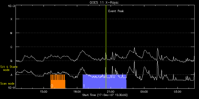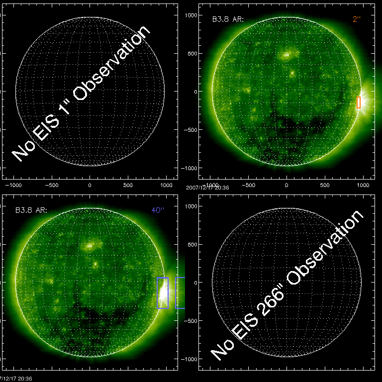 EIS Observation timeline overlay to GOES-Xray curve Code 1" 2" 40" 266" EIS Observations list for this event: STUDY ACRONYM ID DATE OBSERVED DESCRIPTION NOAA# TARGET 0 CAM_ARTB_RHESSI_b_2 | 6405 | 2007/12/17 15:38:13 | AR microflares and TR response - AR 10 | 978 | Active Region TIMELINE ID DATE OBSERVED FITS FILE XCEN (+W/-E) YCEN (+N/-S) DUR ----------------------------------------------------------------------------------------------------------------- 6405 | 2007/12/17 15:38:13.000 | eis_l0_20071217_153813.fits.gz | 942.38 | -146.55 | 3m52s 6405 | 2007/12/17 15:42:08.000 | eis_l0_20071217_154208.fits.gz | 942.34 | -146.51 | 3m52s 6405 | 2007/12/17 15:46:03.000 | eis_l0_20071217_154603.fits.gz | 942.34 | -146.59 | 3m52s 6405 | 2007/12/17 15:49:58.000 | eis_l0_20071217_154958.fits.gz | 942.31 | -146.55 | 3m52s 6405 | 2007/12/17 15:53:52.000 | eis_l0_20071217_155352.fits.gz | 942.38 | -146.55 | 3m52s 6405 | 2007/12/17 15:57:47.000 | eis_l0_20071217_155747.fits.gz | 942.38 | -146.57 | 3m52s 6405 | 2007/12/17 16:01:42.000 | eis_l0_20071217_160142.fits.gz | 942.40 | -146.63 | 3m52s 6405 | 2007/12/17 16:05:37.000 | eis_l0_20071217_160537.fits.gz | 942.37 | -146.63 | 3m51s 6405 | 2007/12/17 16:09:31.000 | eis_l0_20071217_160931.fits.gz | 942.37 | -146.63 | 3m52s 6405 | 2007/12/17 16:13:26.000 | eis_l0_20071217_161326.fits.gz | 942.35 | -146.58 | 3m51s 6405 | 2007/12/17 16:17:20.000 | eis_l0_20071217_161720.fits.gz | 942.25 | -146.63 | 3m52s 6405 | 2007/12/17 16:21:15.000 | eis_l0_20071217_162115.fits.gz | 942.34 | -146.58 | 3m52s 6405 | 2007/12/17 16:25:10.000 | eis_l0_20071217_162510.fits.gz | 942.37 | -146.51 | 3m51s 6405 | 2007/12/17 16:29:04.000 | eis_l0_20071217_162904.fits.gz | 942.37 | -146.63 | 3m52s 6405 | 2007/12/17 16:32:59.000 | eis_l0_20071217_163259.fits.gz | 942.37 | -146.59 | 3m52s 6405 | 2007/12/17 16:36:54.000 | eis_l0_20071217_163654.fits.gz | 942.34 | -146.52 | 3m52s 6405 | 2007/12/17 16:40:48.000 | eis_l0_20071217_164048.fits.gz | 942.38 | -146.55 | 3m52s 6405 | 2007/12/17 16:44:43.000 | eis_l0_20071217_164443.fits.gz | 942.38 | -146.70 | 3m52s 6405 | 2007/12/17 16:48:37.000 | eis_l0_20071217_164837.fits.gz | 942.30 | -146.40 | 3m52s 6405 | 2007/12/17 16:52:32.000 | eis_l0_20071217_165232.fits.gz | 942.32 | -146.52 | 3m52s 1 IUU_SLOT_148X400 | 6406 | 2007/12/17 18:30:20 | Slot Raster Movie on AR 10978 | 978 | Active Region TIMELINE ID DATE OBSERVED FITS FILE XCEN (+W/-E) YCEN (+N/-S) DUR ----------------------------------------------------------------------------------------------------------------- 6406 | 2007/12/17 18:30:20.000 | eis_l0_20071217_183020.fits.gz | 951.37 | -142.65 | 1m5s 6406 | 2007/12/17 18:31:30.000 | eis_l0_20071217_183130.fits.gz | 951.36 | -142.64 | 1m5s 6406 | 2007/12/17 18:32:40.000 | eis_l0_20071217_183240.fits.gz | 951.28 | -142.70 | 1m6s 6406 | 2007/12/17 18:33:51.000 | eis_l0_20071217_183351.fits.gz | 951.38 | -142.55 | 1m5s 6406 | 2007/12/17 18:35:01.000 | eis_l0_20071217_183501.fits.gz | 951.42 | -142.64 | 1m5s 6406 | 2007/12/17 18:36:11.000 | eis_l0_20071217_183611.fits.gz | 951.38 | -142.61 | 1m5s 6406 | 2007/12/17 18:37:21.000 | eis_l0_20071217_183721.fits.gz | 951.33 | -142.68 | 1m5s 6406 | 2007/12/17 18:38:31.000 | eis_l0_20071217_183831.fits.gz | 951.34 | -142.54 | 1m5s 6406 | 2007/12/17 18:39:41.000 | eis_l0_20071217_183941.fits.gz | 951.38 | -142.47 | 1m5s 6406 | 2007/12/17 18:40:51.000 | eis_l0_20071217_184051.fits.gz | 951.36 | -142.74 | 1m5s 6406 | 2007/12/17 18:42:01.000 | eis_l0_20071217_184201.fits.gz | 951.36 | -142.55 | 1m5s 6406 | 2007/12/17 18:43:11.000 | eis_l0_20071217_184311.fits.gz | 951.34 | -142.32 | 1m5s 6406 | 2007/12/17 18:44:21.000 | eis_l0_20071217_184421.fits.gz | 951.40 | -142.59 | 1m5s 6406 | 2007/12/17 18:45:32.000 | eis_l0_20071217_184532.fits.gz | 951.41 | -142.55 | 1m4s 6406 | 2007/12/17 18:46:41.000 | eis_l0_20071217_184641.fits.gz | 951.28 | -142.55 | 1m6s 6406 | 2007/12/17 18:47:52.000 | eis_l0_20071217_184752.fits.gz | 951.36 | -142.52 | 1m5s 6406 | 2007/12/17 18:49:02.000 | eis_l0_20071217_184902.fits.gz | 951.39 | -142.70 | 1m5s 6406 | 2007/12/17 18:50:12.000 | eis_l0_20071217_185012.fits.gz | 951.27 | -142.52 | 1m5s 6406 | 2007/12/17 18:51:22.000 | eis_l0_20071217_185122.fits.gz | 951.28 | -142.57 | 1m5s 6406 | 2007/12/17 18:52:32.000 | eis_l0_20071217_185232.fits.gz | 951.35 | -142.60 | 1m5s 6406 | 2007/12/17 18:53:42.000 | eis_l0_20071217_185342.fits.gz | 951.28 | -142.41 | 1m5s 6406 | 2007/12/17 18:54:52.000 | eis_l0_20071217_185452.fits.gz | 951.36 | -142.42 | 1m5s 6406 | 2007/12/17 18:56:02.000 | eis_l0_20071217_185602.fits.gz | 951.38 | -142.47 | 1m5s 6406 | 2007/12/17 18:57:12.000 | eis_l0_20071217_185712.fits.gz | 951.39 | -142.50 | 1m5s 6406 | 2007/12/17 18:58:22.000 | eis_l0_20071217_185822.fits.gz | 951.36 | -142.53 | 1m5s 6406 | 2007/12/17 18:59:32.000 | eis_l0_20071217_185932.fits.gz | 951.40 | -142.47 | 1m5s 6406 | 2007/12/17 19:00:42.000 | eis_l0_20071217_190042.fits.gz | 951.36 | -142.62 | 1m5s 6406 | 2007/12/17 19:01:52.000 | eis_l0_20071217_190152.fits.gz | 951.28 | -142.55 | 1m5s 6406 | 2007/12/17 19:03:03.000 | eis_l0_20071217_190303.fits.gz | 951.36 | -142.63 | 1m5s 6406 | 2007/12/17 19:04:13.000 | eis_l0_20071217_190413.fits.gz | 951.36 | -142.63 | 1m5s 6406 | 2007/12/17 19:05:23.000 | eis_l0_20071217_190523.fits.gz | 951.31 | -142.59 | 1m5s 6406 | 2007/12/17 19:06:33.000 | eis_l0_20071217_190633.fits.gz | 951.33 | -142.57 | 1m5s 6406 | 2007/12/17 19:07:43.000 | eis_l0_20071217_190743.fits.gz | 951.35 | -142.63 | 1m5s 6406 | 2007/12/17 19:08:53.000 | eis_l0_20071217_190853.fits.gz | 951.35 | -142.55 | 1m5s 6406 | 2007/12/17 19:10:03.000 | eis_l0_20071217_191003.fits.gz | 951.32 | -142.63 | 1m5s 6406 | 2007/12/17 19:11:13.000 | eis_l0_20071217_191113.fits.gz | 951.33 | -142.56 | 1m5s 6406 | 2007/12/17 19:12:23.000 | eis_l0_20071217_191223.fits.gz | 951.32 | -142.50 | 1m5s 6406 | 2007/12/17 19:13:33.000 | eis_l0_20071217_191333.fits.gz | 951.36 | -142.63 | 1m5s 6406 | 2007/12/17 