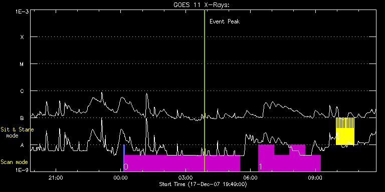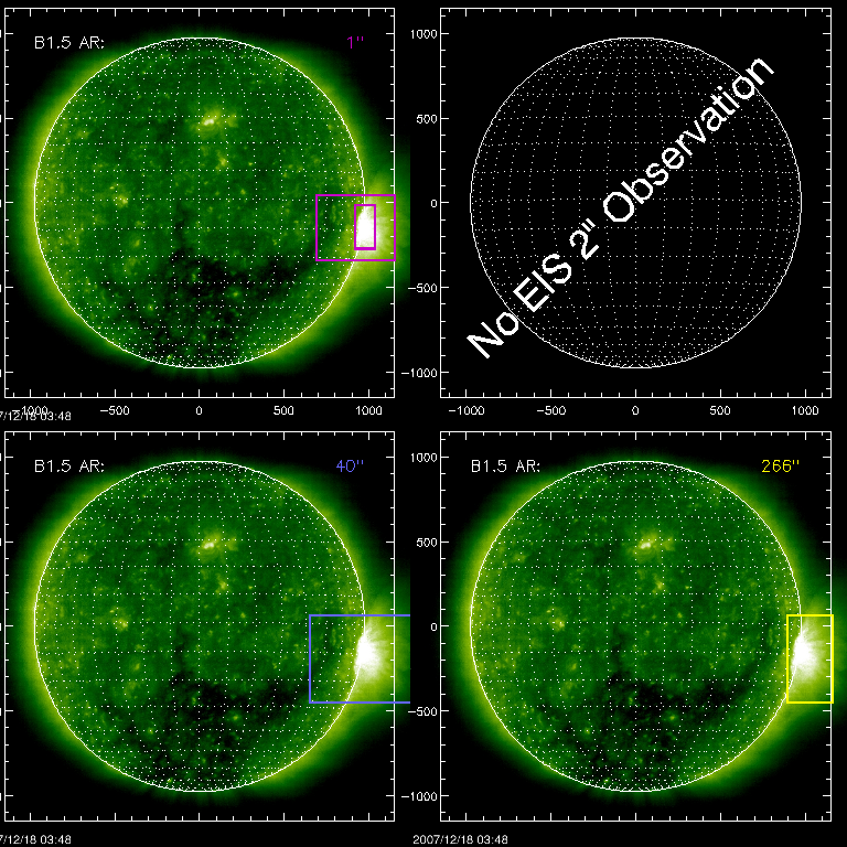 EIS Observation timeline overlay to GOES-Xray curve Code 1" 2" 40" 266" EIS Observations list for this event: STUDY ACRONYM ID DATE OBSERVED DESCRIPTION NOAA# TARGET 0 AR_velocity_map_v2 | 6407 | 2007/12/18 00:07:41 | Detailed, large format raster on AR 10 | 978 | Active Region TIMELINE ID DATE OBSERVED FITS FILE XCEN (+W/-E) YCEN (+N/-S) DUR ----------------------------------------------------------------------------------------------------------------- 6407 | 2007/12/18 00:07:41.000 | eis_l0_20071218_000741.fits.gz | 951.40 | -196.59 | 2m57s 6407 | 2007/12/18 00:10:49.000 | eis_l0_20071218_001049.fits.gz | 923.90 | -151.43 | 5h19m31s 1 TW_AR110 | 6408 | 2007/12/18 06:21:47 | Study of lower loops in active region | 978 | Active Region TIMELINE ID DATE OBSERVED FITS FILE XCEN (+W/-E) YCEN (+N/-S) DUR ----------------------------------------------------------------------------------------------------------------- 6408 | 2007/12/18 06:21:47.000 | eis_l0_20071218_062147.fits.gz | 981.10 | -146.47 | 43m20s 6408 | 2007/12/18 07:05:10.000 | eis_l0_20071218_070510.fits.gz | 981.06 | -146.62 | 43m19s 6408 | 2007/12/18 07:48:32.000 | eis_l0_20071218_074832.fits.gz | 981.07 | -146.56 | 43m20s 6408 | 2007/12/18 08:31:55.000 | eis_l0_20071218_083155.fits.gz | 981.00 | -146.53 | 43m19s 2 Alignment_266 | 6409 | 2007/12/18 09:57:19 | Wide-slot observations of AR at limb | 978 | Quiet Sun TIMELINE ID DATE OBSERVED FITS FILE XCEN (+W/-E) YCEN (+N/-S) DUR ----------------------------------------------------------------------------------------------------------------- 6409 | 2007/12/18 09:57:19.000 | eis_l0_20071218_095719.fits.gz | 1031.48 | -196.40 | 1m22s 6409 | 2007/12/18 09:59:23.000 | eis_l0_20071218_095923.fits.gz | 1031.44 | -196.46 | 1m22s 6409 | 2007/12/18 10:01:27.000 | eis_l0_20071218_100127.fits.gz | 1031.53 | -196.63 | 1m22s 6409 | 2007/12/18 10:03:31.000 | eis_l0_20071218_100331.fits.gz | 1031.46 | -196.55 | 1m22s 6409 | 2007/12/18 10:05:34.000 | eis_l0_20071218_100534.fits.gz | 1031.46 | -196.49 | 1m23s 6409 | 2007/12/18 10:07:38.000 | eis_l0_20071218_100738.fits.gz | 1031.50 | -196.51 | 1m22s 6409 | 2007/12/18 10:09:42.000 | eis_l0_20071218_100942.fits.gz | 1031.46 | -196.58 | 1m22s 6409 | 2007/12/18 10:11:46.000 | eis_l0_20071218_101146.fits.gz | 1031.44 | -196.57 | 1m22s 6409 | 2007/12/18 10:13:50.000 | eis_l0_20071218_101350.fits.gz | 1031.51 | -196.63 | 1m22s 6409 | 2007/12/18 10:15:53.000 | eis_l0_20071218_101553.fits.gz | 1031.54 | -196.76 | 1m23s 6409 | 2007/12/18 10:17:57.000 | eis_l0_20071218_101757.fits.gz | 1031.52 | -196.63 | 1m22s 6409 | 2007/12/18 10:20:01.000 | eis_l0_20071218_102001.fits.gz | 1031.44 | -196.55 | 1m22s 6409 | 2007/12/18 10:22:05.000 | eis_l0_20071218_102205.fits.gz | 1031.53 | -196.72 | 1m22s 6409 | 2007/12/18 10:24:09.000 | eis_l0_20071218_102409.fits.gz | 1031.45 | -196.41 | 1m22s 6409 | 2007/12/18 10:26:12.000 | eis_l0_20071218_102612.fits.gz | 1031.46 | -196.58 | 1m22s 6409 | 2007/12/18 10:28:16.000 | eis_l0_20071218_102816.fits.gz | 1031.44 | -196.58 | 1m22s 6409 | 2007/12/18 10:30:20.000 | eis_l0_20071218_103020.fits.gz | 1031.46 | -196.66 | 1m22s 6409 | 2007/12/18 10:32:24.000 | eis_l0_20071218_103224.fits.gz | 1031.48 | -196.65 | 1m22s 6409 | 2007/12/18 10:34:28.000 | eis_l0_20071218_103428.fits.gz | 1031.47 | -196.52 | 1m22s 6409 | 2007/12/18 10:36:32.000 | eis_l0_20071218_103632.fits.gz | 1031.48 | -196.49 | 1m22s 6409 | 2007/12/18 10:38:35.000 | eis_l0_20071218_103835.fits.gz | 1031.48 | -196.63 | 1m22s 6409 | 2007/12/18 10:40:39.000 | eis_l0_20071218_104039.fits.gz | 1031.52 | -196.53 | 1m22s 6409 | 2007/12/18 10:42:43.000 | eis_l0_20071218_104243.fits.gz | 1031.44 | -196.70 | 1m22s 6409 | 2007/12/18 10:44:47.000 | eis_l0_20071218_104447.fits.gz | 1031.48 | -196.81 | 1m22s 6409 | 2007/12/18 10:46:50.000 | eis_l0_20071218_104650.fits.gz | 1031.39 | -196.57 | 1m22s : Check study information : Download file : View thumbnails For this event, also check for:
