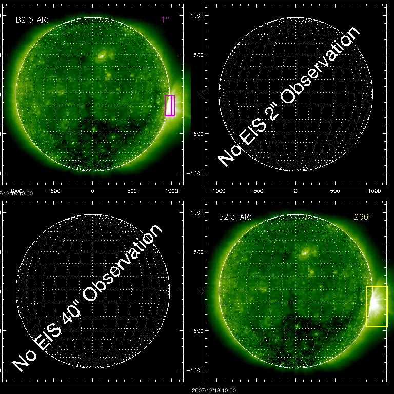 EIS Observation timeline overlay to GOES-Xray curve Code 1" 2" 40" 266" EIS Observations list for this event: STUDY ACRONYM ID DATE OBSERVED DESCRIPTION NOAA# TARGET 0 TW_AR110 | 6408 | 2007/12/18 06:21:47 | Study of lower loops in active region | 978 | Active Region TIMELINE ID DATE OBSERVED FITS FILE XCEN (+W/-E) YCEN (+N/-S) DUR ----------------------------------------------------------------------------------------------------------------- 6408 | 2007/12/18 06:21:47.000 | eis_l0_20071218_062147.fits.gz | 981.10 | -146.47 | 43m20s 6408 | 2007/12/18 07:05:10.000 | eis_l0_20071218_070510.fits.gz | 981.06 | -146.62 | 43m19s 6408 | 2007/12/18 07:48:32.000 | eis_l0_20071218_074832.fits.gz | 981.07 | -146.56 | 43m20s 6408 | 2007/12/18 08:31:55.000 | eis_l0_20071218_083155.fits.gz | 981.00 | -146.53 | 43m19s 1 Alignment_266 | 6409 | 2007/12/18 09:57:19 | Wide-slot observations of AR at limb | 978 | Quiet Sun TIMELINE ID DATE OBSERVED FITS FILE XCEN (+W/-E) YCEN (+N/-S) DUR ----------------------------------------------------------------------------------------------------------------- 6409 | 2007/12/18 09:57:19.000 | eis_l0_20071218_095719.fits.gz | 1031.48 | -196.40 | 1m22s 6409 | 2007/12/18 09:59:23.000 | eis_l0_20071218_095923.fits.gz | 1031.44 | -196.46 | 1m22s 6409 | 2007/12/18 10:01:27.000 | eis_l0_20071218_100127.fits.gz | 1031.53 | -196.63 | 1m22s 6409 | 2007/12/18 10:03:31.000 | eis_l0_20071218_100331.fits.gz | 1031.46 | -196.55 | 1m22s 6409 | 2007/12/18 10:05:34.000 | eis_l0_20071218_100534.fits.gz | 1031.46 | -196.49 | 1m23s 6409 | 2007/12/18 10:07:38.000 | eis_l0_20071218_100738.fits.gz | 1031.50 | -196.51 | 1m22s 6409 | 2007/12/18 10:09:42.000 | eis_l0_20071218_100942.fits.gz | 1031.46 | -196.58 | 1m22s 6409 | 2007/12/18 10:11:46.000 | eis_l0_20071218_101146.fits.gz | 1031.44 | -196.57 | 1m22s 6409 | 2007/12/18 10:13:50.000 | eis_l0_20071218_101350.fits.gz | 1031.51 | -196.63 | 1m22s 6409 | 2007/12/18 10:15:53.000 | eis_l0_20071218_101553.fits.gz | 1031.54 | -196.76 | 1m23s 6409 | 2007/12/18 10:17:57.000 | eis_l0_20071218_101757.fits.gz | 1031.52 | -196.63 | 1m22s 6409 | 2007/12/18 10:20:01.000 | eis_l0_20071218_102001.fits.gz | 1031.44 | -196.55 | 1m22s 6409 | 2007/12/18 10:22:05.000 | eis_l0_20071218_102205.fits.gz | 1031.53 | -196.72 | 1m22s 6409 | 2007/12/18 10:24:09.000 | eis_l0_20071218_102409.fits.gz | 1031.45 | -196.41 | 1m22s 6409 | 2007/12/18 10:26:12.000 | eis_l0_20071218_102612.fits.gz | 1031.46 | -196.58 | 1m22s 6409 | 2007/12/18 10:28:16.000 | eis_l0_20071218_102816.fits.gz | 1031.44 | -196.58 | 1m22s 6409 | 2007/12/18 10:30:20.000 | eis_l0_20071218_103020.fits.gz | 1031.46 | -196.66 | 1m22s 6409 | 2007/12/18 10:32:24.000 | eis_l0_20071218_103224.fits.gz | 1031.48 | -196.65 | 1m22s 6409 | 2007/12/18 10:34:28.000 | eis_l0_20071218_103428.fits.gz | 1031.47 | -196.52 | 1m22s 6409 | 2007/12/18 10:36:32.000 | eis_l0_20071218_103632.fits.gz | 1031.48 | -196.49 | 1m22s 6409 | 2007/12/18 10:38:35.000 | eis_l0_20071218_103835.fits.gz | 1031.48 | -196.63 | 1m22s 6409 | 2007/12/18 10:40:39.000 | eis_l0_20071218_104039.fits.gz | 1031.52 | -196.53 | 1m22s 6409 | 2007/12/18 10:42:43.000 | eis_l0_20071218_104243.fits.gz | 1031.44 | -196.70 | 1m22s 6409 | 2007/12/18 10:44:47.000 | eis_l0_20071218_104447.fits.gz | 1031.48 | -196.81 | 1m22s 6409 | 2007/12/18 10:46:50.000 | eis_l0_20071218_104650.fits.gz | 1031.39 | -196.57 | 1m22s 2 DRW001_HI_BRT_V2 | 6411 | 2007/12/18 11:20:34 | Coronal rain programme with SOT and XR | | Quiet Sun TIMELINE ID DATE OBSERVED FITS FILE XCEN (+W/-E) YCEN (+N/-S) DUR ----------------------------------------------------------------------------------------------------------------- 6411 | 2007/12/18 11:20:34.000 | eis_l0_20071218_112034.fits.gz | 1001.08 | -146.53 | 2m37s 6411 | 2007/12/18 11:23:15.000 | eis_l0_20071218_112315.fits.gz | 1001.01 | -146.55 | 2m37s 6411 | 2007/12/18 11:25:56.000 | eis_l0_20071218_112556.fits.gz | 1001.03 | -146.66 | 2m37s 6411 | 2007/12/18 11:28:37.000 | eis_l0_20071218_112837.fits.gz | 1001.01 | -146.70 | 2m37s 6411 | 2007/12/18 11:31:18.000 | eis_l0_20071218_113118.fits.gz | 1000.94 | -146.44 | 2m37s 6411 | 2007/12/18 11:34:00.000 | eis_l0_20071218_113400.fits.gz | 1001.06 | -146.47 | 2m36s 6411 | 2007/12/18 11:36:40.000 | eis_l0_20071218_113640.fits.gz | 1001.01 | -146.44 | 2m37s 6411 | 2007/12/18 11:39:21.000 | eis_l0_20071218_113921.fits.gz | 1001.02 | -146.56 | 2m37s 6411 | 2007/12/18 11:42:03.000 | eis_l0_20071218_114203.fits.gz | 1000.95 | -146.60 | 2m37s 6411 | 2007/12/18 11:44:44.000 | eis_l0_20071218_114444.fits.gz | 1001.00 | -146.60 | 2m37s 6411 | 2007/12/18 11:47:25.000 | eis_l0_20071218_114725.fits.gz | 1000.98 | -146.54 | 2m37s 6411 | 2007/12/18 11:50:06.000 | eis_l0_20071218_115006.fits.gz | 1001.01 | -146.51 | 2m37s 6411 | 2007/12/18 11:52:47.000 | eis_l0_20071218_115247.fits.gz | 1000.99 | -146.40 | 2m37s 6411 | 2007/12/18 11:55:28.000 | eis_l0_20071218_115528.fits.gz | 1001.08 | -146.66 | 2m37s 6411 | 2007/12/18 11:58:09.000 | eis_l0_20071218_115809.fits.gz | 1001.02 | -146.56 | 2m37s 6411 | 2007/12/18 12:00:51.000 | eis_l0_20071218_120051.fits.gz | 1001.04 | -146.55 | 2m36s 6411 | 2007/12/18 12:03:31.000 | eis_l0_20071218_120331.fits.gz | 1001.03 | -146.69 | 2m37s 6411 | 2007/12/18 12:06:13.000 | eis_l0_20071218_120613.fits.gz | 1000.99 | -146.55 | 2m37s 6411 | 2007/12/18 12:08:54.000 | eis_l0_20071218_120854.fits.gz | 1001.02 | -146.58 | 2m37s 6411 | 2007/12/18 12:11:35.000 | eis_l0_20071218_121135.fits.gz | 1001.06 | -146.63 | 2m37s 6411 | 2007/12/18 12:14:16.000 | eis_l0_20071218_121416.fits.gz | 1001.03 | -146.59 | 2m37s 6411 | 2007/12/18 12:16:57.000 | eis_l0_20071218_121657.fits.gz | 1001.03 | -146.63 | 2m37s 6411 | 2007/12/18 12:19:38.000 | eis_l0_20071218_121938.fits.gz | 1001.14 | -146.55 | 2m37s 6411 | 2007/12/18 12:22:19.000 | eis_l0_20071218_122219.fits.gz | 1000.99 | -146.62 | 2m37s 6411 | 2007/12/18 12:25:01.000 | eis_l0_20071218_122501.fits.gz | 1000.94 | -146.65 | 2m36s 6411 | 2007/12/18 1