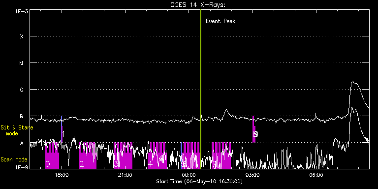 EIS Observation timeline overlay to GOES-Xray curve Code 1" 2" 40" 266" EIS Observations list for this event: STUDY ACRONYM ID DATE OBSERVED DESCRIPTION NOAA# TARGET 0 VHH_SlowAR_5m_V2 | 17153 | 2010/05/06 17:14:10 | Sparse rasters monitoring AR 11068 | 1069 | Active Region TIMELINE ID DATE OBSERVED FITS FILE XCEN (+W/-E) YCEN (+N/-S) DUR ----------------------------------------------------------------------------------------------------------------- 17153 | 2010/05/06 17:14:10.000 | eis_l0_20100506_171410.fits.gz | 666.17 | 667.87 | 4m43s 17153 | 2010/05/06 17:18:56.000 | eis_l0_20100506_171856.fits.gz | 666.48 | 667.79 | 4m44s 17153 | 2010/05/06 17:23:43.000 | eis_l0_20100506_172343.fits.gz | 666.86 | 667.72 | 4m44s 17153 | 2010/05/06 17:28:30.000 | eis_l0_20100506_172830.fits.gz | 667.25 | 667.56 | 4m43s 17153 | 2010/05/06 17:33:16.000 | eis_l0_20100506_173316.fits.gz | 667.56 | 667.56 | 4m44s 17153 | 2010/05/06 17:38:03.000 | eis_l0_20100506_173803.fits.gz | 667.94 | 667.56 | 4m43s 17153 | 2010/05/06 17:42:49.000 | eis_l0_20100506_174249.fits.gz | 668.25 | 667.56 | 4m44s 17153 | 2010/05/06 17:47:36.000 | eis_l0_20100506_174736.fits.gz | 668.56 | 667.56 | 4m43s 1 SYNOP005_A | 17161 | 2010/05/06 17:58:34 | | | Quiet Sun TIMELINE ID DATE OBSERVED FITS FILE XCEN (+W/-E) YCEN (+N/-S) DUR ----------------------------------------------------------------------------------------------------------------- 17161 | 2010/05/06 17:58:34.000 | eis_l0_20100506_175834.fits.gz | 0.48 | 12.20 | 1m30s 17161 | 2010/05/06 18:00:15.000 | eis_l0_20100506_180015.fits.gz | 0.40 | 12.20 | 1m30s 2 VHH_SlowAR_5m_V2 | 17154 | 2010/05/06 18:50:13 | Sparse rasters monitoring AR 11068 | 1069 | Active Region TIMELINE ID DATE OBSERVED FITS FILE XCEN (+W/-E) YCEN (+N/-S) DUR ----------------------------------------------------------------------------------------------------------------- 17154 | 2010/05/06 18:50:13.000 | eis_l0_20100506_185013.fits.gz | 673.20 | 667.17 | 4m43s 17154 | 2010/05/06 18:54:59.000 | eis_l0_20100506_185459.fits.gz | 673.51 | 667.17 | 4m44s 17154 | 2010/05/06 18:59:46.000 | eis_l0_20100506_185946.fits.gz | 673.97 | 667.02 | 4m43s 17154 | 2010/05/06 19:04:32.000 | eis_l0_20100506_190432.fits.gz | 674.20 | 667.17 | 4m44s 17154 | 2010/05/06 19:09:19.000 | eis_l0_20100506_190919.fits.gz | 674.51 | 667.25 | 4m43s 17154 | 2010/05/06 19:14:05.000 | eis_l0_20100506_191405.fits.gz | 674.90 | 667.02 | 4m44s 17154 | 2010/05/06 19:18:52.000 | eis_l0_20100506_191852.fits.gz | 675.28 | 667.02 | 4m44s 17154 | 2010/05/06 19:23:39.000 | eis_l0_20100506_192339.fits.gz | 675.67 | 666.87 | 4m44s 17154 | 2010/05/06 19:28:26.000 | eis_l0_20100506_192826.fits.gz | 675.90 | 666.87 | 4m43s 17154 | 2010/05/06 19:33:12.000 | eis_l0_20100506_193312.fits.gz | 676.29 | 666.87 | 4m43s 3 VHH_SlowAR_5m_V2 | 17155 | 2010/05/06 20:27:13 | Sparse rasters monitoring AR 11068 | 1069 | Active Region TIMELINE ID DATE OBSERVED FITS FILE XCEN (+W/-E) YCEN (+N/-S) DUR ----------------------------------------------------------------------------------------------------------------- 17155 | 2010/05/06 20:27:13.000 | eis_l0_20100506_202713.fits.gz | 680.15 | 666.64 | 4m43s 17155 | 2010/05/06 20:31:59.000 | eis_l0_20100506_203159.fits.gz | 680.61 | 666.71 | 4m44s 17155 | 2010/05/06 20:36:46.000 | eis_l0_20100506_203646.fits.gz | 680.92 | 666.64 | 4m44s 17155 | 2010/05/06 20:41:33.000 | eis_l0_20100506_204133.fits.gz | 681.31 | 666.48 | 4m43s 17155 | 2010/05/06 20:46:19.000 | eis_l0_20100506_204619.fits.gz | 681.62 | 666.40 | 4m44s 17155 | 2010/05/06 20:51:06.000 | eis_l0_20100506_205106.fits.gz | 681.93 | 666.40 | 4m43s 17155 | 2010/05/06 20:55:52.000 | eis_l0_20100506_205552.fits.gz | 682.23 | 666.56 | 4m44s 17155 | 2010/05/06 21:00:38.000 | eis_l0_20100506_210038.fits.gz | 682.62 | 666.40 | 4m44s 17155 | 2010/05/06 21:05:25.000 | eis_l0_20100506_210525.fits.gz | 683.01 | 666.40 | 4m43s 17155 | 2010/05/06 21:10:11.000 | eis_l0_20100506_211011.fits.gz | 683.32 | 666.40 | 4m44s 17155 | 2010/05/06 21:14:58.000 | eis_l0_20100506_211458.fits.gz | 683.55 | 666.40 | 4m44s 4 VHH_SlowAR_5m_V2 | 17156 | 2010/05/06 22:04:13 | Sparse rasters monitoring AR 11068 | 1069 | Active Region TIMELINE ID DATE OBSERVED FITS FILE XCEN (+W/-E) YCEN (+N/-S) DUR ----------------------------------------------------------------------------------------------------------------- 17156 | 2010/05/06 22:04:13.000 | eis_l0_20100506_220413.fits.gz | 687.18 | 666.09 | 4m44s 17156 | 2010/05/06 22:09:00.000 | eis_l0_20100506_220900.fits.gz | 687.57 | 665.94 | 4m43s 17156 | 2010/05/06 22:13:46.000 | eis_l0_20100506_221346.fits.gz | 687.87 | 665.94 | 4m43s 17156 | 2010/05/06 22:18:32.000 | eis_l0_20100506_221832.fits.gz | 688.11 | 666.02 | 4m44s 17156 | 2010/05/06 22:23:19.000 | eis_l0_20100506_222319.fits.gz | 688.41 | 666.02 | 4m44s 17156 | 2010/05/06 22:28:06.000 | eis_l0_20100506_222806.fits.gz | 688.88 | 665.86 | 4m44s 17156 | 2010/05/06 22:32:53.000 | eis_l0_20100506_223253.fits.gz | 689.19 | 665.71 | 4m44s 17156 | 2010/05/06 22:37:40.000 | eis_l0_20100506_223740.fits.gz | 689.50 | 665.78 | 4m43s 17156 | 2010/05/06 22:42:26.000 | eis_l0_20100506_224226.fits.gz | 689.88 | 665.94 | 4m44s 17156 | 2010/05/06 22:47:13.000 | eis_l0_20100506_224713.fits.gz | 690.19 | 665.78 | 4m44s 17156 | 2010/05/06 22:52:00.000 | eis_l0_20100506_225200.fits.gz | 690.50 | 665.71 | 4m43s 5 PRY_slot_contextLITE | 17157 | 2010/05/06 23:37:03 | Sparse rasters monitoring AR 11068 | 1069 | Active Region TIMELINE ID DATE OBSERVED FITS FILE XCEN (+W/-E) YCEN (+N/-S) DUR ----------------------------------------------------------------------------------------------------------------- 17157 | 2010/05/06 23:37:03.000 | eis_l0_20100506_233703.fits.gz | 789.44 | 645.48 | 2m56s 6 VHH_SlowAR_5m_V2 | 17158 | 2010/05/06 23:41:19 | Sparse rasters monitoring AR 11068 | 1069 | Active Region TIMELINE ID DATE OBSERVED FITS FILE XCEN (+W/-E) YCEN (+N/-S) DUR ----------------------------------------------------------------