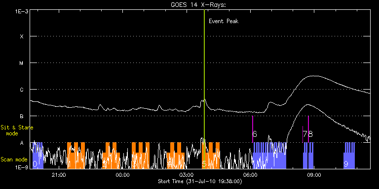 EIS Observation timeline overlay to GOES-Xray curve Code 1" 2" 40" 266" EIS Observations list for this event: STUDY ACRONYM ID DATE OBSERVED DESCRIPTION NOAA# TARGET 0 PRY_slot_contextLITE | 18571 | 2010/07/31 19:46:13 | Active region slot context | 1092 | Active Region TIMELINE ID DATE OBSERVED FITS FILE XCEN (+W/-E) YCEN (+N/-S) DUR ----------------------------------------------------------------------------------------------------------------- 18571 | 2010/07/31 19:46:13.000 | eis_l0_20100731_194613.fits.gz | -552.12 | 106.10 | 2m56s 18571 | 2010/07/31 19:49:13.000 | eis_l0_20100731_194913.fits.gz | -551.81 | 106.18 | 2m56s 18571 | 2010/07/31 19:52:13.000 | eis_l0_20100731_195213.fits.gz | -551.42 | 106.18 | 2m56s 18571 | 2010/07/31 19:55:12.000 | eis_l0_20100731_195512.fits.gz | -551.03 | 105.95 | 2m57s 18571 | 2010/07/31 19:58:12.000 | eis_l0_20100731_195812.fits.gz | -550.57 | 106.02 | 2m56s 18571 | 2010/07/31 20:01:12.000 | eis_l0_20100731_200112.fits.gz | -550.34 | 105.95 | 2m56s 18571 | 2010/07/31 20:04:12.000 | eis_l0_20100731_200412.fits.gz | -550.03 | 106.02 | 2m56s 18571 | 2010/07/31 20:07:12.000 | eis_l0_20100731_200712.fits.gz | -549.65 | 105.87 | 2m56s 18571 | 2010/07/31 20:10:12.000 | eis_l0_20100731_201012.fits.gz | -549.26 | 105.79 | 2m56s 18571 | 2010/07/31 20:13:12.000 | eis_l0_20100731_201312.fits.gz | -548.79 | 105.87 | 2m57s 1 madj_ar | 18574 | 2010/07/31 21:24:03 | Active region studies | 1092 | Active Region TIMELINE ID DATE OBSERVED FITS FILE XCEN (+W/-E) YCEN (+N/-S) DUR ----------------------------------------------------------------------------------------------------------------- 18574 | 2010/07/31 21:24:03.000 | eis_l0_20100731_212403.fits.gz | -525.40 | 105.25 | 9m42s 18574 | 2010/07/31 21:33:49.000 | eis_l0_20100731_213349.fits.gz | -524.17 | 105.10 | 9m42s 18574 | 2010/07/31 21:43:34.000 | eis_l0_20100731_214334.fits.gz | -522.93 | 104.94 | 9m41s 18574 | 2010/07/31 21:53:18.000 | eis_l0_20100731_215318.fits.gz | -521.77 | 104.94 | 9m42s 18574 | 2010/07/31 22:03:03.000 | eis_l0_20100731_220303.fits.gz | -520.54 | 104.79 | 9m42s 2 madj_ar | 18575 | 2010/07/31 23:02:25 | Active region studies | 1092 | Active Region TIMELINE ID DATE OBSERVED FITS FILE XCEN (+W/-E) YCEN (+N/-S) DUR ----------------------------------------------------------------------------------------------------------------- 18575 | 2010/07/31 23:02:25.000 | eis_l0_20100731_230225.fits.gz | -513.20 | 104.25 | 9m42s 18575 | 2010/07/31 23:12:10.000 | eis_l0_20100731_231210.fits.gz | -511.96 | 104.25 | 9m41s 18575 | 2010/07/31 23:21:55.000 | eis_l0_20100731_232155.fits.gz | -510.80 | 104.09 | 9m42s 18575 | 2010/07/31 23:31:40.000 | eis_l0_20100731_233140.fits.gz | -509.57 | 104.02 | 9m42s 18575 | 2010/07/31 23:41:25.000 | eis_l0_20100731_234125.fits.gz | -508.26 | 103.94 | 9m42s 3 madj_ar | 18576 | 2010/08/01 00:26:37 | Active region studies | 1092 | Active Region TIMELINE ID DATE OBSERVED FITS FILE XCEN (+W/-E) YCEN (+N/-S) DUR ----------------------------------------------------------------------------------------------------------------- 18576 | 2010/08/01 00:26:37.000 | eis_l0_20100801_002637.fits.gz | -502.62 | 103.71 | 9m42s 18576 | 2010/08/01 00:36:22.000 | eis_l0_20100801_003622.fits.gz | -501.46 | 103.71 | 9m42s 18576 | 2010/08/01 00:46:07.000 | eis_l0_20100801_004607.fits.gz | -500.22 | 103.40 | 9m42s 18576 | 2010/08/01 00:55:52.000 | eis_l0_20100801_005552.fits.gz | -498.98 | 103.40 | 9m42s 18576 | 2010/08/01 01:05:37.000 | eis_l0_20100801_010537.fits.gz | -497.67 | 103.24 | 9m42s 4 madj_ar | 18577 | 2010/08/01 02:04:51 | Active region studies | | Active Region TIMELINE ID DATE OBSERVED FITS FILE XCEN (+W/-E) YCEN (+N/-S) DUR ----------------------------------------------------------------------------------------------------------------- 18577 | 2010/08/01 02:04:51.000 | eis_l0_20100801_020451.fits.gz | -490.18 | 102.63 | 9m42s 18577 | 2010/08/01 02:14:36.000 | eis_l0_20100801_021436.fits.gz | -489.02 | 102.70 | 9m42s 18577 | 2010/08/01 02:24:21.000 | eis_l0_20100801_022421.fits.gz | -487.71 | 102.55 | 9m42s 18577 | 2010/08/01 02:34:06.000 | eis_l0_20100801_023406.fits.gz | -486.47 | 102.39 | 9m41s 18577 | 2010/08/01 02:43:51.000 | eis_l0_20100801_024351.fits.gz | -485.31 | 102.39 | 9m41s 5 madj_ar | 18578 | 2010/08/01 03:43:04 | Active region studies | | Active Region TIMELINE ID DATE OBSERVED FITS FILE XCEN (+W/-E) YCEN (+N/-S) DUR ----------------------------------------------------------------------------------------------------------------- 18578 | 2010/08/01 03:43:04.000 | eis_l0_20100801_034304.fits.gz | -477.67 | 102.01 | 9m42s 18578 | 2010/08/01 03:52:49.000 | eis_l0_20100801_035249.fits.gz | -476.35 | 101.78 | 9m41s 18578 | 2010/08/01 04:02:33.000 | eis_l0_20100801_040233.fits.gz | -475.19 | 101.78 | 9m43s 18578 | 2010/08/01 04:12:19.000 | eis_l0_20100801_041219.fits.gz | -473.96 | 101.62 | 9m42s 18578 | 2010/08/01 04:22:04.000 | eis_l0_20100801_042204.fits.gz | -472.64 | 101.54 | 9m42s 6 Alignment_modify_v2 | 18559 | 2010/08/01 06:05:26 | Co-alignment north limb | | Quiet Sun TIMELINE ID DATE OBSERVED FITS FILE XCEN (+W/-E) YCEN (+N/-S) DUR ----------------------------------------------------------------------------------------------------------------- 18559 | 2010/08/01 06:05:26.000 | eis_l0_20100801_060526.fits.gz | -0.10 | 944.62 | 1m1s 18559 | 2010/08/01 06:06:52.000 | eis_l0_20100801_060652.fits.gz | -9.66 | 944.62 | 2m34s 18559 | 2010/08/01 06:09:59.000 | eis_l0_20100801_060959.fits.gz | -9.50 | 944.55 | 2m34s 18559 | 2010/08/01 06:13:07.000 | eis_l0_20100801_061307.fits.gz | -9.43 | 944.47 | 2m34s 18559 | 2010/08/01 06:16:14.000 | eis_l0_20100801_061614.fits.gz | -9.58 | 944.62 | 2m34s 18559 | 2010/08/01 06:19:22.000 | eis_l0_20100801_061922.fits.gz | -9.58 | 944.55 | 2m34s 18559 | 2010/08/01 06:22:30.000 | eis_l0_20100801_062230.fits.gz | -9.50 | 944.55 | 2m33s 18559 | 2010/08/01 06:25:37.000 | eis_l0_20100801_062537.fits.gz | -9.58 | 944.47 | 2m34s 18559 | 2010/