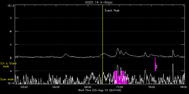 EIS Observation timeline overlay to GOES-Xray curve Code 1" 2" 40" 266" EIS Observations list for this event: STUDY ACRONYM ID DATE OBSERVED DESCRIPTION NOAA# TARGET 0 YK_AR_50x384 | 18609 | 2010/08/03 11:28:21 | HOP 78: Study of Oscillatory Magneto-C | | Active Region TIMELINE ID DATE OBSERVED FITS FILE XCEN (+W/-E) YCEN (+N/-S) DUR ----------------------------------------------------------------------------------------------------------------- 18609 | 2010/08/03 11:28:21.000 | eis_l0_20100803_112821.fits.gz | -16.54 | 106.19 | 18m23s 18609 | 2010/08/03 11:46:48.000 | eis_l0_20100803_114648.fits.gz | -13.76 | 106.12 | 18m24s 18609 | 2010/08/03 12:05:15.000 | eis_l0_20100803_120515.fits.gz | -11.06 | 106.19 | 18m23s 18609 | 2010/08/03 12:23:42.000 | eis_l0_20100803_122342.fits.gz | -8.27 | 106.04 | 18m23s 1 regcal071 | 18619 | 2010/08/03 15:18:12 | Dark exposures, CCD bottom rows (100s | | Engineering TIMELINE ID DATE OBSERVED FITS FILE XCEN (+W/-E) YCEN (+N/-S) DUR ----------------------------------------------------------------------------------------------------------------- 18619 | 2010/08/03 15:18:12.000 | eis_l0_20100803_151812.fits.gz | 37.92 | -232.12 | 3m22s 2 regcal072 | 18620 | 2010/08/03 15:22:01 | Dark exposures, top CCD rows (100s exp | | Engineering TIMELINE ID DATE OBSERVED FITS FILE XCEN (+W/-E) YCEN (+N/-S) DUR ----------------------------------------------------------------------------------------------------------------- 18620 | 2010/08/03 15:22:01.000 | eis_l0_20100803_152201.fits.gz | 38.38 | 278.96 | 3m21s : Check study information : Download file : View thumbnails For this event, also check for: