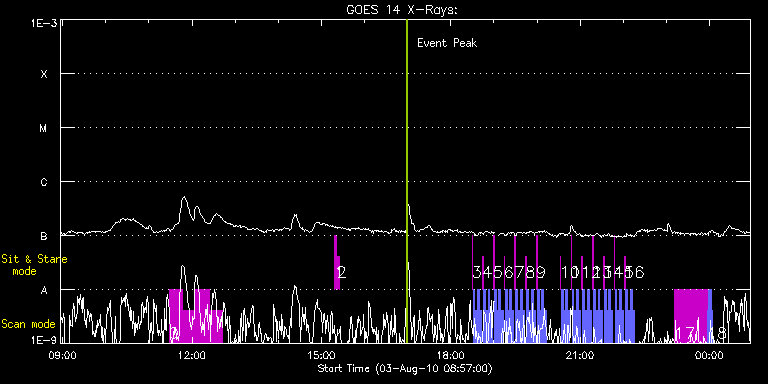 EIS Observation timeline overlay to GOES-Xray curve Code 1" 2" 40" 266" EIS Observations list for this event: STUDY ACRONYM ID DATE OBSERVED DESCRIPTION NOAA# TARGET 0 YK_AR_50x384 | 18609 | 2010/08/03 11:28:21 | HOP 78: Study of Oscillatory Magneto-C | | Active Region TIMELINE ID DATE OBSERVED FITS FILE XCEN (+W/-E) YCEN (+N/-S) DUR ----------------------------------------------------------------------------------------------------------------- 18609 | 2010/08/03 11:28:21.000 | eis_l0_20100803_112821.fits.gz | -16.54 | 106.19 | 18m23s 18609 | 2010/08/03 11:46:48.000 | eis_l0_20100803_114648.fits.gz | -13.76 | 106.12 | 18m24s 18609 | 2010/08/03 12:05:15.000 | eis_l0_20100803_120515.fits.gz | -11.06 | 106.19 | 18m23s 18609 | 2010/08/03 12:23:42.000 | eis_l0_20100803_122342.fits.gz | -8.27 | 106.04 | 18m23s 1 regcal071 | 18619 | 2010/08/03 15:18:12 | Dark exposures, CCD bottom rows (100s | | Engineering TIMELINE ID DATE OBSERVED FITS FILE XCEN (+W/-E) YCEN (+N/-S) DUR ----------------------------------------------------------------------------------------------------------------- 18619 | 2010/08/03 15:18:12.000 | eis_l0_20100803_151812.fits.gz | 37.92 | -232.12 | 3m22s 2 regcal072 | 18620 | 2010/08/03 15:22:01 | Dark exposures, top CCD rows (100s exp | | Engineering TIMELINE ID DATE OBSERVED FITS FILE XCEN (+W/-E) YCEN (+N/-S) DUR ----------------------------------------------------------------------------------------------------------------- 18620 | 2010/08/03 15:22:01.000 | eis_l0_20100803_152201.fits.gz | 38.38 | 278.96 | 3m21s 3 Alignment_modify_v2 | 18595 | 2010/08/03 18:29:41 | Co-alignment north limb | | Quiet Sun TIMELINE ID DATE OBSERVED FITS FILE XCEN (+W/-E) YCEN (+N/-S) DUR ----------------------------------------------------------------------------------------------------------------- 18595 | 2010/08/03 18:29:41.000 | eis_l0_20100803_182941.fits.gz | -0.02 | 944.70 | 1m 18595 | 2010/08/03 18:31:06.000 | eis_l0_20100803_183106.fits.gz | -9.66 | 944.62 | 2m34s 18595 | 2010/08/03 18:34:14.000 | eis_l0_20100803_183414.fits.gz | -9.58 | 944.62 | 2m34s 18595 | 2010/08/03 18:37:21.000 | eis_l0_20100803_183721.fits.gz | -9.58 | 944.55 | 2m34s 18595 | 2010/08/03 18:40:29.000 | eis_l0_20100803_184029.fits.gz | -9.66 | 944.55 | 2m34s 4 Alignment_modify_v2 | 18596 | 2010/08/03 18:44:18 | Co-alignment north limb | | Quiet Sun TIMELINE ID DATE OBSERVED FITS FILE XCEN (+W/-E) YCEN (+N/-S) DUR ----------------------------------------------------------------------------------------------------------------- 18596 | 2010/08/03 18:44:18.000 | eis_l0_20100803_184418.fits.gz | -0.10 | 944.62 | 1m 18596 | 2010/08/03 18:45:44.000 | eis_l0_20100803_184544.fits.gz | -9.66 | 944.55 | 2m33s 18596 | 2010/08/03 18:48:51.000 | eis_l0_20100803_184851.fits.gz | -9.50 | 944.55 | 2m34s 18596 | 2010/08/03 18:51:59.000 | eis_l0_20100803_185159.fits.gz | -9.58 | 944.55 | 2m33s 18596 | 2010/08/03 18:55:06.000 | eis_l0_20100803_185506.fits.gz | -9.50 | 944.55 | 2m34s 5 Alignment_modify_v2 | 18597 | 2010/08/03 18:59:17 | Co-alignment north limb | | Quiet Sun TIMELINE ID DATE OBSERVED FITS FILE XCEN (+W/-E) YCEN (+N/-S) DUR ----------------------------------------------------------------------------------------------------------------- 18597 | 2010/08/03 18:59:17.000 | eis_l0_20100803_185917.fits.gz | -0.02 | 944.55 | 1m 18597 | 2010/08/03 19:00:42.000 | eis_l0_20100803_190042.fits.gz | -9.50 | 944.47 | 2m34s 18597 | 2010/08/03 19:03:50.000 | eis_l0_20100803_190350.fits.gz | -9.50 | 944.55 | 2m34s 18597 | 2010/08/03 19:06:57.000 | eis_l0_20100803_190657.fits.gz | -9.50 | 944.47 | 2m34s 18597 | 2010/08/03 19:10:05.000 | eis_l0_20100803_191005.fits.gz | -9.50 | 944.55 | 2m34s 6 Alignment_modify_v2 | 18598 | 2010/08/03 19:14:15 | Co-alignment north limb | | Quiet Sun TIMELINE ID DATE OBSERVED FITS FILE XCEN (+W/-E) YCEN (+N/-S) DUR ----------------------------------------------------------------------------------------------------------------- 18598 | 2010/08/03 19:14:15.000 | eis_l0_20100803_191415.fits.gz | -0.10 | 944.47 | 1m 18598 | 2010/08/03 19:15:40.000 | eis_l0_20100803_191540.fits.gz | -9.50 | 944.47 | 2m34s 18598 | 2010/08/03 19:18:48.000 | eis_l0_20100803_191848.fits.gz | -9.58 | 944.55 | 2m34s 18598 | 2010/08/03 19:21:55.000 | eis_l0_20100803_192155.fits.gz | -9.58 | 944.47 | 2m34s 18598 | 2010/08/03 19:25:03.000 | eis_l0_20100803_192503.fits.gz | -9.58 | 944.70 | 2m34s 7 Alignment_modify_v2 | 18599 | 2010/08/03 19:29:14 | Co-alignment north limb | | Quiet Sun TIMELINE ID DATE OBSERVED FITS FILE XCEN (+W/-E) YCEN (+N/-S) DUR ----------------------------------------------------------------------------------------------------------------- 18599 | 2010/08/03 19:29:14.000 | eis_l0_20100803_192914.fits.gz | -0.02 | 944.70 | 1m 18599 | 2010/08/03 19:30:39.000 | eis_l0_20100803_193039.fits.gz | -9.50 | 944.70 | 2m34s 18599 | 2010/08/03 19:33:47.000 | eis_l0_20100803_193347.fits.gz | -9.50 | 944.62 | 2m34s 18599 | 2010/08/03 19:36:54.000 | eis_l0_20100803_193654.fits.gz | -9.58 | 944.78 | 2m34s 18599 | 2010/08/03 19:40:02.000 | eis_l0_20100803_194002.fits.gz | -9.50 | 944.55 | 2m34s 8 Alignment_modify_v2 | 18600 | 2010/08/03 19:44:12 | Co-alignment north limb | | Quiet Sun TIMELINE ID DATE OBSERVED FITS FILE XCEN (+W/-E) YCEN (+N/-S) DUR ----------------------------------------------------------------------------------------------------------------- 18600 | 2010/08/03 19:44:12.000 | eis_l0_20100803_194412.fits.gz | -0.10 | 944.47 | 1m 18600 | 2010/08/03 19:45:37.000 | eis_l0_20100803_194537.fits.gz | -9.50 | 944.47 | 2m34s 18600 | 2010/08/03 19:48:45.000 | eis_l0_20100803_194845.fits.gz | -9.50 | 944.62 | 2m34s 18600 | 2010/08/03 19:51:53.000 | eis_l0_20100803_195153.fits.gz | -9.50 | 944.62 | 2m34s 18600 | 2010/08/03 19:55:00.000 | eis_l0_20100803_195500.fits.gz | -9.50 | 944.55 | 2m34s 9 Alignment_modify_v2 | 18601 | 2010/08/03 19:59:11 | Co-alignment north limb | | Quiet Sun TIMELINE ID DATE OBSERVED FITS FILE XCE