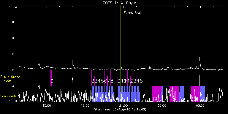 EIS Observation timeline overlay to GOES-Xray curve Code 1" 2" 40" 266" EIS Observations list for this event: STUDY ACRONYM ID DATE OBSERVED DESCRIPTION NOAA# TARGET 0 regcal071 | 18619 | 2010/08/03 15:18:12 | Dark exposures, CCD bottom rows (100s | | Engineering TIMELINE ID DATE OBSERVED FITS FILE XCEN (+W/-E) YCEN (+N/-S) DUR ----------------------------------------------------------------------------------------------------------------- 18619 | 2010/08/03 15:18:12.000 | eis_l0_20100803_151812.fits.gz | 37.92 | -232.12 | 3m22s 1 regcal072 | 18620 | 2010/08/03 15:22:01 | Dark exposures, top CCD rows (100s exp | | Engineering TIMELINE ID DATE OBSERVED FITS FILE XCEN (+W/-E) YCEN (+N/-S) DUR ----------------------------------------------------------------------------------------------------------------- 18620 | 2010/08/03 15:22:01.000 | eis_l0_20100803_152201.fits.gz | 38.38 | 278.96 | 3m21s 2 Alignment_modify_v2 | 18595 | 2010/08/03 18:29:41 | Co-alignment north limb | | Quiet Sun TIMELINE ID DATE OBSERVED FITS FILE XCEN (+W/-E) YCEN (+N/-S) DUR ----------------------------------------------------------------------------------------------------------------- 18595 | 2010/08/03 18:29:41.000 | eis_l0_20100803_182941.fits.gz | -0.02 | 944.70 | 1m 18595 | 2010/08/03 18:31:06.000 | eis_l0_20100803_183106.fits.gz | -9.66 | 944.62 | 2m34s 18595 | 2010/08/03 18:34:14.000 | eis_l0_20100803_183414.fits.gz | -9.58 | 944.62 | 2m34s 18595 | 2010/08/03 18:37:21.000 | eis_l0_20100803_183721.fits.gz | -9.58 | 944.55 | 2m34s 18595 | 2010/08/03 18:40:29.000 | eis_l0_20100803_184029.fits.gz | -9.66 | 944.55 | 2m34s 3 Alignment_modify_v2 | 18596 | 2010/08/03 18:44:18 | Co-alignment north limb | | Quiet Sun TIMELINE ID DATE OBSERVED FITS FILE XCEN (+W/-E) YCEN (+N/-S) DUR ----------------------------------------------------------------------------------------------------------------- 18596 | 2010/08/03 18:44:18.000 | eis_l0_20100803_184418.fits.gz | -0.10 | 944.62 | 1m 18596 | 2010/08/03 18:45:44.000 | eis_l0_20100803_184544.fits.gz | -9.66 | 944.55 | 2m33s 18596 | 2010/08/03 18:48:51.000 | eis_l0_20100803_184851.fits.gz | -9.50 | 944.55 | 2m34s 18596 | 2010/08/03 18:51:59.000 | eis_l0_20100803_185159.fits.gz | -9.58 | 944.55 | 2m33s 18596 | 2010/08/03 18:55:06.000 | eis_l0_20100803_185506.fits.gz | -9.50 | 944.55 | 2m34s 4 Alignment_modify_v2 | 18597 | 2010/08/03 18:59:17 | Co-alignment north limb | | Quiet Sun TIMELINE ID DATE OBSERVED FITS FILE XCEN (+W/-E) YCEN (+N/-S) DUR ----------------------------------------------------------------------------------------------------------------- 18597 | 2010/08/03 18:59:17.000 | eis_l0_20100803_185917.fits.gz | -0.02 | 944.55 | 1m 18597 | 2010/08/03 19:00:42.000 | eis_l0_20100803_190042.fits.gz | -9.50 | 944.47 | 2m34s 18597 | 2010/08/03 19:03:50.000 | eis_l0_20100803_190350.fits.gz | -9.50 | 944.55 | 2m34s 18597 | 2010/08/03 19:06:57.000 | eis_l0_20100803_190657.fits.gz | -9.50 | 944.47 | 2m34s 18597 | 2010/08/03 19:10:05.000 | eis_l0_20100803_191005.fits.gz | -9.50 | 944.55 | 2m34s 5 Alignment_modify_v2 | 18598 | 2010/08/03 19:14:15 | Co-alignment north limb | | Quiet Sun TIMELINE ID DATE OBSERVED FITS FILE XCEN (+W/-E) YCEN (+N/-S) DUR ----------------------------------------------------------------------------------------------------------------- 18598 | 2010/08/03 19:14:15.000 | eis_l0_20100803_191415.fits.gz | -0.10 | 944.47 | 1m 18598 | 2010/08/03 19:15:40.000 | eis_l0_20100803_191540.fits.gz | -9.50 | 944.47 | 2m34s 18598 | 2010/08/03 19:18:48.000 | eis_l0_20100803_191848.fits.gz | -9.58 | 944.55 | 2m34s 18598 | 2010/08/03 19:21:55.000 | eis_l0_20100803_192155.fits.gz | -9.58 | 944.47 | 2m34s 18598 | 2010/08/03 19:25:03.000 | eis_l0_20100803_192503.fits.gz | -9.58 | 944.70 | 2m34s 6 Alignment_modify_v2 | 18599 | 2010/08/03 19:29:14 | Co-alignment north limb | | Quiet Sun TIMELINE ID DATE OBSERVED FITS FILE XCEN (+W/-E) YCEN (+N/-S) DUR ----------------------------------------------------------------------------------------------------------------- 18599 | 2010/08/03 19:29:14.000 | eis_l0_20100803_192914.fits.gz | -0.02 | 944.70 | 1m 18599 | 2010/08/03 19:30:39.000 | eis_l0_20100803_193039.fits.gz | -9.50 | 944.70 | 2m34s 18599 | 2010/08/03 19:33:47.000 | eis_l0_20100803_193347.fits.gz | -9.50 | 944.62 | 2m34s 18599 | 2010/08/03 19:36:54.000 | eis_l0_20100803_193654.fits.gz | -9.58 | 944.78 | 2m34s 18599 | 2010/08/03 19:40:02.000 | eis_l0_20100803_194002.fits.gz | -9.50 | 944.55 | 2m34s 7 Alignment_modify_v2 | 18600 | 2010/08/03 19:44:12 | Co-alignment north limb | | Quiet Sun TIMELINE ID DATE OBSERVED FITS FILE XCEN (+W/-E) YCEN (+N/-S) DUR ----------------------------------------------------------------------------------------------------------------- 18600 | 2010/08/03 19:44:12.000 | eis_l0_20100803_194412.fits.gz | -0.10 | 944.47 | 1m 18600 | 2010/08/03 19:45:37.000 | eis_l0_20100803_194537.fits.gz | -9.50 | 944.47 | 2m34s 18600 | 2010/08/03 19:48:45.000 | eis_l0_20100803_194845.fits.gz | -9.50 | 944.62 | 2m34s 18600 | 2010/08/03 19:51:53.000 | eis_l0_20100803_195153.fits.gz | -9.50 | 944.62 | 2m34s 18600 | 2010/08/03 19:55:00.000 | eis_l0_20100803_195500.fits.gz | -9.50 | 944.55 | 2m34s 8 Alignment_modify_v2 | 18601 | 2010/08/03 19:59:11 | Co-alignment north limb | | Quiet Sun TIMELINE ID DATE OBSERVED FITS FILE XCEN (+W/-E) YCEN (+N/-S) DUR ----------------------------------------------------------------------------------------------------------------- 18601 | 2010/08/03 19:59:11.000 | eis_l0_20100803_195911.fits.gz | -0.02 | 944.62 | 1m 18601 | 2010/08/03 20:00:36.000 | eis_l0_20100803_200036.fits.gz | -9.58 | 944.55 | 2m34s 18601 | 2010/08/03 20:03:44.000 | eis_l0_20100803_200344.fits.gz | -9.58 | 944.39 | 2m34s 18601 | 2010/08/03 20:06:51.000 | eis_l0_20100803_200651.fits.gz | -9.50 | 944.47 | 2m34s 18601 | 2010/08/03 20:09:59.000 | eis_l0_20100803_200959.fits.gz | -9.50 | 944.47 | 2m34s 9 Alignment_modify_v2 | 18602 | 2010/08/03 20:32:20 | Co-alignm