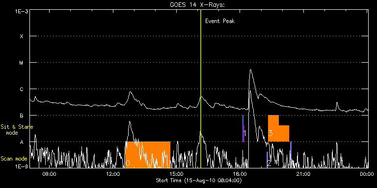 EIS Observation timeline overlay to GOES-Xray curve Code 1" 2" 40" 266" EIS Observations list for this event: STUDY ACRONYM ID DATE OBSERVED DESCRIPTION NOAA# TARGET 0 cam_ar_limb_lite_v2 | 18744 | 2010/08/15 12:35:35 | ar1099 | 1093 | Active Region TIMELINE ID DATE OBSERVED FITS FILE XCEN (+W/-E) YCEN (+N/-S) DUR ----------------------------------------------------------------------------------------------------------------- 18744 | 2010/08/15 12:35:35.000 | eis_l0_20100815_123535.fits.gz | 814.40 | 240.82 | 2h6m 1 SYNOP005_A | 18745 | 2010/08/15 18:07:12 | | | Quiet Sun TIMELINE ID DATE OBSERVED FITS FILE XCEN (+W/-E) YCEN (+N/-S) DUR ----------------------------------------------------------------------------------------------------------------- 18745 | 2010/08/15 18:07:12.000 | eis_l0_20100815_180712.fits.gz | -19.52 | -0.73 | 1m30s 18745 | 2010/08/15 18:08:53.000 | eis_l0_20100815_180853.fits.gz | -0.10 | -0.50 | 1m30s 2 PRY_slot_context_v3 | 18746 | 2010/08/15 19:15:33 | | | Active Region TIMELINE ID DATE OBSERVED FITS FILE XCEN (+W/-E) YCEN (+N/-S) DUR ----------------------------------------------------------------------------------------------------------------- 18746 | 2010/08/15 19:15:33.000 | eis_l0_20100815_191533.fits.gz | -44.99 | 352.91 | 2m56s 3 nanoflare_sas_v1 | 18747 | 2010/08/15 19:20:02 | ar1097 | | Active Region TIMELINE ID DATE OBSERVED FITS FILE XCEN (+W/-E) YCEN (+N/-S) DUR ----------------------------------------------------------------------------------------------------------------- 18747 | 2010/08/15 19:20:02.000 | eis_l0_20100815_192002.fits.gz | -29.63 | 352.83 | 29m3s 18747 | 2010/08/15 19:49:09.000 | eis_l0_20100815_194909.fits.gz | -25.92 | 352.98 | 29m3s 4 PRY_slot_context_v3 | 18749 | 2010/08/15 20:22:19 | | | Active Region TIMELINE ID DATE OBSERVED FITS FILE XCEN (+W/-E) YCEN (+N/-S) DUR ----------------------------------------------------------------------------------------------------------------- 18749 | 2010/08/15 20:22:19.000 | eis_l0_20100815_202219.fits.gz | -36.41 | 352.91 | 2m57s : Check study information : Download file : View thumbnails For this event, also check for: