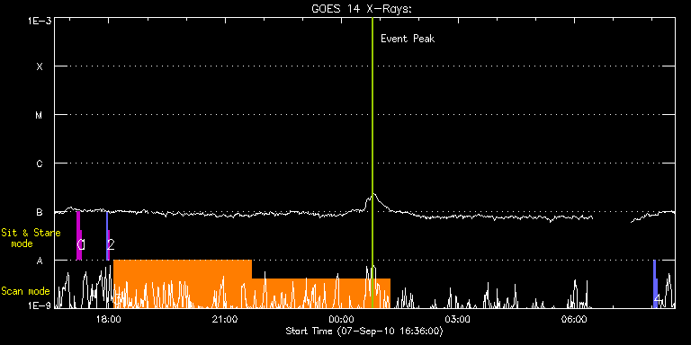 EIS Observation timeline overlay to GOES-Xray curve Code 1" 2" 40" 266" EIS Observations list for this event: STUDY ACRONYM ID DATE OBSERVED DESCRIPTION NOAA# TARGET 0 regcal071 | 19097 | 2010/09/07 17:11:11 | Dark exposures, CCD bottom rows (100s | | Engineering TIMELINE ID DATE OBSERVED FITS FILE XCEN (+W/-E) YCEN (+N/-S) DUR ----------------------------------------------------------------------------------------------------------------- 19097 | 2010/09/07 17:11:11.000 | eis_l0_20100907_171111.fits.gz | 875.51 | -50.89 | 3m22s 1 regcal072 | 19098 | 2010/09/07 17:15:00 | Dark exposures, top CCD rows (100s exp | | Engineering TIMELINE ID DATE OBSERVED FITS FILE XCEN (+W/-E) YCEN (+N/-S) DUR ----------------------------------------------------------------------------------------------------------------- 19098 | 2010/09/07 17:15:00.000 | eis_l0_20100907_171500.fits.gz | 875.67 | 460.11 | 3m22s 2 SYNOP005_A | 19107 | 2010/09/07 17:57:13 | | | Quiet Sun TIMELINE ID DATE OBSERVED FITS FILE XCEN (+W/-E) YCEN (+N/-S) DUR ----------------------------------------------------------------------------------------------------------------- 19107 | 2010/09/07 17:57:13.000 | eis_l0_20100907_175713.fits.gz | -19.60 | -0.58 | 1m30s 19107 | 2010/09/07 17:58:54.000 | eis_l0_20100907_175854.fits.gz | -0.02 | -0.58 | 1m30s 3 JS_CH_280x256_2arc | 19091 | 2010/09/07 18:07:26 | HOP 80: Polar Coronal Hole Observation | | Coronal Hole TIMELINE ID DATE OBSERVED FITS FILE XCEN (+W/-E) YCEN (+N/-S) DUR ----------------------------------------------------------------------------------------------------------------- 19091 | 2010/09/07 18:07:26.000 | eis_l0_20100907_180726.fits.gz | -11.53 | 849.39 | 3h33m57s 19091 | 2010/09/07 21:41:26.000 | eis_l0_20100907_214126.fits.gz | -11.46 | 849.47 | 3h33m53s 4 PRY_slot_context_v3 | 19099 | 2010/09/08 08:02:19 | HOP 132: Wide-fov scan of filament/pla | | Active Region TIMELINE ID DATE OBSERVED FITS FILE XCEN (+W/-E) YCEN (+N/-S) DUR ----------------------------------------------------------------------------------------------------------------- 19099 | 2010/09/08 08:02:19.000 | eis_l0_20100908_080219.fits.gz | 291.51 | 224.83 | 2m56s 19099 | 2010/09/08 08:05:19.000 | eis_l0_20100908_080519.fits.gz | 291.74 | 224.99 | 2m57s : Check study information : Download file : View thumbnails For this event, also check for:
