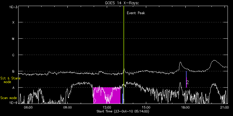 EIS Observation timeline overlay to GOES-Xray curve Code 1" 2" 40" 266" EIS Observations list for this event: STUDY ACRONYM ID DATE OBSERVED DESCRIPTION NOAA# TARGET 0 HPW021_VEL_240x512v1 | 19657 | 2010/10/23 10:57:13 | Active Regions 11117 and 11118 raster | 1117 | Active Region TIMELINE ID DATE OBSERVED FITS FILE XCEN (+W/-E) YCEN (+N/-S) DUR ----------------------------------------------------------------------------------------------------------------- 19657 | 2010/10/23 10:57:13.000 | eis_l0_20101023_105713.fits.gz | -366.64 | 201.53 | 2h3m47s 1 PRY_slot_context_v3 | 19659 | 2010/10/23 13:10:34 | Active Regions 11117 and 11118 context | 1117 | Active Region TIMELINE ID DATE OBSERVED FITS FILE XCEN (+W/-E) YCEN (+N/-S) DUR ----------------------------------------------------------------------------------------------------------------- 19659 | 2010/10/23 13:10:34.000 | eis_l0_20101023_131034.fits.gz | -399.02 | 278.44 | 2m56s 19659 | 2010/10/23 13:13:34.000 | eis_l0_20101023_131334.fits.gz | -398.64 | 278.60 | 2m56s 2 SYNOP005_A | 19658 | 2010/10/23 18:03:10 | Sensitivity monitoring during XRT syno | | Quiet Sun TIMELINE ID DATE OBSERVED FITS FILE XCEN (+W/-E) YCEN (+N/-S) DUR ----------------------------------------------------------------------------------------------------------------- 19658 | 2010/10/23 18:03:10.000 | eis_l0_20101023_180310.fits.gz | -19.44 | -100.65 | 1m30s 19658 | 2010/10/23 18:04:51.000 | eis_l0_20101023_180451.fits.gz | -0.02 | -100.50 | 1m30s : Check study information : Download file : View thumbnails For this event, also check for: