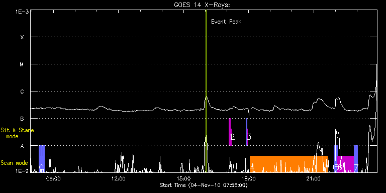 EIS Observation timeline overlay to GOES-Xray curve Code 1" 2" 40" 266" EIS Observations list for this event: STUDY ACRONYM ID DATE OBSERVED DESCRIPTION NOAA# TARGET 0 PRY_slot_context_v3 | 19727 | 2010/11/04 08:20:13 | Active region studies | 1120 | Active Region TIMELINE ID DATE OBSERVED FITS FILE XCEN (+W/-E) YCEN (+N/-S) DUR ----------------------------------------------------------------------------------------------------------------- 19727 | 2010/11/04 08:20:13.000 | eis_l0_20101104_082013.fits.gz | -228.37 | 533.90 | 2m56s 19727 | 2010/11/04 08:23:14.000 | eis_l0_20101104_082314.fits.gz | -228.06 | 533.90 | 2m56s 19727 | 2010/11/04 08:26:14.000 | eis_l0_20101104_082614.fits.gz | -227.75 | 533.82 | 2m56s 19727 | 2010/11/04 08:29:15.000 | eis_l0_20101104_082915.fits.gz | -227.37 | 533.82 | 2m56s 19727 | 2010/11/04 08:32:15.000 | eis_l0_20101104_083215.fits.gz | -227.06 | 533.82 | 2m57s 1 regcal071 | 19732 | 2010/11/04 17:05:42 | Dark exposures, CCD bottom rows (100s | | Engineering TIMELINE ID DATE OBSERVED FITS FILE XCEN (+W/-E) YCEN (+N/-S) DUR ----------------------------------------------------------------------------------------------------------------- 19732 | 2010/11/04 17:05:42.000 | eis_l0_20101104_170542.fits.gz | -9854.89 | -10268.20 | 3m22s 2 regcal072 | 19733 | 2010/11/04 17:09:31 | Dark exposures, top CCD rows (100s exp | | Engineering TIMELINE ID DATE OBSERVED FITS FILE XCEN (+W/-E) YCEN (+N/-S) DUR ----------------------------------------------------------------------------------------------------------------- 19733 | 2010/11/04 17:09:31.000 | eis_l0_20101104_170931.fits.gz | -9854.89 | -9757.20 | 3m21s 3 SYNOP005_A | 19740 | 2010/11/04 17:54:13 | | | Quiet Sun TIMELINE ID DATE OBSERVED FITS FILE XCEN (+W/-E) YCEN (+N/-S) DUR ----------------------------------------------------------------------------------------------------------------- 19740 | 2010/11/04 17:54:13.000 | eis_l0_20101104_175413.fits.gz | -19.60 | -0.42 | 1m31s 19740 | 2010/11/04 17:55:54.000 | eis_l0_20101104_175554.fits.gz | 0.06 | -0.50 | 1m30s 4 dhb_polar_scan_Q90 | 19744 | 2010/11/04 18:03:27 | Interchange reconnection at CH Boundar | 1120 | Quiet Sun TIMELINE ID DATE OBSERVED FITS FILE XCEN (+W/-E) YCEN (+N/-S) DUR ----------------------------------------------------------------------------------------------------------------- 19744 | 2010/11/04 18:03:27.000 | eis_l0_20101104_180327.fits.gz | -61.92 | 487.47 | 3h35m2s 5 js2_decon_slot_sc_LT | 19745 | 2010/11/04 21:56:20 | EIS slot data deconvolution test (part | 1120 | Active Region TIMELINE ID DATE OBSERVED FITS FILE XCEN (+W/-E) YCEN (+N/-S) DUR ----------------------------------------------------------------------------------------------------------------- 19745 | 2010/11/04 21:56:20.000 | eis_l0_20101104_215620.fits.gz | -47.56 | 440.55 | 1m23s 19745 | 2010/11/04 21:57:46.000 | eis_l0_20101104_215746.fits.gz | -47.33 | 440.70 | 1m23s 19745 | 2010/11/04 21:59:12.000 | eis_l0_20101104_215912.fits.gz | -47.25 | 440.55 | 1m23s 19745 | 2010/11/04 22:00:39.000 | eis_l0_20101104_220039.fits.gz | -47.10 | 440.70 | 1m22s 19745 | 2010/11/04 22:02:05.000 | eis_l0_20101104_220205.fits.gz | -46.94 | 440.70 | 1m23s 19745 | 2010/11/04 22:03:31.000 | eis_l0_20101104_220331.fits.gz | -46.63 | 440.63 | 1m23s 19745 | 2010/11/04 22:04:58.000 | eis_l0_20101104_220458.fits.gz | -46.48 | 440.63 | 1m23s 6 js2_decon_ref_vel_LT | 19746 | 2010/11/04 22:06:32 | EIS slot data deconvolution test (part | 1120 | Active Region TIMELINE ID DATE OBSERVED FITS FILE XCEN (+W/-E) YCEN (+N/-S) DUR ----------------------------------------------------------------------------------------------------------------- 19746 | 2010/11/04 22:06:32.000 | eis_l0_20101104_220632.fits.gz | -31.60 | 440.55 | 45m5s 7 js2_decon_slot_sc_LT | 19747 | 2010/11/04 22:52:02 | EIS slot data deconvolution test (part | 1120 | Active Region TIMELINE ID DATE OBSERVED FITS FILE XCEN (+W/-E) YCEN (+N/-S) DUR ----------------------------------------------------------------------------------------------------------------- 19747 | 2010/11/04 22:52:02.000 | eis_l0_20101104_225202.fits.gz | -40.92 | 440.70 | 1m23s 19747 | 2010/11/04 22:53:29.000 | eis_l0_20101104_225329.fits.gz | -40.68 | 440.70 | 1m23s 19747 | 2010/11/04 22:54:56.000 | eis_l0_20101104_225456.fits.gz | -40.37 | 440.70 | 1m22s 19747 | 2010/11/04 22:56:22.000 | eis_l0_20101104_225622.fits.gz | -40.30 | 440.70 | 1m23s 19747 | 2010/11/04 22:57:49.000 | eis_l0_20101104_225749.fits.gz | -40.14 | 440.78 | 1m22s 19747 | 2010/11/04 22:59:15.000 | eis_l0_20101104_225915.fits.gz | -39.99 | 440.70 | 1m23s 19747 | 2010/11/04 23:00:41.000 | eis_l0_20101104_230041.fits.gz | -39.83 | 440.78 | 1m23s : Check study information : Download file : View thumbnails For this event, also check for: