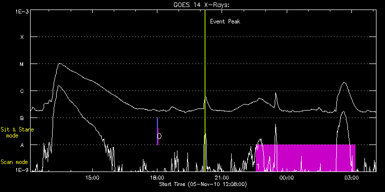 EIS Observation timeline overlay to GOES-Xray curve Code 1" 2" 40" 266" EIS Observations list for this event: STUDY ACRONYM ID DATE OBSERVED DESCRIPTION NOAA# TARGET 0 SYNOP005_A | 19742 | 2010/11/05 17:59:33 | | | Quiet Sun TIMELINE ID DATE OBSERVED FITS FILE XCEN (+W/-E) YCEN (+N/-S) DUR ----------------------------------------------------------------------------------------------------------------- 19742 | 2010/11/05 17:59:33.000 | eis_l0_20101105_175933.fits.gz | -19.68 | -0.35 | 1m30s 19742 | 2010/11/05 18:01:13.000 | eis_l0_20101105_180113.fits.gz | -0.02 | -0.42 | 1m30s 1 SK_CH_DIAG_320x384 | 19730 | 2010/11/05 22:33:40 | HOP81: Polar Monitoring Campaign durin | | Coronal Hole TIMELINE ID DATE OBSERVED FITS FILE XCEN (+W/-E) YCEN (+N/-S) DUR ----------------------------------------------------------------------------------------------------------------- 19730 | 2010/11/05 22:33:40.000 | eis_l0_20101105_223340.fits.gz | 0.23 | 939.60 | 4h35m37s : Check study information : Download file : View thumbnails For this event, also check for: