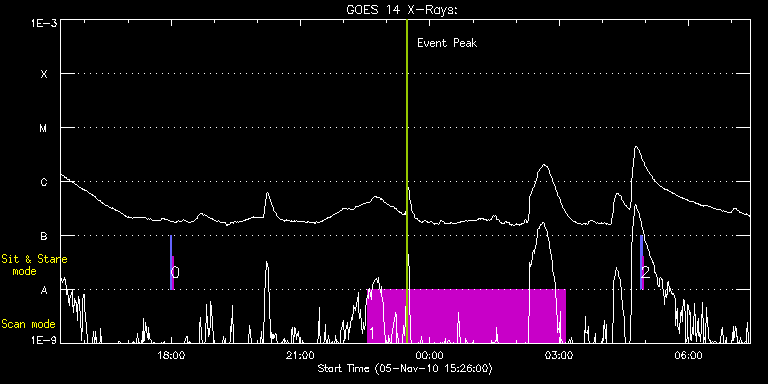 EIS Observation timeline overlay to GOES-Xray curve Code 1" 2" 40" 266" EIS Observations list for this event: STUDY ACRONYM ID DATE OBSERVED DESCRIPTION NOAA# TARGET 0 SYNOP005_A | 19742 | 2010/11/05 17:59:33 | | | Quiet Sun TIMELINE ID DATE OBSERVED FITS FILE XCEN (+W/-E) YCEN (+N/-S) DUR ----------------------------------------------------------------------------------------------------------------- 19742 | 2010/11/05 17:59:33.000 | eis_l0_20101105_175933.fits.gz | -19.68 | -0.35 | 1m30s 19742 | 2010/11/05 18:01:13.000 | eis_l0_20101105_180113.fits.gz | -0.02 | -0.42 | 1m30s 1 SK_CH_DIAG_320x384 | 19730 | 2010/11/05 22:33:40 | HOP81: Polar Monitoring Campaign durin | | Coronal Hole TIMELINE ID DATE OBSERVED FITS FILE XCEN (+W/-E) YCEN (+N/-S) DUR ----------------------------------------------------------------------------------------------------------------- 19730 | 2010/11/05 22:33:40.000 | eis_l0_20101105_223340.fits.gz | 0.23 | 939.60 | 4h35m37s 2 SYNOP005_A | 19743 | 2010/11/06 04:53:33 | | | Quiet Sun TIMELINE ID DATE OBSERVED FITS FILE XCEN (+W/-E) YCEN (+N/-S) DUR ----------------------------------------------------------------------------------------------------------------- 19743 | 2010/11/06 04:53:33.000 | eis_l0_20101106_045333.fits.gz | -19.44 | -0.65 | 1m30s 19743 | 2010/11/06 04:55:13.000 | eis_l0_20101106_045513.fits.gz | 0.06 | -0.50 | 1m30s : Check study information : Download file : View thumbnails For this event, also check for: