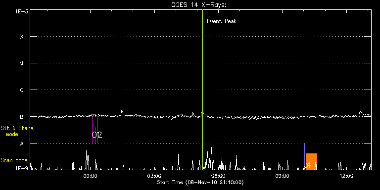 EIS Observation timeline overlay to GOES-Xray curve Code 1" 2" 40" 266" EIS Observations list for this event: STUDY ACRONYM ID DATE OBSERVED DESCRIPTION NOAA# TARGET 0 regcal070 | 19763 | 2010/11/09 00:05:12 | Flat field with overscan pixels (50*8) | | Engineering TIMELINE ID DATE OBSERVED FITS FILE XCEN (+W/-E) YCEN (+N/-S) DUR ----------------------------------------------------------------------------------------------------------------- 19763 | 2010/11/09 00:05:12.000 | eis_l0_20101109_000512.fits.gz | -431.05 | -175.64 | 2s 1 regcal076 | 19764 | 2010/11/09 00:15:12 | Flatfield, 1 exposure, led 100ms, ccd | | Engineering TIMELINE ID DATE OBSERVED FITS FILE XCEN (+W/-E) YCEN (+N/-S) DUR ----------------------------------------------------------------------------------------------------------------- 19764 | 2010/11/09 00:15:12.000 | eis_l0_20101109_001512.fits.gz | -429.82 | -431.72 | 1s 2 regcal077 | 19765 | 2010/11/09 00:20:12 | Flatfield, 2 exposures, led 80ms, full | | Engineering TIMELINE ID DATE OBSERVED FITS FILE XCEN (+W/-E) YCEN (+N/-S) DUR ----------------------------------------------------------------------------------------------------------------- 19765 | 2010/11/09 00:20:12.000 | eis_l0_20101109_002012.fits.gz | -429.12 | -431.87 | 4s 3 PRY_slot_context_v3 | 19766 | 2010/11/09 10:00:33 | EIS spectral atlas | 1121 | Active Region TIMELINE ID DATE OBSERVED FITS FILE XCEN (+W/-E) YCEN (+N/-S) DUR ----------------------------------------------------------------------------------------------------------------- 19766 | 2010/11/09 10:00:33.000 | eis_l0_20101109_100033.fits.gz | -383.95 | -383.57 | 2m56s 4 Atlas_30 | 19767 | 2010/11/09 10:07:33 | EIS spectral atlas | 1121 | Quiet Sun TIMELINE ID DATE OBSERVED FITS FILE XCEN (+W/-E) YCEN (+N/-S) DUR ----------------------------------------------------------------------------------------------------------------- 19767 | 2010/11/09 10:07:33.000 | eis_l0_20101109_100733.fits.gz | -368.28 | -383.73 | 29m1s : Check study information : Download file : View thumbnails For this event, also check for: