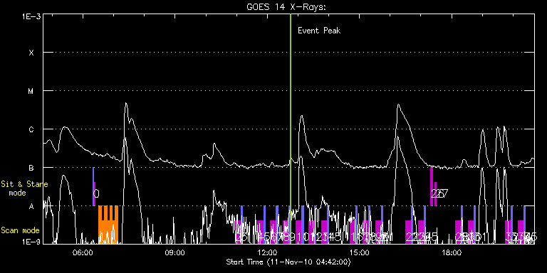 EIS Observation timeline overlay to GOES-Xray curve Code 1" 2" 40" 266" EIS Observations list for this event: STUDY ACRONYM ID DATE OBSERVED DESCRIPTION NOAA# TARGET 0 SYNOP005_A | 19779 | 2010/11/11 06:19:50 | | | Quiet Sun TIMELINE ID DATE OBSERVED FITS FILE XCEN (+W/-E) YCEN (+N/-S) DUR ----------------------------------------------------------------------------------------------------------------- 19779 | 2010/11/11 06:19:50.000 | eis_l0_20101111_061950.fits.gz | -19.52 | -0.42 | 1m30s 19779 | 2010/11/11 06:21:31.000 | eis_l0_20101111_062131.fits.gz | -0.10 | -0.50 | 1m30s 1 IUU_SCAN_STEPS_002 | 19782 | 2010/11/11 06:30:26 | Active Region Studies - Warren | 1121 | Active Region TIMELINE ID DATE OBSERVED FITS FILE XCEN (+W/-E) YCEN (+N/-S) DUR ----------------------------------------------------------------------------------------------------------------- 19782 | 2010/11/11 06:30:26.000 | eis_l0_20101111_063026.fits.gz | -3.59 | -405.97 | 5m24s 19782 | 2010/11/11 06:35:53.000 | eis_l0_20101111_063553.fits.gz | -2.90 | -405.90 | 5m23s 19782 | 2010/11/11 06:41:20.000 | eis_l0_20101111_064120.fits.gz | -2.05 | -405.82 | 5m23s 19782 | 2010/11/11 06:46:46.000 | eis_l0_20101111_064646.fits.gz | -1.27 | -405.90 | 5m24s 19782 | 2010/11/11 06:52:13.000 | eis_l0_20101111_065213.fits.gz | -0.50 | -405.97 | 5m24s 19782 | 2010/11/11 06:57:40.000 | eis_l0_20101111_065740.fits.gz | 0.35 | -405.90 | 5m23s 19782 | 2010/11/11 07:03:07.000 | eis_l0_20101111_070307.fits.gz | 1.04 | -405.90 | 5m23s 2 SK_DEEP_5x512_SLIT1 | 19826 | 2010/11/11 10:57:27 | | | Quiet Sun TIMELINE ID DATE OBSERVED FITS FILE XCEN (+W/-E) YCEN (+N/-S) DUR ----------------------------------------------------------------------------------------------------------------- 19826 | 2010/11/11 10:57:27.000 | eis_l0_20101111_105727.fits.gz | -0.10 | -945.55 | 10m8s 3 PRY_slot_contextLITE | 19827 | 2010/11/11 11:08:36 | | | Active Region TIMELINE ID DATE OBSERVED FITS FILE XCEN (+W/-E) YCEN (+N/-S) DUR ----------------------------------------------------------------------------------------------------------------- 19827 | 2010/11/11 11:08:36.000 | eis_l0_20101111_110836.fits.gz | -15.32 | -945.47 | 2m56s 4 SK_DEEP_5x512_SLIT1 | 19828 | 2010/11/11 11:41:20 | | | Quiet Sun TIMELINE ID DATE OBSERVED FITS FILE XCEN (+W/-E) YCEN (+N/-S) DUR ----------------------------------------------------------------------------------------------------------------- 19828 | 2010/11/11 11:41:20.000 | eis_l0_20101111_114120.fits.gz | -11.22 | -860.27 | 10m8s 5 PRY_slot_contextLITE | 19829 | 2010/11/11 11:52:37 | | | Active Region TIMELINE ID DATE OBSERVED FITS FILE XCEN (+W/-E) YCEN (+N/-S) DUR ----------------------------------------------------------------------------------------------------------------- 19829 | 2010/11/11 11:52:37.000 | eis_l0_20101111_115237.fits.gz | -26.52 | -860.34 | 2m57s 6 SK_DEEP_5x512_SLIT1 | 19830 | 2010/11/11 12:06:20 | | | Quiet Sun TIMELINE ID DATE OBSERVED FITS FILE XCEN (+W/-E) YCEN (+N/-S) DUR ----------------------------------------------------------------------------------------------------------------- 19830 | 2010/11/11 12:06:20.000 | eis_l0_20101111_120620.fits.gz | -11.22 | -760.31 | 10m8s 7 PRY_slot_contextLITE | 19831 | 2010/11/11 12:17:37 | | | Active Region TIMELINE ID DATE OBSERVED FITS FILE XCEN (+W/-E) YCEN (+N/-S) DUR ----------------------------------------------------------------------------------------------------------------- 19831 | 2010/11/11 12:17:37.000 | eis_l0_20101111_121737.fits.gz | -26.45 | -760.46 | 2m56s 8 SK_DEEP_5x512_SLIT1 | 19832 | 2010/11/11 12:31:20 | | | Quiet Sun TIMELINE ID DATE OBSERVED FITS FILE XCEN (+W/-E) YCEN (+N/-S) DUR ----------------------------------------------------------------------------------------------------------------- 19832 | 2010/11/11 12:31:20.000 | eis_l0_20101111_123120.fits.gz | -11.14 | -660.35 | 10m8s 9 PRY_slot_contextLITE | 19833 | 2010/11/11 12:42:37 | | 1123 | Active Region TIMELINE ID DATE OBSERVED FITS FILE XCEN (+W/-E) YCEN (+N/-S) DUR ----------------------------------------------------------------------------------------------------------------- 19833 | 2010/11/11 12:42:37.000 | eis_l0_20101111_124237.fits.gz | -26.37 | -660.35 | 2m56s 10 SK_DEEP_5x512_SLIT1 | 19834 | 2010/11/11 12:56:20 | | | Quiet Sun TIMELINE ID DATE OBSERVED FITS FILE XCEN (+W/-E) YCEN (+N/-S) DUR ----------------------------------------------------------------------------------------------------------------- 19834 | 2010/11/11 12:56:20.000 | eis_l0_20101111_125620.fits.gz | -11.22 | -560.54 | 10m8s 11 PRY_slot_contextLITE | 19835 | 2010/11/11 13:07:37 | | 1121 | Active Region TIMELINE ID DATE OBSERVED FITS FILE XCEN (+W/-E) YCEN (+N/-S) DUR ----------------------------------------------------------------------------------------------------------------- 19835 | 2010/11/11 13:07:37.000 | eis_l0_20101111_130737.fits.gz | -26.37 | -560.70 | 2m56s 12 SK_DEEP_5x512_SLIT1 | 19836 | 2010/11/11 13:21:20 | | | Quiet Sun TIMELINE ID DATE OBSERVED FITS FILE XCEN (+W/-E) YCEN (+N/-S) DUR ----------------------------------------------------------------------------------------------------------------- 19836 | 2010/11/11 13:21:20.000 | eis_l0_20101111_132120.fits.gz | -11.22 | -460.51 | 10m8s 13 PRY_slot_contextLITE | 19837 | 2010/11/11 13:32:37 | | 1121 | Active Region TIMELINE ID DATE OBSERVED FITS FILE XCEN (+W/-E) YCEN (+N/-S) DUR ----------------------------------------------------------------------------------------------------------------- 19837 | 2010/11/11 13:32:37.000 | eis_l0_20101111_133237.fits.gz | -26.45 | -460.43 | 2m56s 14 SK_DEEP_5x512_SLIT1 | 19838 | 2010/11/11 13:46:20 | | | Quiet Sun TIMELINE ID DATE OBSERVED FITS FILE XCEN (+W/-E) YCEN (+N/-S) DUR ----------------------------------------------------------------------------------------------------------------- 19838 | 2010/11/11 13:46:20.000 | eis_l0_20101111_134620.fits.gz | -11.22 | -360.32 | 10m8s 15 PRY_slot_contextLITE |