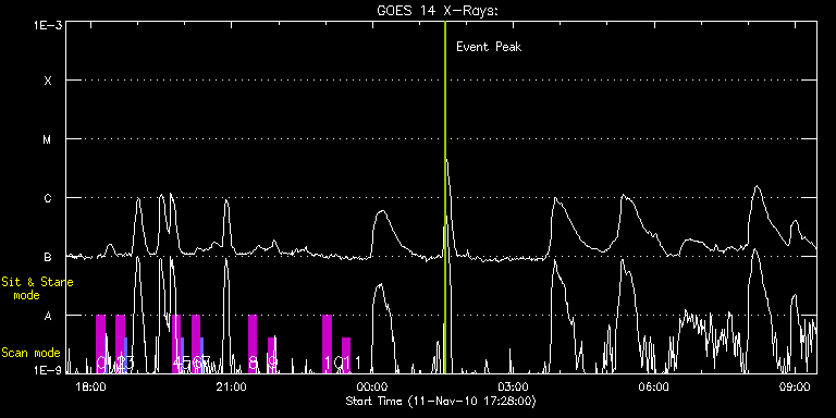 EIS Observation timeline overlay to GOES-Xray curve Code 1" 2" 40" 266" EIS Observations list for this event: STUDY ACRONYM ID DATE OBSERVED DESCRIPTION NOAA# TARGET 0 SK_DEEP_5x512_SLIT1 | 19850 | 2010/11/11 18:07:20 | | | Quiet Sun TIMELINE ID DATE OBSERVED FITS FILE XCEN (+W/-E) YCEN (+N/-S) DUR ----------------------------------------------------------------------------------------------------------------- 19850 | 2010/11/11 18:07:20.000 | eis_l0_20101111_180720.fits.gz | -11.22 | 229.62 | 10m8s 1 PRY_slot_contextLITE | 19851 | 2010/11/11 18:18:37 | | | Active Region TIMELINE ID DATE OBSERVED FITS FILE XCEN (+W/-E) YCEN (+N/-S) DUR ----------------------------------------------------------------------------------------------------------------- 19851 | 2010/11/11 18:18:37.000 | eis_l0_20101111_181837.fits.gz | -26.45 | 229.54 | 2m56s 2 SK_DEEP_5x512_SLIT1 | 19852 | 2010/11/11 18:32:20 | | | Quiet Sun TIMELINE ID DATE OBSERVED FITS FILE XCEN (+W/-E) YCEN (+N/-S) DUR ----------------------------------------------------------------------------------------------------------------- 19852 | 2010/11/11 18:32:20.000 | eis_l0_20101111_183220.fits.gz | -11.22 | 329.81 | 10m8s 3 PRY_slot_contextLITE | 19853 | 2010/11/11 18:43:37 | | | Active Region TIMELINE ID DATE OBSERVED FITS FILE XCEN (+W/-E) YCEN (+N/-S) DUR ----------------------------------------------------------------------------------------------------------------- 19853 | 2010/11/11 18:43:37.000 | eis_l0_20101111_184337.fits.gz | -26.45 | 329.66 | 2m56s 4 SK_DEEP_5x512_SLIT1 | 19854 | 2010/11/11 19:44:20 | | | Quiet Sun TIMELINE ID DATE OBSERVED FITS FILE XCEN (+W/-E) YCEN (+N/-S) DUR ----------------------------------------------------------------------------------------------------------------- 19854 | 2010/11/11 19:44:20.000 | eis_l0_20101111_194420.fits.gz | -11.14 | 429.46 | 10m8s 5 PRY_slot_contextLITE | 19855 | 2010/11/11 19:55:37 | | | Active Region TIMELINE ID DATE OBSERVED FITS FILE XCEN (+W/-E) YCEN (+N/-S) DUR ----------------------------------------------------------------------------------------------------------------- 19855 | 2010/11/11 19:55:37.000 | eis_l0_20101111_195537.fits.gz | -26.45 | 429.46 | 2m56s 6 SK_DEEP_5x512_SLIT1 | 19856 | 2010/11/11 20:09:20 | | | Quiet Sun TIMELINE ID DATE OBSERVED FITS FILE XCEN (+W/-E) YCEN (+N/-S) DUR ----------------------------------------------------------------------------------------------------------------- 19856 | 2010/11/11 20:09:20.000 | eis_l0_20101111_200920.fits.gz | -11.22 | 529.42 | 10m8s 7 PRY_slot_contextLITE | 19857 | 2010/11/11 20:20:37 | | | Active Region TIMELINE ID DATE OBSERVED FITS FILE XCEN (+W/-E) YCEN (+N/-S) DUR ----------------------------------------------------------------------------------------------------------------- 19857 | 2010/11/11 20:20:37.000 | eis_l0_20101111_202037.fits.gz | -26.37 | 529.42 | 2m56s 8 SK_DEEP_5x512_SLIT1 | 19858 | 2010/11/11 21:21:20 | | | Quiet Sun TIMELINE ID DATE OBSERVED FITS FILE XCEN (+W/-E) YCEN (+N/-S) DUR ----------------------------------------------------------------------------------------------------------------- 19858 | 2010/11/11 21:21:20.000 | eis_l0_20101111_212120.fits.gz | -11.22 | 629.61 | 10m8s 9 SK_DEEP_5x512_SLIT1 | 19860 | 2010/11/11 21:46:41 | | | Quiet Sun TIMELINE ID DATE OBSERVED FITS FILE XCEN (+W/-E) YCEN (+N/-S) DUR ----------------------------------------------------------------------------------------------------------------- 19860 | 2010/11/11 21:46:41.000 | eis_l0_20101111_214641.fits.gz | -11.07 | 729.57 | 10m8s 10 SK_DEEP_5x512_SLIT1 | 19862 | 2010/11/11 22:56:40 | | | Quiet Sun TIMELINE ID DATE OBSERVED FITS FILE XCEN (+W/-E) YCEN (+N/-S) DUR ----------------------------------------------------------------------------------------------------------------- 19862 | 2010/11/11 22:56:40.000 | eis_l0_20101111_225640.fits.gz | -11.22 | 829.84 | 10m8s 11 SK_DEEP_5x512_SLIT1 | 19864 | 2010/11/11 23:21:14 | | | Quiet Sun TIMELINE ID DATE OBSERVED FITS FILE XCEN (+W/-E) YCEN (+N/-S) DUR ----------------------------------------------------------------------------------------------------------------- 19864 | 2010/11/11 23:21:14.000 | eis_l0_20101111_232114.fits.gz | -11.30 | 929.64 | 10m8s : Check study information : Download file : View thumbnails For this event, also check for: