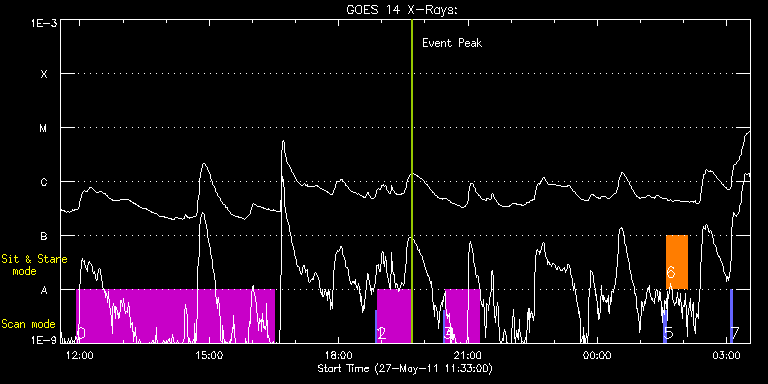 EIS Observation timeline overlay to GOES-Xray curve Code 1" 2" 40" 266" EIS Observations list for this event: STUDY ACRONYM ID DATE OBSERVED DESCRIPTION NOAA# TARGET 0 SK_CH_DIAG_320x384 | 22405 | 2011/05/27 11:55:20 | HOP 81 - polar monitoring campaign | | Coronal Hole TIMELINE ID DATE OBSERVED FITS FILE XCEN (+W/-E) YCEN (+N/-S) DUR ----------------------------------------------------------------------------------------------------------------- 22405 | 2011/05/27 11:55:20.000 | eis_l0_20110527_115520.fits.gz | -6.65 | 904.53 | 4h35m38s 1 PRY_slot_context_v3 | 22411 | 2011/05/27 18:50:34 | Active region fan loop velocity study | 1223 | Active Region TIMELINE ID DATE OBSERVED FITS FILE XCEN (+W/-E) YCEN (+N/-S) DUR ----------------------------------------------------------------------------------------------------------------- 22411 | 2011/05/27 18:50:34.000 | eis_l0_20110527_185034.fits.gz | -82.16 | -275.73 | 2m57s 2 HPW021_VEL_120x512v2 | 22412 | 2011/05/27 18:53:42 | Active region fan loop velocity study | | Active Region TIMELINE ID DATE OBSERVED FITS FILE XCEN (+W/-E) YCEN (+N/-S) DUR ----------------------------------------------------------------------------------------------------------------- 22412 | 2011/05/27 18:53:42.000 | eis_l0_20110527_185342.fits.gz | 103.34 | -149.73 | 46m54s 3 PRY_slot_context_v3 | 22413 | 2011/05/27 20:25:34 | Active region fan loop velocity study | 1223 | Active Region TIMELINE ID DATE OBSERVED FITS FILE XCEN (+W/-E) YCEN (+N/-S) DUR ----------------------------------------------------------------------------------------------------------------- 22413 | 2011/05/27 20:25:34.000 | eis_l0_20110527_202534.fits.gz | -68.48 | -275.96 | 2m56s 4 HPW021_VEL_120x512v2 | 22414 | 2011/05/27 20:28:41 | Active region fan loop velocity study | 1223 | Active Region TIMELINE ID DATE OBSERVED FITS FILE XCEN (+W/-E) YCEN (+N/-S) DUR ----------------------------------------------------------------------------------------------------------------- 22414 | 2011/05/27 20:28:41.000 | eis_l0_20110527_202841.fits.gz | 6.71 | -149.81 | 46m55s 5 PRY_slot_context_v3 | 22407 | 2011/05/28 01:32:34 | Active region nanoflare study | 1223 | Active Region TIMELINE ID DATE OBSERVED FITS FILE XCEN (+W/-E) YCEN (+N/-S) DUR ----------------------------------------------------------------------------------------------------------------- 22407 | 2011/05/28 01:32:34.000 | eis_l0_20110528_013234.fits.gz | -59.97 | -276.27 | 2m56s 6 nanoflare_sas_v1 | 22408 | 2011/05/28 01:35:56 | Active region nanoflare study | | Active Region TIMELINE ID DATE OBSERVED FITS FILE XCEN (+W/-E) YCEN (+N/-S) DUR ----------------------------------------------------------------------------------------------------------------- 22408 | 2011/05/28 01:35:56.000 | eis_l0_20110528_013556.fits.gz | -20.81 | -144.27 | 29m4s 7 PRY_slot_context_v3 | 22409 | 2011/05/28 03:05:20 | Active region nanoflare study | 1223 | Active Region TIMELINE ID DATE OBSERVED FITS FILE XCEN (+W/-E) YCEN (+N/-S) DUR ----------------------------------------------------------------------------------------------------------------- 22409 | 2011/05/28 03:05:20.000 | eis_l0_20110528_030520.fits.gz | -46.61 | -276.20 | 2m56s : Check study information : Download file : View thumbnails For this event, also check for: