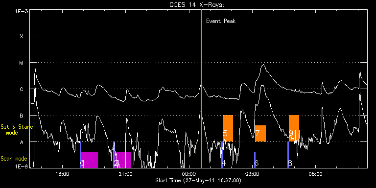 EIS Observation timeline overlay to GOES-Xray curve Code 1" 2" 40" 266" EIS Observations list for this event: STUDY ACRONYM ID DATE OBSERVED DESCRIPTION NOAA# TARGET 0 PRY_slot_context_v3 | 22411 | 2011/05/27 18:50:34 | Active region fan loop velocity study | 1223 | Active Region TIMELINE ID DATE OBSERVED FITS FILE XCEN (+W/-E) YCEN (+N/-S) DUR ----------------------------------------------------------------------------------------------------------------- 22411 | 2011/05/27 18:50:34.000 | eis_l0_20110527_185034.fits.gz | -82.16 | -275.73 | 2m57s 1 HPW021_VEL_120x512v2 | 22412 | 2011/05/27 18:53:42 | Active region fan loop velocity study | | Active Region TIMELINE ID DATE OBSERVED FITS FILE XCEN (+W/-E) YCEN (+N/-S) DUR ----------------------------------------------------------------------------------------------------------------- 22412 | 2011/05/27 18:53:42.000 | eis_l0_20110527_185342.fits.gz | 103.34 | -149.73 | 46m54s 2 PRY_slot_context_v3 | 22413 | 2011/05/27 20:25:34 | Active region fan loop velocity study | 1223 | Active Region TIMELINE ID DATE OBSERVED FITS FILE XCEN (+W/-E) YCEN (+N/-S) DUR ----------------------------------------------------------------------------------------------------------------- 22413 | 2011/05/27 20:25:34.000 | eis_l0_20110527_202534.fits.gz | -68.48 | -275.96 | 2m56s 3 HPW021_VEL_120x512v2 | 22414 | 2011/05/27 20:28:41 | Active region fan loop velocity study | 1223 | Active Region TIMELINE ID DATE OBSERVED FITS FILE XCEN (+W/-E) YCEN (+N/-S) DUR ----------------------------------------------------------------------------------------------------------------- 22414 | 2011/05/27 20:28:41.000 | eis_l0_20110527_202841.fits.gz | 6.71 | -149.81 | 46m55s 4 PRY_slot_context_v3 | 22407 | 2011/05/28 01:32:34 | Active region nanoflare study | 1223 | Active Region TIMELINE ID DATE OBSERVED FITS FILE XCEN (+W/-E) YCEN (+N/-S) DUR ----------------------------------------------------------------------------------------------------------------- 22407 | 2011/05/28 01:32:34.000 | eis_l0_20110528_013234.fits.gz | -59.97 | -276.27 | 2m56s 5 nanoflare_sas_v1 | 22408 | 2011/05/28 01:35:56 | Active region nanoflare study | | Active Region TIMELINE ID DATE OBSERVED FITS FILE XCEN (+W/-E) YCEN (+N/-S) DUR ----------------------------------------------------------------------------------------------------------------- 22408 | 2011/05/28 01:35:56.000 | eis_l0_20110528_013556.fits.gz | -20.81 | -144.27 | 29m4s 6 PRY_slot_context_v3 | 22409 | 2011/05/28 03:05:20 | Active region nanoflare study | 1223 | Active Region TIMELINE ID DATE OBSERVED FITS FILE XCEN (+W/-E) YCEN (+N/-S) DUR ----------------------------------------------------------------------------------------------------------------- 22409 | 2011/05/28 03:05:20.000 | eis_l0_20110528_030520.fits.gz | -46.61 | -276.20 | 2m56s 7 nanoflare_sas_v1 | 22410 | 2011/05/28 03:08:41 | Active region nanoflare study | | Active Region TIMELINE ID DATE OBSERVED FITS FILE XCEN (+W/-E) YCEN (+N/-S) DUR ----------------------------------------------------------------------------------------------------------------- 22410 | 2011/05/28 03:08:41.000 | eis_l0_20110528_030841.fits.gz | -7.62 | -144.35 | 29m4s 8 PRY_slot_context_v3 | 22415 | 2011/05/28 04:40:20 | Active region nanoflare study | 1223 | Active Region TIMELINE ID DATE OBSERVED FITS FILE XCEN (+W/-E) YCEN (+N/-S) DUR ----------------------------------------------------------------------------------------------------------------- 22415 | 2011/05/28 04:40:20.000 | eis_l0_20110528_044020.fits.gz | -33.01 | -276.43 | 2m57s 9 nanoflare_sas_v1 | 22416 | 2011/05/28 04:43:42 | Active region nanoflare study | | Active Region TIMELINE ID DATE OBSERVED FITS FILE XCEN (+W/-E) YCEN (+N/-S) DUR ----------------------------------------------------------------------------------------------------------------- 22416 | 2011/05/28 04:43:42.000 | eis_l0_20110528_044342.fits.gz | -47.01 | -140.43 | 29m4s : Check study information : Download file : View thumbnails For this event, also check for: