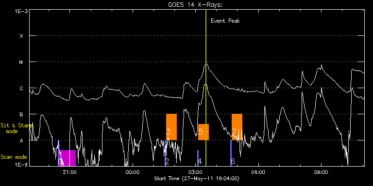 EIS Observation timeline overlay to GOES-Xray curve Code 1" 2" 40" 266" EIS Observations list for this event: STUDY ACRONYM ID DATE OBSERVED DESCRIPTION NOAA# TARGET 0 PRY_slot_context_v3 | 22413 | 2011/05/27 20:25:34 | Active region fan loop velocity study | 1223 | Active Region TIMELINE ID DATE OBSERVED FITS FILE XCEN (+W/-E) YCEN (+N/-S) DUR ----------------------------------------------------------------------------------------------------------------- 22413 | 2011/05/27 20:25:34.000 | eis_l0_20110527_202534.fits.gz | -68.48 | -275.96 | 2m56s 1 HPW021_VEL_120x512v2 | 22414 | 2011/05/27 20:28:41 | Active region fan loop velocity study | 1223 | Active Region TIMELINE ID DATE OBSERVED FITS FILE XCEN (+W/-E) YCEN (+N/-S) DUR ----------------------------------------------------------------------------------------------------------------- 22414 | 2011/05/27 20:28:41.000 | eis_l0_20110527_202841.fits.gz | 6.71 | -149.81 | 46m55s 2 PRY_slot_context_v3 | 22407 | 2011/05/28 01:32:34 | Active region nanoflare study | 1223 | Active Region TIMELINE ID DATE OBSERVED FITS FILE XCEN (+W/-E) YCEN (+N/-S) DUR ----------------------------------------------------------------------------------------------------------------- 22407 | 2011/05/28 01:32:34.000 | eis_l0_20110528_013234.fits.gz | -59.97 | -276.27 | 2m56s 3 nanoflare_sas_v1 | 22408 | 2011/05/28 01:35:56 | Active region nanoflare study | | Active Region TIMELINE ID DATE OBSERVED FITS FILE XCEN (+W/-E) YCEN (+N/-S) DUR ----------------------------------------------------------------------------------------------------------------- 22408 | 2011/05/28 01:35:56.000 | eis_l0_20110528_013556.fits.gz | -20.81 | -144.27 | 29m4s 4 PRY_slot_context_v3 | 22409 | 2011/05/28 03:05:20 | Active region nanoflare study | 1223 | Active Region TIMELINE ID DATE OBSERVED FITS FILE XCEN (+W/-E) YCEN (+N/-S) DUR ----------------------------------------------------------------------------------------------------------------- 22409 | 2011/05/28 03:05:20.000 | eis_l0_20110528_030520.fits.gz | -46.61 | -276.20 | 2m56s 5 nanoflare_sas_v1 | 22410 | 2011/05/28 03:08:41 | Active region nanoflare study | | Active Region TIMELINE ID DATE OBSERVED FITS FILE XCEN (+W/-E) YCEN (+N/-S) DUR ----------------------------------------------------------------------------------------------------------------- 22410 | 2011/05/28 03:08:41.000 | eis_l0_20110528_030841.fits.gz | -7.62 | -144.35 | 29m4s 6 PRY_slot_context_v3 | 22415 | 2011/05/28 04:40:20 | Active region nanoflare study | 1223 | Active Region TIMELINE ID DATE OBSERVED FITS FILE XCEN (+W/-E) YCEN (+N/-S) DUR ----------------------------------------------------------------------------------------------------------------- 22415 | 2011/05/28 04:40:20.000 | eis_l0_20110528_044020.fits.gz | -33.01 | -276.43 | 2m57s 7 nanoflare_sas_v1 | 22416 | 2011/05/28 04:43:42 | Active region nanoflare study | | Active Region TIMELINE ID DATE OBSERVED FITS FILE XCEN (+W/-E) YCEN (+N/-S) DUR ----------------------------------------------------------------------------------------------------------------- 22416 | 2011/05/28 04:43:42.000 | eis_l0_20110528_044342.fits.gz | -47.01 | -140.43 | 29m4s : Check study information : Download file : View thumbnails For this event, also check for: