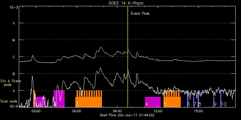 EIS Observation timeline overlay to GOES-Xray curve Code 1" 2" 40" 266" EIS Observations list for this event: STUDY ACRONYM ID DATE OBSERVED DESCRIPTION NOAA# TARGET 0 IUU_SCAN_STEPS_002 | 22463 | 2011/06/02 02:48:34 | AR observation at central meridian | 1225 | Active Region TIMELINE ID DATE OBSERVED FITS FILE XCEN (+W/-E) YCEN (+N/-S) DUR ----------------------------------------------------------------------------------------------------------------- 22463 | 2011/06/02 02:48:34.000 | eis_l0_20110602_024834.fits.gz | 153.30 | 358.62 | 5m1s 1 HPW021_VEL_120x512v2 | 22464 | 2011/06/02 02:54:56 | AR observation at central meridian | 1225 | Active Region TIMELINE ID DATE OBSERVED FITS FILE XCEN (+W/-E) YCEN (+N/-S) DUR ----------------------------------------------------------------------------------------------------------------- 22464 | 2011/06/02 02:54:56.000 | eis_l0_20110602_025456.fits.gz | 168.77 | 358.39 | 46m54s 2 HPW021_VEL_120x512v2 | 22465 | 2011/06/02 04:18:40 | AR observation at central meridian | 1225 | Active Region TIMELINE ID DATE OBSERVED FITS FILE XCEN (+W/-E) YCEN (+N/-S) DUR ----------------------------------------------------------------------------------------------------------------- 22465 | 2011/06/02 04:18:40.000 | eis_l0_20110602_041840.fits.gz | 168.64 | 358.39 | 46m53s 3 HH_Flare+AR_180x152 | 22466 | 2011/06/02 05:54:27 | Flare hunting observation | 1226 | Flare TIMELINE ID DATE OBSERVED FITS FILE XCEN (+W/-E) YCEN (+N/-S) DUR ----------------------------------------------------------------------------------------------------------------- 22466 | 2011/06/02 05:54:27.000 | eis_l0_20110602_055427.fits.gz | -254.32 | -371.52 | 5m18s 22466 | 2011/06/02 05:59:48.000 | eis_l0_20110602_055948.fits.gz | -253.55 | -371.60 | 5m17s 22466 | 2011/06/02 06:05:08.000 | eis_l0_20110602_060508.fits.gz | -252.85 | -371.67 | 5m18s 22466 | 2011/06/02 06:10:29.000 | eis_l0_20110602_061029.fits.gz | -252.16 | -371.60 | 5m17s 22466 | 2011/06/02 06:15:49.000 | eis_l0_20110602_061549.fits.gz | -251.39 | -371.67 | 5m18s 22466 | 2011/06/02 06:21:10.000 | eis_l0_20110602_062110.fits.gz | -250.77 | -371.60 | 5m18s 22466 | 2011/06/02 06:26:31.000 | eis_l0_20110602_062631.fits.gz | -250.07 | -371.60 | 5m18s 22466 | 2011/06/02 06:31:51.000 | eis_l0_20110602_063151.fits.gz | -249.38 | -371.52 | 5m18s 22466 | 2011/06/02 06:37:11.000 | eis_l0_20110602_063711.fits.gz | -248.68 | -371.67 | 5m18s 22466 | 2011/06/02 06:42:32.000 | eis_l0_20110602_064232.fits.gz | -247.91 | -371.52 | 5m17s 22466 | 2011/06/02 06:47:52.000 | eis_l0_20110602_064752.fits.gz | -247.22 | -371.67 | 5m17s 22466 | 2011/06/02 06:53:12.000 | eis_l0_20110602_065312.fits.gz | -246.52 | -371.75 | 5m18s 22466 | 2011/06/02 06:58:33.000 | eis_l0_20110602_065833.fits.gz | -245.67 | -371.67 | 5m18s 22466 | 2011/06/02 07:03:54.000 | eis_l0_20110602_070354.fits.gz | -244.98 | -371.67 | 5m17s 22466 | 2011/06/02 07:09:14.000 | eis_l0_20110602_070914.fits.gz | -244.43 | -371.52 | 5m18s 22466 | 2011/06/02 07:14:35.000 | eis_l0_20110602_071435.fits.gz | -243.59 | -371.67 | 5m17s 22466 | 2011/06/02 07:19:55.000 | eis_l0_20110602_071955.fits.gz | -242.89 | -371.67 | 5m17s 22466 | 2011/06/02 07:25:15.000 | eis_l0_20110602_072515.fits.gz | -242.27 | -371.60 | 5m18s 22466 | 2011/06/02 07:30:36.000 | eis_l0_20110602_073036.fits.gz | -241.50 | -371.44 | 5m18s 22466 | 2011/06/02 07:35:57.000 | eis_l0_20110602_073557.fits.gz | -240.73 | -371.60 | 5m18s 22466 | 2011/06/02 07:41:18.000 | eis_l0_20110602_074118.fits.gz | -240.03 | -371.67 | 5m18s 22466 | 2011/06/02 07:46:39.000 | eis_l0_20110602_074639.fits.gz | -239.34 | -371.75 | 5m17s 4 VHH_SlowAR_1h12_V2 | 22469 | 2011/06/02 11:03:27 | AR observation | 1226 | Active Region TIMELINE ID DATE OBSERVED FITS FILE XCEN (+W/-E) YCEN (+N/-S) DUR ----------------------------------------------------------------------------------------------------------------- 22469 | 2011/06/02 11:03:27.000 | eis_l0_20110602_110327.fits.gz | -173.15 | -371.91 | 1h8m5s 5 HH_Flare+AR_180x152 | 22470 | 2011/06/02 12:25:27 | Flare Hunting | 1226 | Flare TIMELINE ID DATE OBSERVED FITS FILE XCEN (+W/-E) YCEN (+N/-S) DUR ----------------------------------------------------------------------------------------------------------------- 22470 | 2011/06/02 12:25:27.000 | eis_l0_20110602_122527.fits.gz | -164.16 | -389.67 | 5m18s 22470 | 2011/06/02 12:30:48.000 | eis_l0_20110602_123048.fits.gz | -163.39 | -389.91 | 5m17s 22470 | 2011/06/02 12:36:08.000 | eis_l0_20110602_123608.fits.gz | -162.70 | -389.83 | 5m19s 22470 | 2011/06/02 12:41:30.000 | eis_l0_20110602_124130.fits.gz | -162.08 | -389.91 | 5m17s 22470 | 2011/06/02 12:46:50.000 | eis_l0_20110602_124650.fits.gz | -161.23 | -389.98 | 5m18s 22470 | 2011/06/02 12:52:11.000 | eis_l0_20110602_125211.fits.gz | -160.46 | -390.14 | 5m18s 22470 | 2011/06/02 12:57:32.000 | eis_l0_20110602_125732.fits.gz | -159.92 | -389.91 | 5m17s 22470 | 2011/06/02 13:02:52.000 | eis_l0_20110602_130252.fits.gz | -159.07 | -389.98 | 5m19s 22470 | 2011/06/02 13:08:13.000 | eis_l0_20110602_130813.fits.gz | -158.45 | -389.91 | 5m18s 22470 | 2011/06/02 13:13:34.000 | eis_l0_20110602_131334.fits.gz | -157.68 | -389.98 | 5m18s 22470 | 2011/06/02 13:18:55.000 | eis_l0_20110602_131855.fits.gz | -156.90 | -390.14 | 5m18s 22470 | 2011/06/02 13:24:16.000 | eis_l0_20110602_132416.fits.gz | -156.29 | -389.98 | 5m18s 22470 | 2011/06/02 13:29:37.000 | eis_l0_20110602_132937.fits.gz | -155.43 | -390.06 | 5m18s 22470 | 2011/06/02 13:34:58.000 | eis_l0_20110602_133458.fits.gz | -154.82 | -390.06 | 5m18s 6 PRY_slot_context_v3 | 22471 | 2011/06/02 14:10:21 | HOP 79 | | Active Region TIMELINE ID DATE OBSERVED FITS FILE XCEN (+W/-E) YCEN (+N/-S) DUR ----------------------------------------------------------------------------------------------------------------- 22471 | 2011/06/02 14:10:21.000 | eis_l0_20110602_141021.fits.gz | -21.35 | -945.55 | 2m56s 7 PRY_slot_context_v3 | 22472 | 2011/06/02 14:37:35 | HOP 79 | | Active Region TI