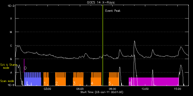 EIS Observation timeline overlay to GOES-Xray curve Code 1" 2" 40" 266" EIS Observations list for this event: STUDY ACRONYM ID DATE OBSERVED DESCRIPTION NOAA# TARGET 0 Alignment_modify_v2 | 23136 | 2011/07/03 00:50:20 | Co-alignment program | | Quiet Sun TIMELINE ID DATE OBSERVED FITS FILE XCEN (+W/-E) YCEN (+N/-S) DUR ----------------------------------------------------------------------------------------------------------------- 23136 | 2011/07/03 00:50:20.000 | eis_l0_20110703_005020.fits.gz | -9854.52 | -9963.20 | 1m 23136 | 2011/07/03 00:51:45.000 | eis_l0_20110703_005145.fits.gz | -9893.96 | -9963.20 | 2m34s 23136 | 2011/07/03 00:54:53.000 | eis_l0_20110703_005453.fits.gz | -9893.96 | -9963.20 | 2m34s 23136 | 2011/07/03 00:58:01.000 | eis_l0_20110703_005801.fits.gz | -9893.96 | -9963.20 | 2m33s 23136 | 2011/07/03 01:01:08.000 | eis_l0_20110703_010108.fits.gz | -9893.96 | -9963.20 | 2m34s 23136 | 2011/07/03 01:04:16.000 | eis_l0_20110703_010416.fits.gz | -9893.96 | -9963.20 | 2m34s 23136 | 2011/07/03 01:07:23.000 | eis_l0_20110703_010723.fits.gz | -9893.96 | -9963.20 | 2m34s 23136 | 2011/07/03 01:10:31.000 | eis_l0_20110703_011031.fits.gz | -9893.96 | -9963.20 | 2m34s 23136 | 2011/07/03 01:13:38.000 | eis_l0_20110703_011338.fits.gz | -9893.96 | -9963.20 | 2m34s 23136 | 2011/07/03 01:16:46.000 | eis_l0_20110703_011646.fits.gz | -9893.96 | -9963.20 | 2m33s 23136 | 2011/07/03 01:19:53.000 | eis_l0_20110703_011953.fits.gz | -9893.96 | -9963.20 | 2m34s 23136 | 2011/07/03 01:23:01.000 | eis_l0_20110703_012301.fits.gz | -9893.96 | -9963.20 | 2m33s 23136 | 2011/07/03 01:26:08.000 | eis_l0_20110703_012608.fits.gz | -9893.96 | -9963.20 | 2m34s 23136 | 2011/07/03 01:29:15.000 | eis_l0_20110703_012915.fits.gz | -9893.96 | -9963.20 | 2m34s 23136 | 2011/07/03 01:32:23.000 | eis_l0_20110703_013223.fits.gz | -9893.96 | -9963.20 | 2m34s 23136 | 2011/07/03 01:35:31.000 | eis_l0_20110703_013531.fits.gz | -9893.96 | -9963.20 | 2m33s 23136 | 2011/07/03 01:38:38.000 | eis_l0_20110703_013838.fits.gz | -9893.96 | -9963.20 | 2m34s 23136 | 2011/07/03 01:41:46.000 | eis_l0_20110703_014146.fits.gz | -9893.96 | -9963.20 | 2m34s 23136 | 2011/07/03 01:44:53.000 | eis_l0_20110703_014453.fits.gz | -9893.96 | -9963.20 | 2m34s 23136 | 2011/07/03 01:48:01.000 | eis_l0_20110703_014801.fits.gz | -9893.96 | -9963.20 | 2m34s 23136 | 2011/07/03 01:51:08.000 | eis_l0_20110703_015108.fits.gz | -9893.96 | -9963.20 | 2m34s 23136 | 2011/07/03 01:54:16.000 | eis_l0_20110703_015416.fits.gz | -9893.96 | -9963.20 | 2m34s 23136 | 2011/07/03 01:57:23.000 | eis_l0_20110703_015723.fits.gz | -9893.96 | -9963.20 | 2m34s 23136 | 2011/07/03 02:00:31.000 | eis_l0_20110703_020031.fits.gz | -9893.96 | -9963.20 | 2m33s 23136 | 2011/07/03 02:03:38.000 | eis_l0_20110703_020338.fits.gz | -9893.96 | -9963.20 | 2m34s 23136 | 2011/07/03 02:06:46.000 | eis_l0_20110703_020646.fits.gz | -9893.96 | -9963.20 | 2m34s 23136 | 2011/07/03 02:09:53.000 | eis_l0_20110703_020953.fits.gz | -9893.96 | -9963.20 | 2m34s 23136 | 2011/07/03 02:13:01.000 | eis_l0_20110703_021301.fits.gz | -9893.96 | -9963.20 | 2m34s 23136 | 2011/07/03 02:16:08.000 | eis_l0_20110703_021608.fits.gz | -9893.96 | -9963.20 | 2m34s 23136 | 2011/07/03 02:19:16.000 | eis_l0_20110703_021916.fits.gz | -9893.96 | -9963.20 | 2m34s 23136 | 2011/07/03 02:22:24.000 | eis_l0_20110703_022224.fits.gz | -9893.96 | -9963.20 | 2m33s 1 HH_Flare_60x152f | 23147 | 2011/07/03 02:38:35 | Active Region observations - Aoki | 1243 | Flare TIMELINE ID DATE OBSERVED FITS FILE XCEN (+W/-E) YCEN (+N/-S) DUR ----------------------------------------------------------------------------------------------------------------- 23147 | 2011/07/03 02:38:35.000 | eis_l0_20110703_023835.fits.gz | -137.31 | 180.96 | 2m48s 23147 | 2011/07/03 02:41:25.000 | eis_l0_20110703_024125.fits.gz | -136.93 | 181.03 | 2m49s 23147 | 2011/07/03 02:44:17.000 | eis_l0_20110703_024417.fits.gz | -136.54 | 180.80 | 2m48s 23147 | 2011/07/03 02:47:08.000 | eis_l0_20110703_024708.fits.gz | -136.08 | 180.88 | 2m48s 23147 | 2011/07/03 02:49:58.000 | eis_l0_20110703_024958.fits.gz | -135.69 | 180.88 | 2m49s 23147 | 2011/07/03 02:52:49.000 | eis_l0_20110703_025249.fits.gz | -9869.98 | -9963.20 | 2m48s 23147 | 2011/07/03 02:55:40.000 | eis_l0_20110703_025540.fits.gz | -9869.98 | -9963.20 | 2m48s 23147 | 2011/07/03 02:58:30.000 | eis_l0_20110703_025830.fits.gz | -9869.98 | -9963.20 | 2m48s 23147 | 2011/07/03 03:01:21.000 | eis_l0_20110703_030121.fits.gz | -9869.98 | -9963.20 | 2m48s 23147 | 2011/07/03 03:04:12.000 | eis_l0_20110703_030412.fits.gz | -9869.98 | -9963.20 | 2m49s 2 HH_Flare_60x152f | 23148 | 2011/07/03 03:43:13 | Active Region observations - Aoki | 1243 | Flare TIMELINE ID DATE OBSERVED FITS FILE XCEN (+W/-E) YCEN (+N/-S) DUR ----------------------------------------------------------------------------------------------------------------- 23148 | 2011/07/03 03:43:13.000 | eis_l0_20110703_034313.fits.gz | -9869.98 | -9963.20 | 2m48s 23148 | 2011/07/03 03:46:04.000 | eis_l0_20110703_034604.fits.gz | -9869.98 | -9963.20 | 1m46s 23148 | 2011/07/03 03:47:57.000 | eis_l0_20110703_034757.fits.gz | -9869.98 | -9963.20 | 55s 23148 | 2011/07/03 03:48:54.000 | eis_l0_20110703_034854.fits.gz | -9869.98 | -9963.20 | 2m48s 23148 | 2011/07/03 03:51:45.000 | eis_l0_20110703_035145.fits.gz | -126.26 | 180.80 | 2m48s 23148 | 2011/07/03 03:54:36.000 | eis_l0_20110703_035436.fits.gz | -126.26 | 180.65 | 2m48s 23148 | 2011/07/03 03:57:26.000 | eis_l0_20110703_035726.fits.gz | -125.80 | 180.88 | 2m48s 23148 | 2011/07/03 04:00:17.000 | eis_l0_20110703_040017.fits.gz | -125.42 | 180.65 | 2m48s 23148 | 2011/07/03 04:03:08.000 | eis_l0_20110703_040308.fits.gz | -125.03 | 180.72 | 2m47s 23148 | 2011/07/03 04:05:58.000 | eis_l0_20110703_040558.fits.gz | -124.57 | 180.65 | 2m48s 23148 | 2011/07/03 04:08:49.000 | eis_l0_20110703_040849.fits.gz | -124.10 | 180.57 | 2m48s 23148 | 2011/07/03 04:11:40.000 | eis_l0_20110703_041140.fits.gz | -123.79 | 180.72 | 2m48s 23148 | 2011/0