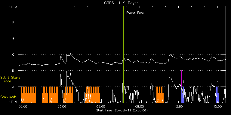 EIS Observation timeline overlay to GOES-Xray curve Code 1" 2" 40" 266" EIS Observations list for this event: STUDY ACRONYM ID DATE OBSERVED DESCRIPTION NOAA# TARGET 0 HH_Flare+AR_180x152 | 23451 | 2011/07/25 23:51:12 | AR observation | 1259 | Flare TIMELINE ID DATE OBSERVED FITS FILE XCEN (+W/-E) YCEN (+N/-S) DUR ----------------------------------------------------------------------------------------------------------------- 23451 | 2011/07/25 23:51:12.000 | eis_l0_20110725_235112.fits.gz | 319.71 | 279.21 | 5m19s 23451 | 2011/07/25 23:56:34.000 | eis_l0_20110725_235634.fits.gz | 320.41 | 279.21 | 5m18s 23451 | 2011/07/26 00:01:55.000 | eis_l0_20110726_000155.fits.gz | 321.26 | 279.21 | 5m17s 23451 | 2011/07/26 00:07:15.000 | eis_l0_20110726_000715.fits.gz | 321.88 | 279.14 | 5m18s 23451 | 2011/07/26 00:12:36.000 | eis_l0_20110726_001236.fits.gz | 322.57 | 279.21 | 5m17s 23451 | 2011/07/26 00:17:56.000 | eis_l0_20110726_001756.fits.gz | 323.27 | 279.21 | 5m19s 23451 | 2011/07/26 00:23:17.000 | eis_l0_20110726_002317.fits.gz | 323.89 | 279.21 | 5m18s 23451 | 2011/07/26 00:28:38.000 | eis_l0_20110726_002838.fits.gz | 324.58 | 279.21 | 5m18s 23451 | 2011/07/26 00:33:59.000 | eis_l0_20110726_003359.fits.gz | 325.28 | 279.21 | 5m18s 23451 | 2011/07/26 00:39:20.000 | eis_l0_20110726_003920.fits.gz | 325.82 | 279.37 | 5m18s 23451 | 2011/07/26 00:44:40.000 | eis_l0_20110726_004440.fits.gz | 326.74 | 279.37 | 5m19s 23451 | 2011/07/26 00:50:02.000 | eis_l0_20110726_005002.fits.gz | 327.44 | 279.37 | 5m18s 23451 | 2011/07/26 00:55:23.000 | eis_l0_20110726_005523.fits.gz | 328.06 | 279.37 | 5m17s 1 HH_Flare+AR_180x152 | 23452 | 2011/07/26 01:29:43 | AR observation | 1259 | Flare TIMELINE ID DATE OBSERVED FITS FILE XCEN (+W/-E) YCEN (+N/-S) DUR ----------------------------------------------------------------------------------------------------------------- 23452 | 2011/07/26 01:29:43.000 | eis_l0_20110726_012943.fits.gz | 332.31 | 279.68 | 5m17s 23452 | 2011/07/26 01:35:03.000 | eis_l0_20110726_013503.fits.gz | 333.08 | 279.52 | 5m18s 23452 | 2011/07/26 01:40:23.000 | eis_l0_20110726_014023.fits.gz | 333.85 | 279.68 | 5m18s 23452 | 2011/07/26 01:45:44.000 | eis_l0_20110726_014544.fits.gz | 334.47 | 279.60 | 5m18s 23452 | 2011/07/26 01:51:04.000 | eis_l0_20110726_015104.fits.gz | 335.24 | 279.60 | 5m19s 2 HH_Flare+AR_180x152 | 23463 | 2011/07/26 02:02:12 | AR observation | 1254 | Flare TIMELINE ID DATE OBSERVED FITS FILE XCEN (+W/-E) YCEN (+N/-S) DUR ----------------------------------------------------------------------------------------------------------------- 23463 | 2011/07/26 02:02:12.000 | eis_l0_20110726_020212.fits.gz | 830.86 | -425.13 | 5m18s 23463 | 2011/07/26 02:07:33.000 | eis_l0_20110726_020733.fits.gz | 831.02 | -424.90 | 5m18s 23463 | 2011/07/26 02:12:53.000 | eis_l0_20110726_021253.fits.gz | 831.09 | -424.90 | 5m18s 23463 | 2011/07/26 02:18:14.000 | eis_l0_20110726_021814.fits.gz | 831.25 | -424.74 | 5m18s 23463 | 2011/07/26 02:23:35.000 | eis_l0_20110726_022335.fits.gz | 831.40 | -424.67 | 5m18s 23463 | 2011/07/26 02:28:55.000 | eis_l0_20110726_022855.fits.gz | 831.56 | -424.74 | 5m19s 23463 | 2011/07/26 02:34:17.000 | eis_l0_20110726_023417.fits.gz | 831.71 | -424.59 | 5m17s 3 HH_Flare+AR_180x152 | 23453 | 2011/07/26 03:08:13 | AR observation | 1254 | Flare TIMELINE ID DATE OBSERVED FITS FILE XCEN (+W/-E) YCEN (+N/-S) DUR ----------------------------------------------------------------------------------------------------------------- 23453 | 2011/07/26 03:08:13.000 | eis_l0_20110726_030813.fits.gz | 832.48 | -423.97 | 5m18s 23453 | 2011/07/26 03:13:34.000 | eis_l0_20110726_031334.fits.gz | 832.72 | -424.05 | 5m17s 23453 | 2011/07/26 03:18:54.000 | eis_l0_20110726_031854.fits.gz | 832.87 | -424.05 | 5m18s 23453 | 2011/07/26 03:24:15.000 | eis_l0_20110726_032415.fits.gz | 832.95 | -423.89 | 5m17s 23453 | 2011/07/26 03:29:35.000 | eis_l0_20110726_032935.fits.gz | 833.10 | -423.97 | 5m18s 23453 | 2011/07/26 03:34:56.000 | eis_l0_20110726_033456.fits.gz | 833.26 | -423.82 | 5m18s 23453 | 2011/07/26 03:40:17.000 | eis_l0_20110726_034017.fits.gz | 833.41 | -423.74 | 5m18s 23453 | 2011/07/26 03:45:38.000 | eis_l0_20110726_034538.fits.gz | 833.49 | -423.74 | 5m18s 4 HH_Flare+AR_180x152 | 23454 | 2011/07/26 04:46:43 | AR observation | 1259 | Flare TIMELINE ID DATE OBSERVED FITS FILE XCEN (+W/-E) YCEN (+N/-S) DUR ----------------------------------------------------------------------------------------------------------------- 23454 | 2011/07/26 04:46:43.000 | eis_l0_20110726_044643.fits.gz | 357.41 | 280.53 | 5m17s 23454 | 2011/07/26 04:52:03.000 | eis_l0_20110726_045203.fits.gz | 358.18 | 280.37 | 5m17s 23454 | 2011/07/26 04:57:23.000 | eis_l0_20110726_045723.fits.gz | 358.96 | 280.45 | 5m18s 23454 | 2011/07/26 05:02:44.000 | eis_l0_20110726_050244.fits.gz | 359.57 | 280.45 | 5m17s 23454 | 2011/07/26 05:08:04.000 | eis_l0_20110726_050804.fits.gz | 360.19 | 280.53 | 5m18s 23454 | 2011/07/26 05:13:25.000 | eis_l0_20110726_051325.fits.gz | 360.89 | 280.53 | 5m18s 23454 | 2011/07/26 05:18:46.000 | eis_l0_20110726_051846.fits.gz | 361.58 | 280.45 | 5m17s 23454 | 2011/07/26 05:24:06.000 | eis_l0_20110726_052406.fits.gz | 362.20 | 280.53 | 5m18s 23454 | 2011/07/26 05:29:27.000 | eis_l0_20110726_052927.fits.gz | 362.90 | 280.45 | 5m17s 23454 | 2011/07/26 05:34:47.000 | eis_l0_20110726_053447.fits.gz | 363.51 | 280.53 | 5m17s 23454 | 2011/07/26 05:40:07.000 | eis_l0_20110726_054007.fits.gz | 364.29 | 280.60 | 5m18s 23454 | 2011/07/26 05:45:28.000 | eis_l0_20110726_054528.fits.gz | 364.90 | 280.60 | 5m18s 23454 | 2011/07/26 05:50:49.000 | eis_l0_20110726_055049.fits.gz | 365.60 | 280.53 | 5m18s 5 HH_Flare+AR_180x152 | 23464 | 2011/07/26 10:18:14 | AR observation | 1259 | Flare TIMELINE ID DATE OBSERVED FITS FILE XCEN (+W/-E) YCEN (+N/-S) DUR ----------------------------------------------------------------------------------------------------------------- 23464 | 2011/07/26 10:18:14.000 | eis_l0_20110726