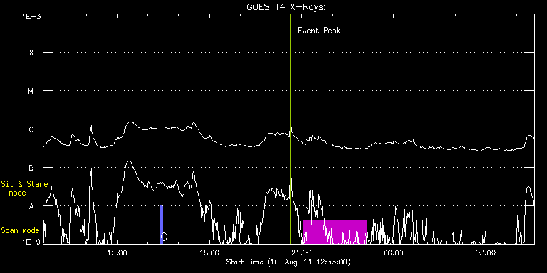 EIS Observation timeline overlay to GOES-Xray curve Code 1" 2" 40" 266" EIS Observations list for this event: STUDY ACRONYM ID DATE OBSERVED DESCRIPTION NOAA# TARGET 0 PRY_slot_contextLITE | 23784 | 2011/08/10 16:25:13 | Search for slow mode oscillations in c | 1263 | Active Region TIMELINE ID DATE OBSERVED FITS FILE XCEN (+W/-E) YCEN (+N/-S) DUR ----------------------------------------------------------------------------------------------------------------- 23784 | 2011/08/10 16:25:13.000 | eis_l0_20110810_162513.fits.gz | 886.55 | 237.81 | 2m56s 1 HPW021_VEL_240x512v1 | 23779 | 2011/08/10 21:02:19 | Dispersing active region study (Warren | | Active Region TIMELINE ID DATE OBSERVED FITS FILE XCEN (+W/-E) YCEN (+N/-S) DUR ----------------------------------------------------------------------------------------------------------------- 23779 | 2011/08/10 21:02:19.000 | eis_l0_20110810_210219.fits.gz | 782.94 | -383.26 | 2h3m47s : Check study information : Download file : View thumbnails For this event, also check for: