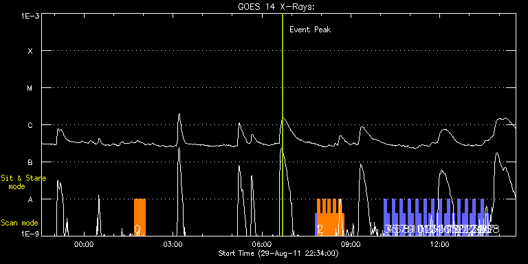 EIS Observation timeline overlay to GOES-Xray curve Code 1" 2" 40" 266" EIS Observations list for this event: STUDY ACRONYM ID DATE OBSERVED DESCRIPTION NOAA# TARGET 0 Hunter_loop_fe8 | 24053 | 2011/08/30 01:41:25 | Hunter study for finding bright loop f | 1277 | Active Region TIMELINE ID DATE OBSERVED FITS FILE XCEN (+W/-E) YCEN (+N/-S) DUR ----------------------------------------------------------------------------------------------------------------- 24053 | 2011/08/30 01:41:25.000 | eis_l0_20110830_014125.fits.gz | -304.84 | 124.72 | 22m40s 1 PRY_slot_context_v3 | 24059 | 2011/08/30 07:48:19 | HOP 190 - topology and dynamics of MMF | 1277 | Active Region TIMELINE ID DATE OBSERVED FITS FILE XCEN (+W/-E) YCEN (+N/-S) DUR ----------------------------------------------------------------------------------------------------------------- 24059 | 2011/08/30 07:48:19.000 | eis_l0_20110830_074819.fits.gz | -163.18 | 157.01 | 2m56s 2 IUU_SCAN_STEPS_002 | 24060 | 2011/08/30 07:51:40 | HOP 190 - topology and dynamics of MMF | 1279 | Active Region TIMELINE ID DATE OBSERVED FITS FILE XCEN (+W/-E) YCEN (+N/-S) DUR ----------------------------------------------------------------------------------------------------------------- 24060 | 2011/08/30 07:51:40.000 | eis_l0_20110830_075140.fits.gz | -148.89 | 156.93 | 5m24s 24060 | 2011/08/30 07:57:07.000 | eis_l0_20110830_075707.fits.gz | -148.20 | 157.01 | 5m24s 24060 | 2011/08/30 08:02:34.000 | eis_l0_20110830_080234.fits.gz | -147.35 | 157.09 | 5m24s 24060 | 2011/08/30 08:08:01.000 | eis_l0_20110830_080801.fits.gz | -146.58 | 157.01 | 5m23s 24060 | 2011/08/30 08:13:28.000 | eis_l0_20110830_081328.fits.gz | -145.80 | 156.85 | 5m23s 24060 | 2011/08/30 08:18:54.000 | eis_l0_20110830_081854.fits.gz | -145.03 | 156.93 | 5m24s 24060 | 2011/08/30 08:24:21.000 | eis_l0_20110830_082421.fits.gz | -144.26 | 157.01 | 5m24s 24060 | 2011/08/30 08:29:48.000 | eis_l0_20110830_082948.fits.gz | -143.49 | 157.01 | 5m24s 24060 | 2011/08/30 08:35:15.000 | eis_l0_20110830_083515.fits.gz | -142.64 | 156.85 | 5m24s 24060 | 2011/08/30 08:40:42.000 | eis_l0_20110830_084042.fits.gz | -141.86 | 156.78 | 5m23s 3 full_sun_slot_scan_1 | 24061 | 2011/08/30 10:07:20 | HOP 130 - EIS full Sun scan | 1274 | Quiet Sun TIMELINE ID DATE OBSERVED FITS FILE XCEN (+W/-E) YCEN (+N/-S) DUR ----------------------------------------------------------------------------------------------------------------- 24061 | 2011/08/30 10:07:20.000 | eis_l0_20110830_100720.fits.gz | 920.69 | 185.58 | 5m28s 4 full_sun_slot_scan_1 | 24062 | 2011/08/30 10:12:53 | HOP 130 - EIS full Sun scan | 1284 | Quiet Sun TIMELINE ID DATE OBSERVED FITS FILE XCEN (+W/-E) YCEN (+N/-S) DUR ----------------------------------------------------------------------------------------------------------------- 24062 | 2011/08/30 10:12:53.000 | eis_l0_20110830_101253.fits.gz | 920.69 | -286.50 | 5m27s 5 full_sun_slot_scan_1 | 24063 | 2011/08/30 10:23:13 | HOP 130 - EIS full Sun scan | 1275 | Quiet Sun TIMELINE ID DATE OBSERVED FITS FILE XCEN (+W/-E) YCEN (+N/-S) DUR ----------------------------------------------------------------------------------------------------------------- 24063 | 2011/08/30 10:23:13.000 | eis_l0_20110830_102313.fits.gz | 452.64 | 185.58 | 5m28s 6 full_sun_slot_scan_1 | 24064 | 2011/08/30 10:28:46 | HOP 130 - EIS full Sun scan | | Quiet Sun TIMELINE ID DATE OBSERVED FITS FILE XCEN (+W/-E) YCEN (+N/-S) DUR ----------------------------------------------------------------------------------------------------------------- 24064 | 2011/08/30 10:28:46.000 | eis_l0_20110830_102846.fits.gz | 452.80 | -286.58 | 5m26s 7 full_sun_slot_scan_1 | 24065 | 2011/08/30 10:39:13 | HOP 130 - EIS full Sun scan | 1277 | Quiet Sun TIMELINE ID DATE OBSERVED FITS FILE XCEN (+W/-E) YCEN (+N/-S) DUR ----------------------------------------------------------------------------------------------------------------- 24065 | 2011/08/30 10:39:13.000 | eis_l0_20110830_103913.fits.gz | -15.32 | 185.58 | 5m27s 8 full_sun_slot_scan_1 | 24066 | 2011/08/30 10:44:46 | HOP 130 - EIS full Sun scan | | Quiet Sun TIMELINE ID DATE OBSERVED FITS FILE XCEN (+W/-E) YCEN (+N/-S) DUR ----------------------------------------------------------------------------------------------------------------- 24066 | 2011/08/30 10:44:46.000 | eis_l0_20110830_104446.fits.gz | -15.32 | -286.42 | 5m26s 9 full_sun_slot_scan_1 | 24067 | 2011/08/30 10:55:13 | HOP 130 - EIS full Sun scan | 1279 | Quiet Sun TIMELINE ID DATE OBSERVED FITS FILE XCEN (+W/-E) YCEN (+N/-S) DUR ----------------------------------------------------------------------------------------------------------------- 24067 | 2011/08/30 10:55:13.000 | eis_l0_20110830_105513.fits.gz | -483.37 | 185.58 | 5m27s 10 full_sun_slot_scan_1 | 24068 | 2011/08/30 11:00:46 | HOP 130 - EIS full Sun scan | 1281 | Quiet Sun TIMELINE ID DATE OBSERVED FITS FILE XCEN (+W/-E) YCEN (+N/-S) DUR ----------------------------------------------------------------------------------------------------------------- 24068 | 2011/08/30 11:00:46.000 | eis_l0_20110830_110046.fits.gz | -483.21 | -286.50 | 5m26s 11 full_sun_slot_scan_1 | 24069 | 2011/08/30 11:11:13 | HOP 130 - EIS full Sun scan | | Quiet Sun TIMELINE ID DATE OBSERVED FITS FILE XCEN (+W/-E) YCEN (+N/-S) DUR ----------------------------------------------------------------------------------------------------------------- 24069 | 2011/08/30 11:11:13.000 | eis_l0_20110830_111113.fits.gz | -9884.72 | -9777.20 | 5m28s 12 full_sun_slot_scan_1 | 24070 | 2011/08/30 11:16:46 | HOP 130 - EIS full Sun scan | | Quiet Sun TIMELINE ID DATE OBSERVED FITS FILE XCEN (+W/-E) YCEN (+N/-S) DUR ----------------------------------------------------------------------------------------------------------------- 24070 | 2011/08/30 11:16:46.000 | eis_l0_20110830_111646.fits.gz | -9884.72 | -10249.20 | 5m27s 13 full_sun_slot_scan_1 | 24071 | 2011/08/30 11:27:13 | HOP 130 - EIS full Sun scan | | Quiet Sun TIMELINE ID DATE OBS