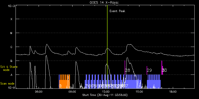 EIS Observation timeline overlay to GOES-Xray curve Code 1" 2" 40" 266" EIS Observations list for this event: STUDY ACRONYM ID DATE OBSERVED DESCRIPTION NOAA# TARGET 0 PRY_slot_context_v3 | 24059 | 2011/08/30 07:48:19 | HOP 190 - topology and dynamics of MMF | 1277 | Active Region TIMELINE ID DATE OBSERVED FITS FILE XCEN (+W/-E) YCEN (+N/-S) DUR ----------------------------------------------------------------------------------------------------------------- 24059 | 2011/08/30 07:48:19.000 | eis_l0_20110830_074819.fits.gz | -163.18 | 157.01 | 2m56s 1 IUU_SCAN_STEPS_002 | 24060 | 2011/08/30 07:51:40 | HOP 190 - topology and dynamics of MMF | 1279 | Active Region TIMELINE ID DATE OBSERVED FITS FILE XCEN (+W/-E) YCEN (+N/-S) DUR ----------------------------------------------------------------------------------------------------------------- 24060 | 2011/08/30 07:51:40.000 | eis_l0_20110830_075140.fits.gz | -148.89 | 156.93 | 5m24s 24060 | 2011/08/30 07:57:07.000 | eis_l0_20110830_075707.fits.gz | -148.20 | 157.01 | 5m24s 24060 | 2011/08/30 08:02:34.000 | eis_l0_20110830_080234.fits.gz | -147.35 | 157.09 | 5m24s 24060 | 2011/08/30 08:08:01.000 | eis_l0_20110830_080801.fits.gz | -146.58 | 157.01 | 5m23s 24060 | 2011/08/30 08:13:28.000 | eis_l0_20110830_081328.fits.gz | -145.80 | 156.85 | 5m23s 24060 | 2011/08/30 08:18:54.000 | eis_l0_20110830_081854.fits.gz | -145.03 | 156.93 | 5m24s 24060 | 2011/08/30 08:24:21.000 | eis_l0_20110830_082421.fits.gz | -144.26 | 157.01 | 5m24s 24060 | 2011/08/30 08:29:48.000 | eis_l0_20110830_082948.fits.gz | -143.49 | 157.01 | 5m24s 24060 | 2011/08/30 08:35:15.000 | eis_l0_20110830_083515.fits.gz | -142.64 | 156.85 | 5m24s 24060 | 2011/08/30 08:40:42.000 | eis_l0_20110830_084042.fits.gz | -141.86 | 156.78 | 5m23s 2 full_sun_slot_scan_1 | 24061 | 2011/08/30 10:07:20 | HOP 130 - EIS full Sun scan | 1274 | Quiet Sun TIMELINE ID DATE OBSERVED FITS FILE XCEN (+W/-E) YCEN (+N/-S) DUR ----------------------------------------------------------------------------------------------------------------- 24061 | 2011/08/30 10:07:20.000 | eis_l0_20110830_100720.fits.gz | 920.69 | 185.58 | 5m28s 3 full_sun_slot_scan_1 | 24062 | 2011/08/30 10:12:53 | HOP 130 - EIS full Sun scan | 1284 | Quiet Sun TIMELINE ID DATE OBSERVED FITS FILE XCEN (+W/-E) YCEN (+N/-S) DUR ----------------------------------------------------------------------------------------------------------------- 24062 | 2011/08/30 10:12:53.000 | eis_l0_20110830_101253.fits.gz | 920.69 | -286.50 | 5m27s 4 full_sun_slot_scan_1 | 24063 | 2011/08/30 10:23:13 | HOP 130 - EIS full Sun scan | 1275 | Quiet Sun TIMELINE ID DATE OBSERVED FITS FILE XCEN (+W/-E) YCEN (+N/-S) DUR ----------------------------------------------------------------------------------------------------------------- 24063 | 2011/08/30 10:23:13.000 | eis_l0_20110830_102313.fits.gz | 452.64 | 185.58 | 5m28s 5 full_sun_slot_scan_1 | 24064 | 2011/08/30 10:28:46 | HOP 130 - EIS full Sun scan | | Quiet Sun TIMELINE ID DATE OBSERVED FITS FILE XCEN (+W/-E) YCEN (+N/-S) DUR ----------------------------------------------------------------------------------------------------------------- 24064 | 2011/08/30 10:28:46.000 | eis_l0_20110830_102846.fits.gz | 452.80 | -286.58 | 5m26s 6 full_sun_slot_scan_1 | 24065 | 2011/08/30 10:39:13 | HOP 130 - EIS full Sun scan | 1277 | Quiet Sun TIMELINE ID DATE OBSERVED FITS FILE XCEN (+W/-E) YCEN (+N/-S) DUR ----------------------------------------------------------------------------------------------------------------- 24065 | 2011/08/30 10:39:13.000 | eis_l0_20110830_103913.fits.gz | -15.32 | 185.58 | 5m27s 7 full_sun_slot_scan_1 | 24066 | 2011/08/30 10:44:46 | HOP 130 - EIS full Sun scan | | Quiet Sun TIMELINE ID DATE OBSERVED FITS FILE XCEN (+W/-E) YCEN (+N/-S) DUR ----------------------------------------------------------------------------------------------------------------- 24066 | 2011/08/30 10:44:46.000 | eis_l0_20110830_104446.fits.gz | -15.32 | -286.42 | 5m26s 8 full_sun_slot_scan_1 | 24067 | 2011/08/30 10:55:13 | HOP 130 - EIS full Sun scan | 1279 | Quiet Sun TIMELINE ID DATE OBSERVED FITS FILE XCEN (+W/-E) YCEN (+N/-S) DUR ----------------------------------------------------------------------------------------------------------------- 24067 | 2011/08/30 10:55:13.000 | eis_l0_20110830_105513.fits.gz | -483.37 | 185.58 | 5m27s 9 full_sun_slot_scan_1 | 24068 | 2011/08/30 11:00:46 | HOP 130 - EIS full Sun scan | 1281 | Quiet Sun TIMELINE ID DATE OBSERVED FITS FILE XCEN (+W/-E) YCEN (+N/-S) DUR ----------------------------------------------------------------------------------------------------------------- 24068 | 2011/08/30 11:00:46.000 | eis_l0_20110830_110046.fits.gz | -483.21 | -286.50 | 5m26s 10 full_sun_slot_scan_1 | 24069 | 2011/08/30 11:11:13 | HOP 130 - EIS full Sun scan | | Quiet Sun TIMELINE ID DATE OBSERVED FITS FILE XCEN (+W/-E) YCEN (+N/-S) DUR ----------------------------------------------------------------------------------------------------------------- 24069 | 2011/08/30 11:11:13.000 | eis_l0_20110830_111113.fits.gz | -9884.72 | -9777.20 | 5m28s 11 full_sun_slot_scan_1 | 24070 | 2011/08/30 11:16:46 | HOP 130 - EIS full Sun scan | | Quiet Sun TIMELINE ID DATE OBSERVED FITS FILE XCEN (+W/-E) YCEN (+N/-S) DUR ----------------------------------------------------------------------------------------------------------------- 24070 | 2011/08/30 11:16:46.000 | eis_l0_20110830_111646.fits.gz | -9884.72 | -10249.20 | 5m27s 12 full_sun_slot_scan_1 | 24071 | 2011/08/30 11:27:13 | HOP 130 - EIS full Sun scan | | Quiet Sun TIMELINE ID DATE OBSERVED FITS FILE XCEN (+W/-E) YCEN (+N/-S) DUR ----------------------------------------------------------------------------------------------------------------- 24071 | 2011/08/30 11:27:13.000 | eis_l0_20110830_112713.fits.gz | 735.37 | 655.71 | 5m28s 13 full_sun_slot_scan_1 | 24072 | 2011/08/30 11:37:13 | HOP 130 - EIS full Sun scan | | Quiet Sun TIMELINE ID DATE OBSERVED FITS FILE X