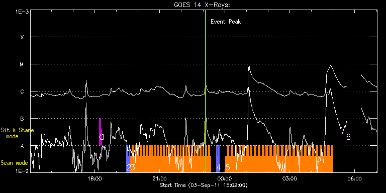 EIS Observation timeline overlay to GOES-Xray curve Code 1" 2" 40" 266" EIS Observations list for this event: STUDY ACRONYM ID DATE OBSERVED DESCRIPTION NOAA# TARGET 0 regcal071 | 24117 | 2011/09/03 18:12:55 | Dark exposures, CCD bottom rows (100s | | Engineering TIMELINE ID DATE OBSERVED FITS FILE XCEN (+W/-E) YCEN (+N/-S) DUR ----------------------------------------------------------------------------------------------------------------- 24117 | 2011/09/03 18:12:55.000 | eis_l0_20110903_181255.fits.gz | -394.13 | -221.69 | 3m22s 1 regcal072 | 24118 | 2011/09/03 18:16:44 | Dark exposures, top CCD rows (100s exp | | Engineering TIMELINE ID DATE OBSERVED FITS FILE XCEN (+W/-E) YCEN (+N/-S) DUR ----------------------------------------------------------------------------------------------------------------- 24118 | 2011/09/03 18:16:44.000 | eis_l0_20110903_181644.fits.gz | -393.51 | 289.24 | 3m22s 2 PRY_slot_context_v3 | 24119 | 2011/09/03 19:28:20 | High cadence observations of AR transi | 1283 | Active Region TIMELINE ID DATE OBSERVED FITS FILE XCEN (+W/-E) YCEN (+N/-S) DUR ----------------------------------------------------------------------------------------------------------------- 24119 | 2011/09/03 19:28:20.000 | eis_l0_20110903_192820.fits.gz | -413.61 | 182.85 | 2m56s 24119 | 2011/09/03 19:31:21.000 | eis_l0_20110903_193121.fits.gz | -413.15 | 182.77 | 2m56s 24119 | 2011/09/03 19:34:21.000 | eis_l0_20110903_193421.fits.gz | -412.92 | 182.62 | 2m56s 3 cam_artb_lite_v2 | 24120 | 2011/09/03 19:39:17 | High cadence observations of AR bright | | Active Region TIMELINE ID DATE OBSERVED FITS FILE XCEN (+W/-E) YCEN (+N/-S) DUR ----------------------------------------------------------------------------------------------------------------- 24120 | 2011/09/03 19:39:17.000 | eis_l0_20110903_193917.fits.gz | -439.26 | 122.54 | 3m52s 24120 | 2011/09/03 19:43:12.000 | eis_l0_20110903_194312.fits.gz | -438.80 | 122.54 | 3m51s 24120 | 2011/09/03 19:47:06.000 | eis_l0_20110903_194706.fits.gz | -438.18 | 122.46 | 3m52s 24120 | 2011/09/03 19:51:01.000 | eis_l0_20110903_195101.fits.gz | -437.71 | 122.46 | 3m51s 24120 | 2011/09/03 19:54:55.000 | eis_l0_20110903_195455.fits.gz | -437.17 | 122.46 | 3m52s 24120 | 2011/09/03 19:58:49.000 | eis_l0_20110903_195849.fits.gz | -436.71 | 122.46 | 3m52s 24120 | 2011/09/03 20:02:44.000 | eis_l0_20110903_200244.fits.gz | -436.09 | 122.31 | 3m51s 24120 | 2011/09/03 20:06:38.000 | eis_l0_20110903_200638.fits.gz | -435.55 | 122.39 | 3m52s 24120 | 2011/09/03 20:10:33.000 | eis_l0_20110903_201033.fits.gz | -435.09 | 122.39 | 3m51s 24120 | 2011/09/03 20:14:27.000 | eis_l0_20110903_201427.fits.gz | -434.47 | 122.31 | 3m52s 24120 | 2011/09/03 20:18:22.000 | eis_l0_20110903_201822.fits.gz | -434.08 | 122.23 | 3m51s 24120 | 2011/09/03 20:22:16.000 | eis_l0_20110903_202216.fits.gz | -433.47 | 122.23 | 3m52s 24120 | 2011/09/03 20:26:11.000 | eis_l0_20110903_202611.fits.gz | -432.93 | 122.23 | 3m51s 24120 | 2011/09/03 20:30:05.000 | eis_l0_20110903_203005.fits.gz | -432.46 | 122.39 | 3m52s 24120 | 2011/09/03 20:34:00.000 | eis_l0_20110903_203400.fits.gz | -431.84 | 122.23 | 3m51s 24120 | 2011/09/03 20:37:54.000 | eis_l0_20110903_203754.fits.gz | -431.30 | 122.23 | 3m52s 24120 | 2011/09/03 20:41:49.000 | eis_l0_20110903_204149.fits.gz | -430.76 | 122.00 | 3m52s 24120 | 2011/09/03 20:45:43.000 | eis_l0_20110903_204543.fits.gz | -430.30 | 122.23 | 3m52s 24120 | 2011/09/03 20:49:38.000 | eis_l0_20110903_204938.fits.gz | -429.76 | 122.15 | 3m52s 24120 | 2011/09/03 20:53:32.000 | eis_l0_20110903_205332.fits.gz | -429.30 | 122.08 | 3m52s 24120 | 2011/09/03 20:57:27.000 | eis_l0_20110903_205727.fits.gz | -428.60 | 121.92 | 3m52s 24120 | 2011/09/03 21:01:21.000 | eis_l0_20110903_210121.fits.gz | -428.14 | 121.92 | 3m52s 24120 | 2011/09/03 21:05:16.000 | eis_l0_20110903_210516.fits.gz | -427.60 | 122.00 | 3m52s 24120 | 2011/09/03 21:09:10.000 | eis_l0_20110903_210910.fits.gz | -426.98 | 121.77 | 3m52s 24120 | 2011/09/03 21:13:05.000 | eis_l0_20110903_211305.fits.gz | -426.51 | 121.92 | 3m51s 24120 | 2011/09/03 21:16:59.000 | eis_l0_20110903_211659.fits.gz | -426.05 | 121.85 | 3m52s 24120 | 2011/09/03 21:20:54.000 | eis_l0_20110903_212054.fits.gz | -425.51 | 121.92 | 3m52s 24120 | 2011/09/03 21:24:48.000 | eis_l0_20110903_212448.fits.gz | -424.97 | 121.77 | 3m52s 24120 | 2011/09/03 21:28:43.000 | eis_l0_20110903_212843.fits.gz | -424.43 | 121.61 | 3m52s 24120 | 2011/09/03 21:32:38.000 | eis_l0_20110903_213238.fits.gz | -423.89 | 121.77 | 3m51s 24120 | 2011/09/03 21:36:32.000 | eis_l0_20110903_213632.fits.gz | -423.35 | 121.69 | 3m52s 24120 | 2011/09/03 21:40:26.000 | eis_l0_20110903_214026.fits.gz | -422.81 | 121.61 | 3m52s 24120 | 2011/09/03 21:44:21.000 | eis_l0_20110903_214421.fits.gz | -422.19 | 121.61 | 3m52s 24120 | 2011/09/03 21:48:16.000 | eis_l0_20110903_214816.fits.gz | -421.73 | 121.61 | 3m51s 24120 | 2011/09/03 21:52:10.000 | eis_l0_20110903_215210.fits.gz | -421.18 | 121.69 | 3m52s 24120 | 2011/09/03 21:56:05.000 | eis_l0_20110903_215605.fits.gz | -420.57 | 121.54 | 3m51s 24120 | 2011/09/03 21:59:59.000 | eis_l0_20110903_215959.fits.gz | -420.18 | 121.61 | 3m52s 24120 | 2011/09/03 22:03:53.000 | eis_l0_20110903_220353.fits.gz | -419.56 | 121.46 | 3m52s 24120 | 2011/09/03 22:07:48.000 | eis_l0_20110903_220748.fits.gz | -419.10 | 121.69 | 3m51s 24120 | 2011/09/03 22:11:42.000 | eis_l0_20110903_221142.fits.gz | -418.56 | 121.46 | 3m52s 24120 | 2011/09/03 22:15:37.000 | eis_l0_20110903_221537.fits.gz | -417.94 | 121.38 | 3m52s 24120 | 2011/09/03 22:19:31.000 | eis_l0_20110903_221931.fits.gz | -417.40 | 121.38 | 3m52s 24120 | 2011/09/03 22:23:26.000 | eis_l0_20110903_222326.fits.gz | -416.94 | 121.38 | 3m52s 24120 | 2011/09/03 22:27:20.000 | eis_l0_20110903_222720.fits.gz | -416.24 | 121.31 | 3m52s 24120 | 2011/09/03 22:31:15.000 | eis_l0_20110903_223115.fits.gz | -415.78 | 121.31 | 3m51s 24120 | 2011/09/03 22:35:09.000 | eis_l0_20110903_223509.fits.gz | -415.24 | 121.15 | 3m52s 