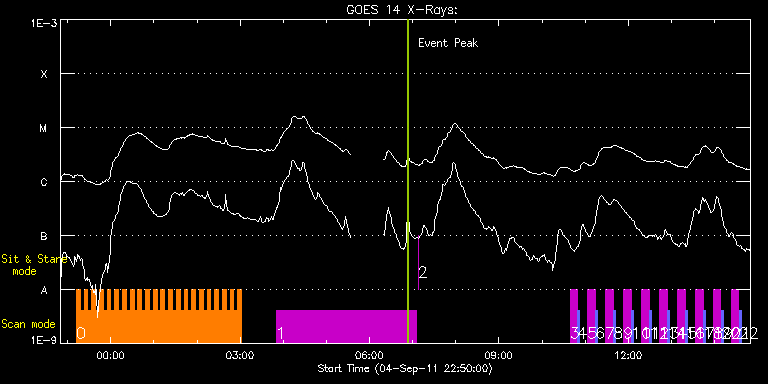 EIS Observation timeline overlay to GOES-Xray curve Code 1" 2" 40" 266" EIS Observations list for this event: STUDY ACRONYM ID DATE OBSERVED DESCRIPTION NOAA# TARGET 0 HH_Flare+AR_180x152 | 24171 | 2011/09/04 23:12:10 | Flare observations | 1283 | Flare TIMELINE ID DATE OBSERVED FITS FILE XCEN (+W/-E) YCEN (+N/-S) DUR ----------------------------------------------------------------------------------------------------------------- 24171 | 2011/09/04 23:12:10.000 | eis_l0_20110904_231210.fits.gz | -245.72 | 133.04 | 5m19s 24171 | 2011/09/04 23:17:32.000 | eis_l0_20110904_231732.fits.gz | -245.02 | 133.12 | 5m18s 24171 | 2011/09/04 23:22:52.000 | eis_l0_20110904_232252.fits.gz | -244.25 | 133.04 | 5m18s 24171 | 2011/09/04 23:28:13.000 | eis_l0_20110904_232813.fits.gz | -243.48 | 133.04 | 5m18s 24171 | 2011/09/04 23:33:34.000 | eis_l0_20110904_233334.fits.gz | -242.63 | 132.96 | 5m18s 24171 | 2011/09/04 23:38:55.000 | eis_l0_20110904_233855.fits.gz | -241.78 | 132.96 | 5m18s 24171 | 2011/09/04 23:44:16.000 | eis_l0_20110904_234416.fits.gz | -241.08 | 132.88 | 5m17s 24171 | 2011/09/04 23:49:36.000 | eis_l0_20110904_234936.fits.gz | -240.31 | 133.04 | 5m18s 24171 | 2011/09/04 23:54:57.000 | eis_l0_20110904_235457.fits.gz | -239.46 | 132.96 | 5m18s 24171 | 2011/09/05 00:00:18.000 | eis_l0_20110905_000018.fits.gz | -238.69 | 132.88 | 5m18s 24171 | 2011/09/05 00:05:39.000 | eis_l0_20110905_000539.fits.gz | -237.84 | 132.88 | 5m18s 24171 | 2011/09/05 00:11:00.000 | eis_l0_20110905_001100.fits.gz | -237.07 | 132.96 | 5m17s 24171 | 2011/09/05 00:16:20.000 | eis_l0_20110905_001620.fits.gz | -236.37 | 132.96 | 5m17s 24171 | 2011/09/05 00:21:40.000 | eis_l0_20110905_002140.fits.gz | -235.52 | 132.96 | 5m17s 24171 | 2011/09/05 00:27:00.000 | eis_l0_20110905_002700.fits.gz | -234.67 | 132.96 | 5m18s 24171 | 2011/09/05 00:32:20.000 | eis_l0_20110905_003220.fits.gz | -233.82 | 132.96 | 5m18s 24171 | 2011/09/05 00:37:40.000 | eis_l0_20110905_003740.fits.gz | -233.13 | 132.88 | 5m18s 24171 | 2011/09/05 00:43:01.000 | eis_l0_20110905_004301.fits.gz | -232.28 | 132.81 | 5m19s 24171 | 2011/09/05 00:48:22.000 | eis_l0_20110905_004822.fits.gz | -231.43 | 132.73 | 5m19s 24171 | 2011/09/05 00:53:43.000 | eis_l0_20110905_005343.fits.gz | -230.73 | 132.73 | 5m18s 24171 | 2011/09/05 00:59:04.000 | eis_l0_20110905_005904.fits.gz | -229.88 | 132.58 | 5m19s 24171 | 2011/09/05 01:04:25.000 | eis_l0_20110905_010425.fits.gz | -229.11 | 132.65 | 5m19s 24171 | 2011/09/05 01:09:47.000 | eis_l0_20110905_010947.fits.gz | -228.34 | 132.65 | 5m18s 24171 | 2011/09/05 01:15:08.000 | eis_l0_20110905_011508.fits.gz | -227.57 | 132.65 | 5m17s 24171 | 2011/09/05 01:20:28.000 | eis_l0_20110905_012028.fits.gz | -226.79 | 132.65 | 5m18s 24171 | 2011/09/05 01:25:49.000 | eis_l0_20110905_012549.fits.gz | -225.87 | 132.65 | 5m18s 24171 | 2011/09/05 01:31:10.000 | eis_l0_20110905_013110.fits.gz | -225.17 | 132.65 | 5m18s 24171 | 2011/09/05 01:36:31.000 | eis_l0_20110905_013631.fits.gz | -224.40 | 132.65 | 5m17s 24171 | 2011/09/05 01:41:51.000 | eis_l0_20110905_014151.fits.gz | -223.63 | 132.58 | 5m17s 24171 | 2011/09/05 01:47:11.000 | eis_l0_20110905_014711.fits.gz | -222.78 | 132.65 | 5m18s 24171 | 2011/09/05 01:52:32.000 | eis_l0_20110905_015232.fits.gz | -222.00 | 132.65 | 5m18s 24171 | 2011/09/05 01:57:53.000 | eis_l0_20110905_015753.fits.gz | -221.23 | 132.65 | 5m18s 24171 | 2011/09/05 02:03:14.000 | eis_l0_20110905_020314.fits.gz | -220.30 | 132.50 | 5m18s 24171 | 2011/09/05 02:08:35.000 | eis_l0_20110905_020835.fits.gz | -219.53 | 132.42 | 5m18s 24171 | 2011/09/05 02:13:56.000 | eis_l0_20110905_021356.fits.gz | -218.76 | 132.58 | 5m18s 24171 | 2011/09/05 02:19:16.000 | eis_l0_20110905_021916.fits.gz | -217.99 | 132.50 | 5m18s 24171 | 2011/09/05 02:24:37.000 | eis_l0_20110905_022437.fits.gz | -217.21 | 132.58 | 5m18s 24171 | 2011/09/05 02:29:58.000 | eis_l0_20110905_022958.fits.gz | -216.36 | 132.42 | 5m18s 24171 | 2011/09/05 02:35:19.000 | eis_l0_20110905_023519.fits.gz | -215.67 | 132.50 | 5m17s 24171 | 2011/09/05 02:40:39.000 | eis_l0_20110905_024039.fits.gz | -214.74 | 132.50 | 5m18s 24171 | 2011/09/05 02:45:59.000 | eis_l0_20110905_024559.fits.gz | -214.05 | 132.42 | 5m19s 24171 | 2011/09/05 02:51:21.000 | eis_l0_20110905_025121.fits.gz | -213.27 | 132.42 | 5m18s 24171 | 2011/09/05 02:56:42.000 | eis_l0_20110905_025642.fits.gz | -212.43 | 132.27 | 5m17s 1 SYNOP006 | 24179 | 2011/09/05 03:49:56 | Intensity measurements - Sun Centre | | Quiet Sun TIMELINE ID DATE OBSERVED FITS FILE XCEN (+W/-E) YCEN (+N/-S) DUR ----------------------------------------------------------------------------------------------------------------- 24179 | 2011/09/05 03:49:56.000 | eis_l0_20110905_034956.fits.gz | -0.10 | -0.42 | 3h15m35s 2 regcal076 | 24181 | 2011/09/05 07:07:47 | Flatfield, 1 exposure, led 100ms, ccd | | Engineering TIMELINE ID DATE OBSERVED FITS FILE XCEN (+W/-E) YCEN (+N/-S) DUR ----------------------------------------------------------------------------------------------------------------- 24181 | 2011/09/05 07:07:47.000 | eis_l0_20110905_070747.fits.gz | 14.43 | -50.35 | 1s 3 SK_DEEP_5x512_SLIT1 | 24125 | 2011/09/05 10:39:10 | Synoptic SOT Irradiance Scans - Berger | | Quiet Sun TIMELINE ID DATE OBSERVED FITS FILE XCEN (+W/-E) YCEN (+N/-S) DUR ----------------------------------------------------------------------------------------------------------------- 24125 | 2011/09/05 10:39:10.000 | eis_l0_20110905_103910.fits.gz | -0.10 | -945.47 | 10m8s 4 PRY_slot_contextLITE | 24126 | 2011/09/05 10:49:43 | Synoptic SOT Irradiance Scans - Berger | | Active Region TIMELINE ID DATE OBSERVED FITS FILE XCEN (+W/-E) YCEN (+N/-S) DUR ----------------------------------------------------------------------------------------------------------------- 24126 | 2011/09/05 10:49:43.000 | eis_l0_20110905_104943.fits.gz | -15.32 | -945.55 | 2m57s 5 SK_DEEP_5x512_SLIT1 | 24127 | 2011/09/05 11:03:50 | Synoptic SOT Irradiance Scans - Berger | | Quiet Sun TIMELINE ID