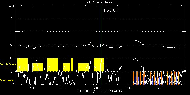 EIS Observation timeline overlay to GOES-Xray curve Code 1" 2" 40" 266" EIS Observations list for this event: STUDY ACRONYM ID DATE OBSERVED DESCRIPTION NOAA# TARGET 0 FLARE266_TEST1 | 24244 | 2011/09/11 19:38:13 | Flare Hunter | 1283 | Active Region TIMELINE ID DATE OBSERVED FITS FILE XCEN (+W/-E) YCEN (+N/-S) DUR ----------------------------------------------------------------------------------------------------------------- 24244 | 2011/09/11 19:38:13.000 | eis_l0_20110911_193813.fits.gz | 770.30 | 198.64 | 56m47s 1 FLARE266_TEST1 | 24245 | 2011/09/11 21:03:12 | Flare Hunter | 1283 | Active Region TIMELINE ID DATE OBSERVED FITS FILE XCEN (+W/-E) YCEN (+N/-S) DUR ----------------------------------------------------------------------------------------------------------------- 24245 | 2011/09/11 21:03:12.000 | eis_l0_20110911_210312.fits.gz | 770.38 | 198.57 | 56m48s 2 FLARE266_TEST1 | 24246 | 2011/09/11 22:28:13 | Flare Hunter | 1283 | Active Region TIMELINE ID DATE OBSERVED FITS FILE XCEN (+W/-E) YCEN (+N/-S) DUR ----------------------------------------------------------------------------------------------------------------- 24246 | 2011/09/11 22:28:13.000 | eis_l0_20110911_222813.fits.gz | 770.30 | 198.57 | 56m47s 3 FLARE266_TEST1 | 24247 | 2011/09/11 23:54:12 | Flare Hunter | 1283 | Active Region TIMELINE ID DATE OBSERVED FITS FILE XCEN (+W/-E) YCEN (+N/-S) DUR ----------------------------------------------------------------------------------------------------------------- 24247 | 2011/09/11 23:54:12.000 | eis_l0_20110911_235412.fits.gz | 770.30 | 198.72 | 39m30s 24247 | 2011/09/12 00:36:30.000 | eis_l0_20110912_003630.fits.gz | 770.30 | 198.64 | 14m30s 4 FLARE266_TEST1 | 24248 | 2011/09/12 01:20:12 | Flare Hunter | | Active Region TIMELINE ID DATE OBSERVED FITS FILE XCEN (+W/-E) YCEN (+N/-S) DUR ----------------------------------------------------------------------------------------------------------------- 24248 | 2011/09/12 01:20:12.000 | eis_l0_20110912_012012.fits.gz | 770.38 | 198.64 | 56m48s 5 FLARE266_TEST1 | 24249 | 2011/09/12 02:46:12 | Flare Hunter | | Active Region TIMELINE ID DATE OBSERVED FITS FILE XCEN (+W/-E) YCEN (+N/-S) DUR ----------------------------------------------------------------------------------------------------------------- 24249 | 2011/09/12 02:46:12.000 | eis_l0_20110912_024612.fits.gz | 770.30 | 198.57 | 56m48s 6 SK_DEEP_10x512_SLIT2 | 24203 | 2011/09/12 06:27:19 | HOP 79: SOT Irradiance Scan (E-W) | | Quiet Sun TIMELINE ID DATE OBSERVED FITS FILE XCEN (+W/-E) YCEN (+N/-S) DUR ----------------------------------------------------------------------------------------------------------------- 24203 | 2011/09/12 06:27:19.000 | eis_l0_20110912_062719.fits.gz | -9869.95 | -9963.20 | 5m7s 7 PRY_slot_contextLITE | 24204 | 2011/09/12 06:37:19 | HOP 79: SOT Irradiance Scan (E-W) | 1292 | Active Region TIMELINE ID DATE OBSERVED FITS FILE XCEN (+W/-E) YCEN (+N/-S) DUR ----------------------------------------------------------------------------------------------------------------- 24204 | 2011/09/12 06:37:19.000 | eis_l0_20110912_063719.fits.gz | -710.29 | -20.51 | 2m56s 8 SK_DEEP_10x512_SLIT2 | 24205 | 2011/09/12 06:47:32 | HOP 79: SOT Irradiance Scan (E-W) | | Quiet Sun TIMELINE ID DATE OBSERVED FITS FILE XCEN (+W/-E) YCEN (+N/-S) DUR ----------------------------------------------------------------------------------------------------------------- 24205 | 2011/09/12 06:47:32.000 | eis_l0_20110912_064732.fits.gz | -496.56 | -20.58 | 5m8s 9 PRY_slot_contextLITE | 24206 | 2011/09/12 06:57:19 | HOP 79: SOT Irradiance Scan (E-W) | | Active Region TIMELINE ID DATE OBSERVED FITS FILE XCEN (+W/-E) YCEN (+N/-S) DUR ----------------------------------------------------------------------------------------------------------------- 24206 | 2011/09/12 06:57:19.000 | eis_l0_20110912_065719.fits.gz | -312.15 | -20.58 | 2m56s 10 SK_DEEP_10x512_SLIT2 | 24207 | 2011/09/12 07:07:32 | HOP 79: SOT Irradiance Scan (E-W) | | Quiet Sun TIMELINE ID DATE OBSERVED FITS FILE XCEN (+W/-E) YCEN (+N/-S) DUR ----------------------------------------------------------------------------------------------------------------- 24207 | 2011/09/12 07:07:32.000 | eis_l0_20110912_070732.fits.gz | -98.35 | -20.66 | 5m8s 11 PRY_slot_contextLITE | 24208 | 2011/09/12 07:17:19 | HOP 79: SOT Irradiance Scan (E-W) | 1293 | Active Region TIMELINE ID DATE OBSERVED FITS FILE XCEN (+W/-E) YCEN (+N/-S) DUR ----------------------------------------------------------------------------------------------------------------- 24208 | 2011/09/12 07:17:19.000 | eis_l0_20110912_071719.fits.gz | 85.98 | -20.51 | 2m56s 12 SK_DEEP_10x512_SLIT2 | 24209 | 2011/09/12 07:28:01 | HOP 79: SOT Irradiance Scan (E-W) | | Quiet Sun TIMELINE ID DATE OBSERVED FITS FILE XCEN (+W/-E) YCEN (+N/-S) DUR ----------------------------------------------------------------------------------------------------------------- 24209 | 2011/09/12 07:28:01.000 | eis_l0_20110912_072801.fits.gz | 299.33 | -20.51 | 5m8s 13 PRY_slot_contextLITE | 24210 | 2011/09/12 07:33:35 | HOP 79: SOT Irradiance Scan (E-W) | 1293 | Active Region TIMELINE ID DATE OBSERVED FITS FILE XCEN (+W/-E) YCEN (+N/-S) DUR ----------------------------------------------------------------------------------------------------------------- 24210 | 2011/09/12 07:33:35.000 | eis_l0_20110912_073335.fits.gz | 284.66 | -20.74 | 2m56s 14 SK_DEEP_10x512_SLIT2 | 24211 | 2011/09/12 08:04:32 | HOP 79: SOT Irradiance Scan (E-W) | | Quiet Sun TIMELINE ID DATE OBSERVED FITS FILE XCEN (+W/-E) YCEN (+N/-S) DUR ----------------------------------------------------------------------------------------------------------------- 24211 | 2011/09/12 08:04:32.000 | eis_l0_20110912_080432.fits.gz | 498.47 | -20.58 | 5m8s 15 PRY_slot_contextLITE | 24212 | 2011/09/12 08:14:19 | HOP 79: SOT Irradiance Scan (E-W) | | Active Region TIMELINE ID DATE OBSERVED FITS FILE XCEN (+W/-E) YCEN (+N/-S) DUR ---------------------------------