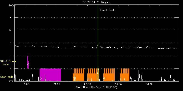 EIS Observation timeline overlay to GOES-Xray curve Code 1" 2" 40" 266" EIS Observations list for this event: STUDY ACRONYM ID DATE OBSERVED DESCRIPTION NOAA# TARGET 0 regcal071 | 24700 | 2011/10/26 18:08:11 | Dark exposures, CCD bottom rows (100s | | Engineering TIMELINE ID DATE OBSERVED FITS FILE XCEN (+W/-E) YCEN (+N/-S) DUR ----------------------------------------------------------------------------------------------------------------- 24700 | 2011/10/26 18:08:11.000 | eis_l0_20111026_180811.fits.gz | -240.10 | -296.77 | 3m22s 1 regcal072 | 24701 | 2011/10/26 18:12:00 | Dark exposures, top CCD rows (100s exp | | Engineering TIMELINE ID DATE OBSERVED FITS FILE XCEN (+W/-E) YCEN (+N/-S) DUR ----------------------------------------------------------------------------------------------------------------- 24701 | 2011/10/26 18:12:00.000 | eis_l0_20111026_181200.fits.gz | -239.48 | 214.31 | 3m22s 2 HPW021_VEL_240x512v1 | 24743 | 2011/10/26 19:20:40 | Active Region Studies - Velocity Study | 1330 | Active Region TIMELINE ID DATE OBSERVED FITS FILE XCEN (+W/-E) YCEN (+N/-S) DUR ----------------------------------------------------------------------------------------------------------------- 24743 | 2011/10/26 19:20:40.000 | eis_l0_20111026_192040.fits.gz | -243.88 | 8.07 | 2h3m47s 3 IUU_SCAN_STEPS_002 | 24744 | 2011/10/26 22:33:26 | Active Region Studies - Dynamics | | Active Region TIMELINE ID DATE OBSERVED FITS FILE XCEN (+W/-E) YCEN (+N/-S) DUR ----------------------------------------------------------------------------------------------------------------- 24744 | 2011/10/26 22:33:26.000 | eis_l0_20111026_223326.fits.gz | -216.07 | 7.69 | 5m23s 24744 | 2011/10/26 22:38:52.000 | eis_l0_20111026_223852.fits.gz | -215.22 | 7.69 | 5m24s 24744 | 2011/10/26 22:44:19.000 | eis_l0_20111026_224419.fits.gz | -214.37 | 7.77 | 5m24s 24744 | 2011/10/26 22:49:46.000 | eis_l0_20111026_224946.fits.gz | -213.59 | 7.77 | 5m23s 24744 | 2011/10/26 22:55:13.000 | eis_l0_20111026_225513.fits.gz | -212.74 | 7.69 | 5m23s 24744 | 2011/10/26 23:00:39.000 | eis_l0_20111026_230039.fits.gz | -211.89 | 7.77 | 5m24s 24744 | 2011/10/26 23:06:06.000 | eis_l0_20111026_230606.fits.gz | -211.04 | 7.69 | 5m24s 24744 | 2011/10/26 23:11:33.000 | eis_l0_20111026_231133.fits.gz | -210.27 | 7.77 | 5m23s 24744 | 2011/10/26 23:16:59.000 | eis_l0_20111026_231659.fits.gz | -209.35 | 7.69 | 5m24s 24744 | 2011/10/26 23:22:26.000 | eis_l0_20111026_232226.fits.gz | -208.57 | 7.61 | 5m23s 24744 | 2011/10/26 23:27:53.000 | eis_l0_20111026_232753.fits.gz | -207.72 | 7.69 | 5m23s 24744 | 2011/10/26 23:33:20.000 | eis_l0_20111026_233320.fits.gz | -206.95 | 7.69 | 5m23s 4 IUU_SCAN_STEPS_002 | 24745 | 2011/10/26 23:59:12 | Active Region Studies - Dynamics | | Active Region TIMELINE ID DATE OBSERVED FITS FILE XCEN (+W/-E) YCEN (+N/-S) DUR ----------------------------------------------------------------------------------------------------------------- 24745 | 2011/10/26 23:59:12.000 | eis_l0_20111026_235912.fits.gz | -203.01 | 7.77 | 5m24s 24745 | 2011/10/27 00:04:39.000 | eis_l0_20111027_000439.fits.gz | -202.16 | 7.61 | 5m23s 24745 | 2011/10/27 00:10:06.000 | eis_l0_20111027_001006.fits.gz | -201.31 | 7.61 | 5m23s 24745 | 2011/10/27 00:15:32.000 | eis_l0_20111027_001532.fits.gz | -200.54 | 7.61 | 5m24s 24745 | 2011/10/27 00:20:59.000 | eis_l0_20111027_002059.fits.gz | -199.61 | 7.61 | 5m23s 24745 | 2011/10/27 00:26:26.000 | eis_l0_20111027_002626.fits.gz | -198.84 | 7.53 | 5m23s 24745 | 2011/10/27 00:31:53.000 | eis_l0_20111027_003153.fits.gz | -198.07 | 7.53 | 5m23s 24745 | 2011/10/27 00:37:19.000 | eis_l0_20111027_003719.fits.gz | -197.14 | 7.53 | 5m24s 24745 | 2011/10/27 00:42:46.000 | eis_l0_20111027_004246.fits.gz | -196.29 | 7.46 | 5m23s 24745 | 2011/10/27 00:48:13.000 | eis_l0_20111027_004813.fits.gz | -195.52 | 7.61 | 5m23s 24745 | 2011/10/27 00:53:40.000 | eis_l0_20111027_005340.fits.gz | -194.74 | 7.38 | 5m23s 24745 | 2011/10/27 00:59:06.000 | eis_l0_20111027_005906.fits.gz | -193.90 | 7.46 | 5m24s 5 IUU_SCAN_STEPS_002 | 24746 | 2011/10/27 01:31:42 | Active Region Studies - Dynamics | 1333 | Active Region TIMELINE ID DATE OBSERVED FITS FILE XCEN (+W/-E) YCEN (+N/-S) DUR ----------------------------------------------------------------------------------------------------------------- 24746 | 2011/10/27 01:31:42.000 | eis_l0_20111027_013142.fits.gz | -188.88 | 7.53 | 5m24s 24746 | 2011/10/27 01:37:09.000 | eis_l0_20111027_013709.fits.gz | -188.02 | 7.53 | 5m23s 24746 | 2011/10/27 01:42:36.000 | eis_l0_20111027_014236.fits.gz | -187.18 | 7.46 | 5m23s 24746 | 2011/10/27 01:48:03.000 | eis_l0_20111027_014803.fits.gz | -186.32 | 7.46 | 5m23s 24746 | 2011/10/27 01:53:29.000 | eis_l0_20111027_015329.fits.gz | -185.55 | 7.46 | 5m23s 24746 | 2011/10/27 01:58:56.000 | eis_l0_20111027_015856.fits.gz | -184.70 | 7.38 | 5m23s 24746 | 2011/10/27 02:04:23.000 | eis_l0_20111027_020423.fits.gz | -183.85 | 7.53 | 5m23s 24746 | 2011/10/27 02:09:50.000 | eis_l0_20111027_020950.fits.gz | -183.00 | 7.38 | 5m23s 24746 | 2011/10/27 02:15:16.000 | eis_l0_20111027_021516.fits.gz | -182.15 | 7.46 | 5m24s 24746 | 2011/10/27 02:20:43.000 | eis_l0_20111027_022043.fits.gz | -181.23 | 7.30 | 5m24s 24746 | 2011/10/27 02:26:10.000 | eis_l0_20111027_022610.fits.gz | -180.53 | 7.30 | 5m23s 24746 | 2011/10/27 02:31:36.000 | eis_l0_20111027_023136.fits.gz | -179.60 | 7.30 | 5m24s 6 IUU_SCAN_STEPS_002 | 24747 | 2011/10/27 03:09:09 | Active Region Studies - Dynamics | 1333 | Active Region TIMELINE ID DATE OBSERVED FITS FILE XCEN (+W/-E) YCEN (+N/-S) DUR ----------------------------------------------------------------------------------------------------------------- 24747 | 2011/10/27 03:09:09.000 | eis_l0_20111027_030909.fits.gz | -173.89 | 7.38 | 5m24s 24747 | 2011/10/27 03:14:36.000 | eis_l0_20111027_031436.fits.gz | -173.04 | 7.46 | 5m24s 24747 | 2011/10/27 03:20:03.000 | eis_l0_20111027_032003.fits.gz | -172.27 | 7.38 | 5m23s 24747 | 2011/10/27 03:25:29.000 | eis_l0_201110